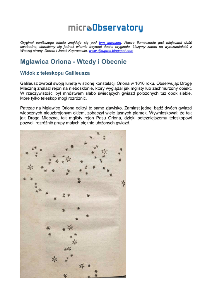 Oryginał poniższego tekstu znajduje się pod tym adresem. Nasze tłumaczenie jest miejscami dość swobodne, staraliśmy się jednak wiernie trzymać ducha oryginału. Liczymy zatem na wyrozumiałość z Waszej strony. Dorota i Jacek Kuprasowie. www.djkupras.blogspot.com Mgławica Oriona - Wtedy i Obecnie Widok z teleskopu Galileusza Galileusz zwrócił swoją lunetę w stronę konstelacji Oriona w 1610 roku. Obserwując Drogę Mleczną znalazł rejon na nieboskłonie, który wyglądał jak mglisty lub zachmurzony obiekt. W rzeczywistości był mnóstwem słabo świecących gwiazd położonych tuż obok siebie, które tylko teleskop mógł rozróżnić. Patrząc na Mgławicę Oriona odkrył to samo zjawisko. Zamiast jednej bądź dwóch gwiazd widocznych nieuzbrojonym okiem, zobaczył wiele jasnych plamek. Wywnioskował, że tak jak Droga Mleczna, tak mglisty rejon Pasu Oriona, dzięki potężniejszemu teleskopowi pozwoli rozróżnić grupy małych pięknie ułożonych gwiazd. Powyżej: Oryginał szkicu Galileusza przedstawiający trzy gwiazdy w Pasie Oriona oraz Mgławicę Oriona (źródło: Octavo Corp./Warnock Library) Co dostrzegłeś przy pomocy MicroObservatory? Na tle ciemnego nieba Mgławica Oriona dla nieuzbrojonego oka widoczna jest jako migocząca gwiazda. Czy Mgławica pojawia się na zdjęciach wykonanych za pomocą Mikroobserwatorium? Czy wygląda jak mgiełka czy chmura, czy może Mikroobserwatorium rozróżnia mnóstwo gwiazd? Czy może jest mieszaniną obu? By zobaczyć zdjęcie Oriona, możesz otworzyć je w programie MicroObservatory image processing software. Powyżej: Archiwalna Mikroobsarwatorium fotografia Mgławicy Oriona wykonana przy użyciu Mgławica Oriona - 400 lat później Wnioskowanie Galileusza, iż „mleczna” Mgławica Oriona złożona z gwiazd może zostać zobaczona przez dobry czy też wystarczająco dobry teleskop, nie było wcale przypadkiem. Mgławica ta faktycznie jest rozległym obłokiem gazów i pyłów, które są budulcem dla następnej generacji gwiazd w naszej galaktyce. Mgławica Oriona nie jest jedynym rejonem w galaktyce gdzie formują się gwiazdy, jest natomiast obszarem nam najbliższym. Dzięki sile grawitacji znajdujące się tam kłaczki gazów miejscami zbijają się, co raz bardziej tworząc stopniowo kule. Gęstość i temperatura tych kul stopniowo wzrastają i stają się w końcu tak wysokie, że zostają zainicjowane reakcje jądrowe dające początek nowym gwiazdom. W Mgławicy Oriona rodzą się ich tysiące. Ich intensywne światło oraz wiatry gwiazdowe (strumienie naładowanych cząstek) powodują formowanie się pozostałego pyłu i gazu na kształt jak gdyby kokonu. Dzięki obserwacjom zjawisk w Mgławicy Oriona mamy, zatem możliwość śledzenia procesu powstawania gwiazd. Nasze Słońce zostało utworzone przez obłok podobny do Mgławicy Oriona pięć miliardów lat temu. Poniżej: fotografia Mgławicy Oriona wykonana w podczerwieni przy pomocy Teleskopu Spitzer’a (źródło: NASA/JPL-Caltech/T. Megeath) Ponieważ podczerwiań o wiele lepiej przenika przez gęste chmury pyłu i gazu, obserwacje w tym paśmie umożliwiają nam wejrzenie w samo serce gwiazdotwórczego rejonu jakim jest Mgławica Oriona. W tym obrazie, ciemne regiony nie są pustą przestrzenią, ale chmurami pyłu, które zatrzymują światło gwiazd znajdujących się za nim. Czerwony blask widoczny na zdjęciu to wodór, który jest podgrzewany przez intensywne ultrafioletowe światło nowonarodzonych gwiazd. Nie tylko w Mgławicy Oriona tworzą się nowe gwiazdy. Wiele nowych gwiazd jest otoczonych dyskami pyłu i gazu. Materiał tego dysku może się zagęścić i utworzyć przez następne miliardy lat planety bądź brązowe karły. Najprawdopodobniej w gigantycznych globulach gazu i pyłu, zwanych Proplydami, powstaną nowe układy słoneczne. Powyżej Proplydy - przyszłe Układy Słoneczne - utworzone wewnątrz Mgławicy Oriona ( źródło: NASA/STScI) Z biegiem czasu, gdy nowopowstałe w Mgławicy Oriona gwiazdy wydmuchają w przestrzeń resztki mgławicowego gazu, powstanie z nich gromada przypominająca wyglądem Plejady lub Ul, które badał Galileusz. Jeśli chcesz wykonać ich zdjęcie przy pomocy Mikroobserwatorium, możesz wrócić do Galileo activity. Dowiedz się więcej: Rok 2009 został ogłoszony Międzynarodowym Rokiem Astronomii aby uczcić czterysetną rocznicę odkryć dokonanych przez Galileusza. Dowiedz się więcej na ten temat, odwiedzając następujące strony: Główna strona obchodów Międzynarodowego Roku Astronomii 2009 (ang). Międzynarodowy Rok Astronomii 2009 w Polsce. Strona NASA Międzynarodowego Roku Astronomii 2009 (ang.). By zobaczyć widok Mgławicy Oriona zrobiony przy pomocy teleskopu Hubble’a odwiedź stronę: http://hubblesite.org/newscenter/archive/releases/nebula/2006/01/ Tutaj znajdują się pozostałe teksty poświęcone odkryciom Galileusza. Zobacz, jak zmieniło się nasze postrzeganie Wszechświata na przestrzeni ostatnich 400 lat. Zapraszam także do odwiedzenia strony: www.djkupras.blogspot.com i zapoznania się z mitem o Orionie: http://djkupras.blogspot.com/2008/02/mity-sigaj-gwiazd.html http://djkupras.blogspot.com/2008/02/mity-sigaj-gwiazd-orion-2.html
