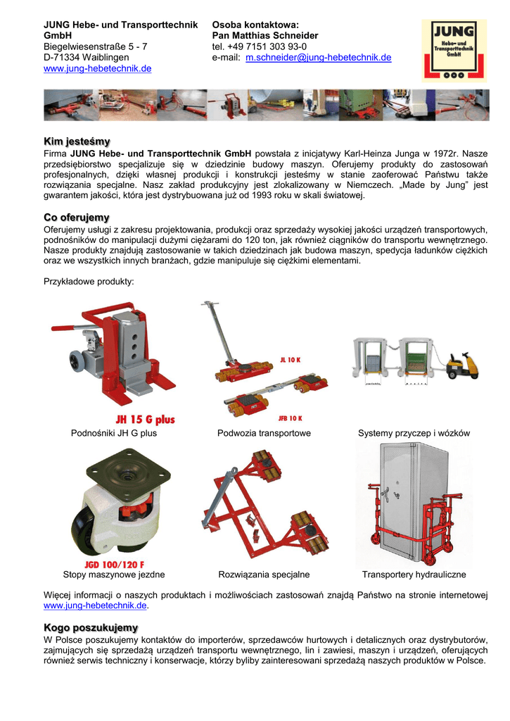 JUNG Hebe- und Transporttechnik GmbH Biegelwiesenstraße 5 - 7 D-71334 Waiblingen www.jung-hebetechnik.de Osoba kontaktowa: Pan Matthias Schneider tel. +49 7151 303 93-0 e-mail: [email protected] Kim jesteśmy Firma JUNG Hebe- und Transporttechnik GmbH powstała z inicjatywy Karl-Heinza Junga w 1972r. Nasze przedsiębiorstwo specjalizuje się w dziedzinie budowy maszyn. Oferujemy produkty do zastosowań profesjonalnych, dzięki własnej produkcji i konstrukcji jesteśmy w stanie zaoferować Państwu także rozwiązania specjalne. Nasz zakład produkcyjny jest zlokalizowany w Niemczech. „Made by Jung” jest gwarantem jakości, która jest dystrybuowana już od 1993 roku w skali światowej. Co oferujemy Oferujemy usługi z zakresu projektowania, produkcji oraz sprzedaży wysokiej jakości urządzeń transportowych, podnośników do manipulacji dużymi ciężarami do 120 ton, jak również ciągników do transportu wewnętrznego. Nasze produkty znajdują zastosowanie w takich dziedzinach jak budowa maszyn, spedycja ładunków ciężkich oraz we wszystkich innych branżach, gdzie manipuluje się ciężkimi elementami. Przykładowe produkty: Podnośniki JH G plus Podwozia transportowe Systemy przyczep i wózków Stopy maszynowe jezdne Rozwiązania specjalne Transportery hydrauliczne Więcej informacji o naszych produktach i możliwościach zastosowań znajdą Państwo na stronie internetowej www.jung-hebetechnik.de. Kogo poszukujemy W Polsce poszukujemy kontaktów do importerów, sprzedawców hurtowych i detalicznych oraz dystrybutorów, zajmujących się sprzedażą urządzeń transportu wewnętrznego, lin i zawiesi, maszyn i urządzeń, oferujących również serwis techniczny i konserwacje, którzy byliby zainteresowani sprzedażą naszych produktów w Polsce.