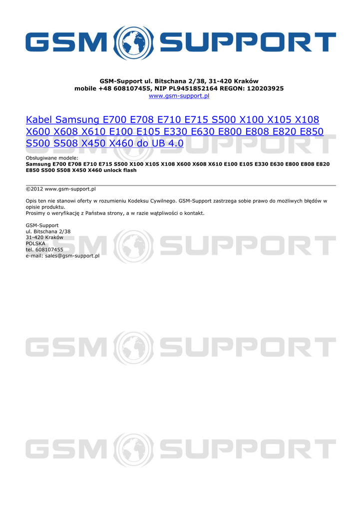 GSM-Support ul. Bitschana 2/38, 31-420 Kraków mobile +48 608107455, NIP PL9451852164 REGON: 120203925 www.gsm-support.pl Kabel Samsung E700 E708 E710 E715 S500 X100 X105 X108 X600 X608 X610 E100 E105 E330 E630 E800 E808 E820 E850 S500 S508 X450 X460 do UB 4.0 Obsługiwane modele: Samsung E700 E708 E710 E715 S500 X100 X105 X108 X600 X608 X610 E100 E105 E330 E630 E800 E808 E820 E850 S500 S508 X450 X460 unlock flash ©2012 www.gsm-support.pl Opis ten nie stanowi oferty w rozumieniu Kodeksu Cywilnego. GSM-Support zastrzega sobie prawo do możliwych błędów w opisie produktu. Prosimy o weryfikację z Państwa strony, a w razie wątpliwości o kontakt. GSM-Support ul. Bitschana 2/38 31-420 Kraków POLSKA tel. 608107455 e-mail: [email protected] Powered by TCPDF (www.tcpdf.org)