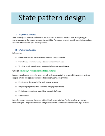 State pattern design 1. Wprowadzenie: State pattern(dosł. Wzorzec zachowania) jest wzorcem zachowania obiektu. Wzorzec używany jest w programowaniu do reprezentowania stanu obiektu. Pozwala on w prosty sposób na częściową zmianę stanu obiektu w trakcie życia instancji obiektu. 2. Wykorzystanie: Załóżmy, że: • Obiekt znajduje się zawsze w jednym z wielu znanych stanów • Stan obiektu determinowany jest zachowaniem kilku metod • W każdej z tych metod można użyć wyrażeń warunkowych if/case Wniosek : Najlepszym rozwiązaniem jest State Pattern ! Podczas modelowania systemów rzeczywistych możemy zauważyć, że pewne obiekty naszego systemu dążą do zmiany swojego stanu w tracie działania programu. Na przykład: • Po zderzeniu się samochodów staja się one wrakami • Przyjaciel jest jednego dnia szczęśliwy innego przygnębiony • Po dodaniu elementu do pustej listy, przestaje być pusta • I wiele innych Samochodem po zderzeniu nie można już jeździć, ale wrak nadal jest fundamentalnie tym samym obiektem, tylko z innym zachowaniem. Przyjaciel pozostaje człowiekiem niezależnie od jego humoru. 3. Model logiczny: Context - klasa, która może posiadać różne stany State - definiuje wspólny interfejs dla wszystkich stanów, dzięki temu są wymienne. ConcreteState - definiuje konkretną definicję stanu. Działanie wzorca jest bardzo proste. Wywołując metodę Handle(), wykorzystywana jest odpowiednia implementacja stanu. Patrząc na powyższy diagram, można odnieść wrażenie, że definicja wzorca jest praktycznie taka sama jak w przypadku wzorca Strategy. Jest jednak mała różnica między tymi dwoma wzorcami: State Pattern: • zbiór zachować opakowanych klasami • w danym momencie klasa odnosi się do jednego z tych stanów • klient nie zna aktualnego (lub bardzo mało wie) stanu obiektu - nie definiuje go jawnie Strategy Pattern: • klient sam definiuje obiekt strategii, który jest wykorzystywany w operacji Możemy także podejść do tego od innej strony: Mówiąc Strategy Pattern myślmy o zastępstwie dla dziedziczenia. Mówiąc State Pattern myślmy o instrukcji if/switch w naszej klasie i wielu sprawdzanych warunkach. 4. Przykład: Przykładem będzie reprezentacja zmiany nastroju człowieka: Człowiek normalnie jest w koszmarnym humorze, uszczęśliwiamy go upajając go procentowymi trunkami. Wysokość promili wyznacza nastrój człowieka