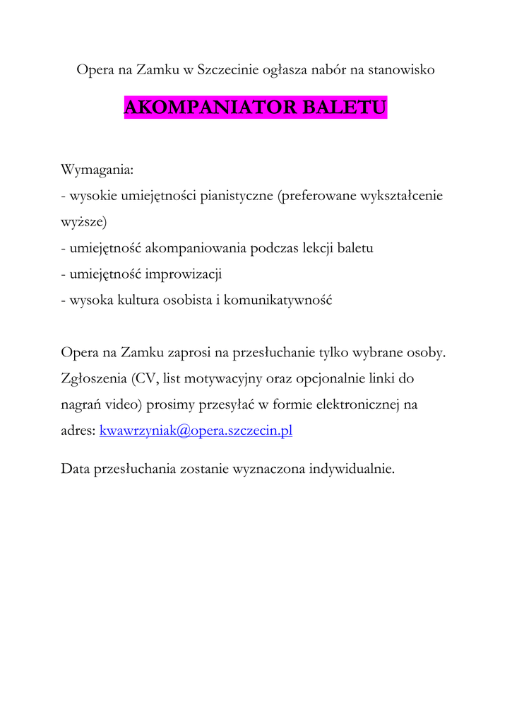 Opera na Zamku w Szczecinie ogłasza nabór na stanowisko AKOMPANIATOR BALETU Wymagania: - wysokie umiejętności pianistyczne (preferowane wykształcenie wyższe) - umiejętność akompaniowania podczas lekcji baletu - umiejętność improwizacji - wysoka kultura osobista i komunikatywność Opera na Zamku zaprosi na przesłuchanie tylko wybrane osoby. Zgłoszenia (CV, list motywacyjny oraz opcjonalnie linki do nagrań video) prosimy przesyłać w formie elektronicznej na adres: [email protected] Data przesłuchania zostanie wyznaczona indywidualnie.