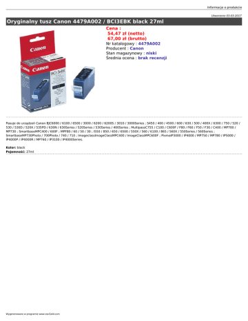 Informacje o produkcie Utworzono 03-03-2017 Oryginalny tusz Canon 4479A002 / BCI3EBK black 27ml Cena : 54,47 zł (netto) 67,00 zł (brutto) Nr katalogowy : 4479A002 Producent : Canon Stan magazynowy : niski Średnia ocena : brak recenzji Pasuje do urządzeń Canon BJC6000 / 6100 / 6500 / 3000 / 6200 / 6200S / 3010 / 3000Series ; S450 / 400 / 4500 / 600 / 630 / 500 / 400X / 6300 / 750 / 520 / 530 / 530D / 520X / 535PD / 630N / 630Series / 520Series / 530Series / 400Series ; MultipassC755 / C100 / C600F / F80 / F60 / F50 / F30 / C400 / MP700 / MP730 ; SmartbaseMPC400 / 600F ; MPF80 / 60 / 50 / 30 ; I550 / 850 / 650 / 6500 / 550X / 560 / 6100 / 865 / 560X / 550Series / 560Series ; SmartbaseMP730Photo / 700Photo / 740 / 710 ; ImageclassImageClassMPC400 / ImageClassMPC600F ; PixmaIP3000 / IP4000 / MP750 / MP780 / IP5000 / IP4000P / IP4000R / MP760 / IP3100 / IP4000Series. Kolor: black Pojemność: 27ml Wygenerowano w programie www.oscGold.com