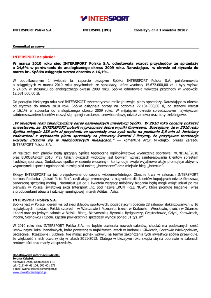 INTERSPORT Polska S.A. INTERSPPL (IPO) Cholerzyn, dnia 1 kwietnia 2010 r. Komunikat prasowy INTERSPORT na plusie ! W marcu 2010 roku sieć INTERSPORT Polska S.A. odnotowała wzrost przychodów ze sprzedaży o 24,6% w porównaniu do analogicznego okresu 2009 roku. Narastająco, w okresie od stycznia do marca br., Spółka osiągnęła wzrost obrotów o 16,1%. W opublikowanym 1 kwietnia br. raporcie bieżącym Spółka INTERSPORT Polska S.A. poinformowała o osiągniętych w marcu 2010 roku przychodach ze sprzedaży, które wyniosły 15.672.000,00 zł. i były wyższe o 24,6% w stosunku do analogicznego okresu 2009 roku. Spółka odnotowała wówczas przychody w wysokości 12.581.000,00 zł. Od początku bieżącego roku sieć INTERSPORT systematycznie realizuje swoje plany sprzedaży. Narastająco w okresie od stycznia do marca 2010 roku Spółka osiągnęła obroty na poziomie 77.184.000,00 zł, co stanowi wzrost o 16,1% w stosunku do analogicznego okresu 2009 roku. W mijającym okresie sprzedażowym największym zainteresowaniem klientów cieszył się sprzęt narciarsko-snowboardowy, odzież zimowa oraz buty trekkingowe. „W ubiegłym roku zakończyliśmy okres największych inwestycji Spółki. W 2010 roku chcemy pokazać inwestorom, że INTERSPORT potrafi wypracować dobre wyniki finansowe. Szacujemy, że w 2010 roku Spółka osiągnie 238 mln zł przychodu ze sprzedaży oraz zysk netto na poziomie 3,8 mln zł. Jesteśmy zadowoleni z wykonania planu sprzedaży za pierwszy kwartał i liczymy, że pozytywna tendencja wzrostu utrzyma się w nadchodzących miesiącach.” –– komentuje Artur Mikołajko, prezes Zarządu INTERSPORT Polska S.A. W realizacji tych planów będą sprzyjały Spółce tegoroczne ogólnoświatowe wydarzenia sportowe: MUNDIAL`2010 oraz EUROBASKET`2010. Przy takich okazjach widoczny jest bowiem wzrost zainteresowania klientów sprzętem i odzieżą sportową. Dodatkowo spółka w sezonie wiosennym kontynuuje swoje wyjątkowe akcje promujące aktywny wypoczynek i sport : ogólnopolski turniej piłki nożnej „intersoccer” oraz miejskie biegi „interrun”. Sklepy INTERSPORT są już przygotowane do sezonu wiosenno-letniego. Obecnie trwa w salonach INTERSPORT konkurs Reeboka „Jukari fit to flex”, czyli akcja promocyjna z nagrodami dla klientów kupujących odzież fitnesową oznaczoną specjalną metką. Natomiast już od 1 kwietnia wszyscy miłośnicy biegania będą mogli wziąć udział po raz pierwszy w Polsce, światowej akcji Intersport Int. pod nazwą „RUN FREE NOW”, która promuje bieganie wraz z producentami obuwia i odzieży runningowej marek Adidas i Asics. INTERSPORT Polska S.A. Spółka jest w Polsce liderem wśród sieci sklepów sportowych, posiadającym obecnie 28 salonów zlokalizowanych w 16 największych miastach Polski: czterech w Warszawie i Poznaniu, trzech w Krakowie i Wrocławiu, dwóch w Gdańsku i Łodzi oraz po jednym salonie w Bielsku-Białej, Białymstoku, Bytomiu, Bydgoszczy, Częstochowie, Gdyni, Katowicach, Płocku, Sosnowcu i Opolu. Łączna powierzchnia sprzedaży wynosi ponad 31 tys. m2. W 2010 roku sieć INTERSPORT Polska S.A. nie będzie otwierała nowych salonów, chociaż ma podpisanych sześć umów najmu lokali handlowych, które powstaną w najbliższych latach w Radomiu, Gliwicach, Gorzowie Wielkopolskim, Szczecinie, Rzeszowie i Lublinie. Nie mając jednak wpływu na termin zakończenia tych inwestycji spółka przewiduje, że większość z nich otworzy się w latach 2011-2012. Dlatego w bieżącym roku skupia się na poprawie w salonach rentowności oraz marży ze sprzedaży. Dodatkowych informacji udziela: Iwona Książek Kierownik Działu Komunikacji i RI tel. (012) 44 48 104, 600 401 271 e-mail: [email protected] www.inwestor.intersport.pl