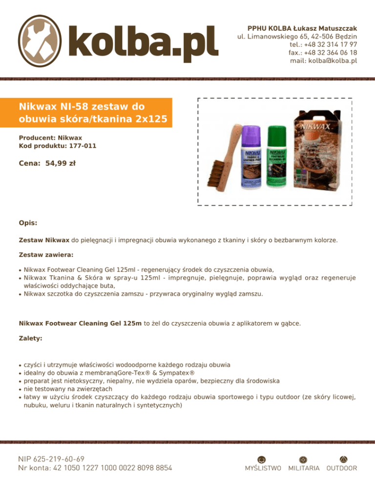 Nikwax NI-58 zestaw do obuwia skóra/tkanina 2x125 Producent: Nikwax Kod produktu: 177-011 Cena: 54,99 zł Opis: Zestaw Nikwax do pielęgnacji i impregnacji obuwia wykonanego z tkaniny i skóry o bezbarwnym kolorze. Zestaw zawiera: ● ● ● Nikwax Footwear Cleaning Gel 125ml - regenerujący środek do czyszczenia obuwia, Nikwax Tkanina & Skóra w spray-u 125ml - impregnuje, pielęgnuje, poprawia wygląd oraz regeneruje właściwości oddychające buta, Nikwax szczotka do czyszczenia zamszu - przywraca oryginalny wygląd zamszu. Nikwax Footwear Cleaning Gel 125m to żel do czyszczenia obuwia z aplikatorem w gąbce. Zalety: ● ● ● ● ● czyści i utrzymuje właściwości wodoodporne każdego rodzaju obuwia idealny do obuwia z membranąGore-Tex® & Sympatex® preparat jest nietoksyczny, niepalny, nie wydziela oparów, bezpieczny dla środowiska nie testowany na zwierzętach łatwy w użyciu środek czyszczący do każdego rodzaju obuwia sportowego i typu outdoor (ze skóry licowej, nubuku, weluru i tkanin naturalnych i syntetycznych) Sposób użycia: ● ● ● ● ● umyć but pod bieżącą wodą by usunąć zabrudzenia i zwilżyć powierzchnię wstrząsnąć przed użyciem. Nacisnąć na gąbkę aż do zwolnienia zabezpieczenia rozprowadzić żel dokładnie przy pomocy aplikatora szorować powierzchnię nylonową szczoteczką (np. do paznokci) starannie wypłukać pod bieżącą wodą Uwaga: Użycie impregnatu może spowodować nieznaczną zmianę koloru obuwia. Należy wypróbować na najmniej widocznym miejscu, np. na języku obuwia. Nie wolno dopuścić, aby środek dostał się do oczu. Przechowywać poza zasięgiem dzieci. Nie spożywać. Nikwax Tkanina & Skóra w spray-u 125ml to wosk do impregnacji obuwia wykonanego z tkaniny i skóry o bezbarwnym kolorze. Nakładany wygodnym aplikatorem w spray-u. Zapewnia pełną nieprzemakalność i oddychalność butów. Zalety: ● ● ● ● impregnuje i utrzymuje właściwości wodoodporne obuwia idealny do obuwia z membraną Gore-Tex® i SympaTex® preparat jest nietoksyczny, niepalny, nie wydziela oparów, bezpieczny dla środowiska nie testowany na zwierzętach Sposób użycia: ● ● ● ● wyczyścić but wilgotną szczotką by usunąć zabrudzenia zabezpieczyć przed zabrudzeniem miejsce, w którym dokonuje się impregnacji. Wstrząsnąć przed użyciem spryskać obuwie z odległości ok. 5 cm. Wosk aplikować na czystą, wilgotną powierzchnię obuwia delikatnie zetrzeć szmatką nadmiar wosku i pozostawić do wyschnięcia Uwaga: Użycie impregnatu może spowodować nieznaczną zmianę koloru obuwia. Należy wypróbować na najmniej widocznym miejscu, np. na języku obuwia. Nie wolno dopuścić, aby środek dostał się do oczu. Przechowywać poza zasięgiem dzieci. Nie spożywać. Nikwax Waterproofing to wiodący na międzynarodowym rynku producent środków do czyszczenia i impregnacji odzieży, obuwia, oraz sprzętu na każdą pogodę. Podukty Nikwax słyną z zapewniania bardzo dobrej wodoodporności przy łatwym i bezpiecznym użytkowaniu. Są bezpieczne dla środowiska naturalnego.