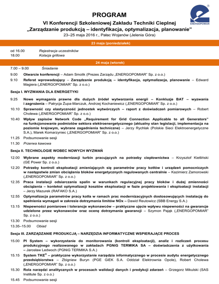 PROGRAM VI Konferencji Szkoleniowej Zakładu Techniki Cieplnej „Zarządzanie produkcją – identyfikacja, optymalizacja, planowanie” 23–25 maja 2016 r., Pałac Wojanów (Jelenia Góra) 23 maja (poniedziałek) od 16.00 18.00 Rejestracja uczestników Kolacja grillowa 24 maja (wtorek) 7.00 – 9.00 Śniadanie 9.00 Otwarcie konferencji – Adam Smolik (Prezes Zarządu „ENERGOPOMIAR” Sp. z o.o.) 9.10 Referat wprowadzający – Zarządzanie produkcją – identyfikacja, optymalizacja, planowanie – Edward Magiera („ENERGOPOMIAR” Sp. z o.o.) Sesja I. WYZWANIA DLA ENERGETYKI 9.25 Nowe wymagania prawne dla dużych źródeł wytwarzania energii – Konkluzje BAT – wyzwania i zagrożenia – Patrycja Żupa-Marczuk, Andrzej Kochaniewicz („ENERGOPOMIAR” Sp. z o.o.) 10.10 Sprawność czy elastyczność jednostek wytwórczych – raport z doświadczeń pomiarowych – Robert Cholewa („ENERGOPOMIAR” Sp. z o.o.) 10.40 Wpływ zapisów Network Code „Requirement for Grid Connection Applicable to all Generators” na funkcjonowanie podmiotów sektora elektroenergetycznego (aktualny stan legislacji, implementacja na poziomie krajowym, wybrane zagadnienia techniczne) – Jerzy Rychlak (Polskie Sieci Elektroenergetyczne S.A.), Marek Komarzyniec („ENERGOPOMIAR” Sp. z o.o.) 11.25 Podsumowanie sesji 11.30 Przerwa kawowa Sesja II. TECHNOLOGIE WOBEC NOWYCH WYZWAŃ 12.00 Wybrane aspekty modernizacji turbin pracujących na potrzeby ciepłownictwa – Krzysztof Kietliński (GE Power Sp. z o.o.) 12.20 Potrzeby kontroli eksploatacji zmieniających się parametrów pracy kotłów i urządzeń pomocniczych w następstwie zmian obciążenia bloków energetycznych regulowanych centralnie – Kazimierz Zamorowski („ENERGOPOMIAR” Sp. z o.o.) 12.35 Praca instalacji odsiarczania spalin w warunkach regulacyjnej pracy bloków i dużej zmienności obciążenia – kontekst optymalizacji kosztów eksploatacji w fazie projektowania i eksploatacji instalacji – Jerzy Mazurek (RAFAKO S.A.) 12.55 Optymalizacja parametrów pracy kotła w ramach prac modernizacyjnych dostosowujących instalację do spełnienia wymagań w zakresie dotrzymania limitów NOx – Dawid Reutowicz (SBB Energy S.A.) 13.15 Niepewności pomiarowe i tolerancje wykonawców – praktyczne ujęcie wpływu niepewności na gwarancje udzielone przez wykonawców oraz ocenę dotrzymania gwarancji – Szymon Pająk („ENERGOPOMIAR” Sp. z o.o.) 13.30 Podsumowanie sesji 13.35–15.00 Obiad Sesja III. ZARZĄDZANIE PRODUKCJĄ – NARZĘDZIA INFORMATYCZNE WSPIERAJĄCE PROCES 15.00 PI System – wykorzystanie do monitorowania (kontroli eksploatacji), analiz i rozliczeń procesu produkcyjnego realizowanego w zakładach PGNiG TERMIKA SA – doświadczenia z użytkowania – Jarosław Ledwoch (PGNiG TERMIKA S.A.) 15.15 System TKE – praktyczne wykorzystanie narzędzia informatycznego w procesie audytu energetycznego przedsiębiorstwa – Zbigniew Buryn (PGE GiEK S.A. Oddział Elektrownia Opole), Robert Cholewa („ENERGOPOMIAR” Sp. z o.o.) 15.30 Rola narzędzi analitycznych w procesach walidacji danych i predykcji zdarzeń – Grzegorz Mikulski (SAS Institute Sp. z o.o.) 15.45 Podsumowanie sesji ® Sesja IV. OPTYMALIZACJA PROCESÓW ENERGETYCZNYCH 15.50 Analiza sprawności stosowanych metod regulacji parametrów pompowania kondensatu głównego bloków energetycznych – Mateusz Kasprzyk („ENERGOPOMIAR” Sp. z o.o.) 16.10 Efektywna wymiana ciepła w układzie drogą do optymalizacji pracy instalacji produkcyjnej – studium przypadku na przykładzie płytowych wymienników ciepła – Mariusz Kusa („ENERGOPOMIAR” Sp. z o.o.) 16.25 Przerwa kawowa 16.50 Analiza techniczno-ekonomiczna remontu modernizacyjnego kotła pyłowego OP-650 – Dariusz Dekarz („ENERGOPOMIAR” Sp. z o.o.) 17.10 Praktyczne aspekty analizy niepewności układów pomiarowych strumieni mediów w kontekście oceny przydatności do rozliczeń oraz obowiązku monitorowania emisji CO2 – Adrian Ordon („ENERGOPOMIAR” Sp. z o.o.) 17.25 Praca urządzeń układu próżniowego w kontekście optymalizacji wytwarzania energii – Andrzej Drajczyk („ENERGOPOMIAR” Sp. z o.o.) 17.40 Rola modelowania numerycznego w procesach modernizacyjnych ukierunkowanych na poprawę sprawności maszyn przepływowych – Andrzej Błaszczyk (Hydro-Pomp Sp. z o.o.) 17.55 Podsumowanie I dnia obrad 18.00 Czas wolny 19.30 Uroczysta kolacja 21.00 Koncert 25 maja (środa) 7.00 do 9.00 Śniadanie Sesja V. AUDYTING ENERGETYCZNY – SZANSA CZY FORMALNY OBOWIĄZEK? 9.30 Uwarunkowania prawne dla efektywności energetycznej – nowe możliwości i obowiązki w ujęciu praktycznym – Tomasz Słupik („ENERGOPOMIAR” Sp. z o.o.) 10.00 Modernizacja i budowa jednostek wytwórczych o nominalnej mocy cieplnej powyżej 20 MW w kontekście nowelizacji Ustawy o efektywności energetycznej – Paweł Mońka („ENERGOPOMIAR” Sp. z o.o.) 10.20 System Zarządzania Energią jako element zrównoważonego rozwoju przedsiębiorstwa – Andrzej Ociepa (Ekspert ds. systemu zarządzania energią) 10.40 Praktyczne aspekty wdrażania Systemu Zarządzania Energią – Dawid Kijowski („ENERGOPOMIAR” Sp. z o.o.) 10.55 Możliwości oszczędności energii na podstawie wniosków z audytów energetycznych w układach pompowych – Grzegorz Pakuła (Grupa Powen-Wafapomp S.A.) 11.10 Podsumowanie sesji 11.15 Przerwa kawowa Sesja VI. PRODUKCJA ENERGII ELEKTRYCZNEJ I CIEPŁA W UJĘCIU LOKALNYM – PROBLEMY ORAZ OPTYMALIZACJA 11.45 Metodyka rozliczania kosztów wytwarzania energii elektrycznej i ciepła przy pracy w skojarzeniu – przegląd metod – Mariusz Mietelski („ENERGOPOMIAR” Sp. z o.o.) 12.00 Spalarnie śmieci jako przykład zastosowania rozwiązań technicznych umożliwiających spełnienie wymagań BAT dla elektrociepłowni – Wodzisław Piekarczyk („ENERGOPOMIAR” Sp. z o.o.) 12.15 Współpraca źródła ciepła zlokalizowanego w spalarni odpadów z miejską siecią ciepłowniczą – studium przypadku