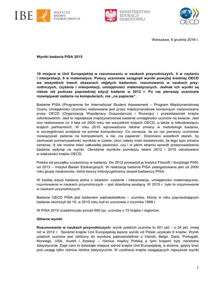 Warszawa, 6 grudnia 2016 r. Wyniki badania PISA 2015 10 miejsce w Unii Europejskiej w rozumowaniu w naukach przyrodniczych, 4 w czytaniu i interpretacji, 6 w matematyce. Polscy uczniowie osiągnęli wyniki powyżej średniej OECD we wszystkich trzech obszarach objętych badaniem: rozumowania w naukach przyrodniczych, czytania i interpretacji, umiejętności matematycznych. Jednak ich wyniki są niższe niż podczas poprzedniej edycji badania w 2012 r. Po raz pierwszy uczniowie rozwiązywali zadania na komputerach, nie „na papierze”. Badanie PISA (Programme for International Student Assessment – Program Międzynarodowej Oceny Umiejętności Uczniów) realizowane jest przez międzynarodowe konsorcjum nadzorowane przez OECD (Organizację Współpracy Gospodarczej i Rozwoju) i przedstawicieli krajów członkowskich. Jest to największe międzynarodowe badanie umiejętności uczniów na świecie. Jest ono realizowane co 3 lata od 2000 roku we wszystkich krajach OECD, a także w kilkudziesięciu krajach partnerskich. W roku 2015 wprowadzono istotne zmiany w metodologii badania, w szczególności przejście na pomiar komputerowy. Co oznacza, że po raz pierwszy uczniowie rozwiązywali zadania na komputerach, a nie „na papierze”. Dokonano wszelkich starań, by zachować porównywalność wyników w czasie, choć należy mieć świadomość, że tego typu zmiana oznacza, iż nie można mieć całkowitej pewności, czy i w jakim stopniu sposób przeprowadzenia badania wpłynął na wyniki. Obniżenie wyników pomiędzy latami 2012 i 2015 odnotowano w większości krajów OECD. Polska od początku uczestniczy w badaniu. Do 2012 prowadził je Instytut Filozofii i Socjologii PAN, od 2013 – Instytut Badań Edukacyjnych. W realizację badania PISA zaangażowana jest od 2000 roku grupa naukowców, która tworzy interdycyplinarny zespół badawczy PISA. W każdej edycji badania jedna z dziedzin: czytanie i interpretacja, umiejętności matematyczne, rozumowanie w naukach przyrodniczych – jest dziedziną wiodącą. W 2015 r. było to rozumowanie w naukach przyrodniczych. Badanie OECD PISA jest badaniem piętnastolatków – uczniów, którzy w roku poprzedzającym badanie ukończyli lat 15; w 2015 roku byli to uczniowie z rocznika 1999 r. W PISA 2015 uczestniczyło ponad 500 tys. uczniów z 72 krajów i regionów. Główne wyniki Rozumowanie w naukach przyrodniczych: wynik polskich uczniów to 501 pkt – o 24 pkt. mniej niż w 2012 r. Spośród krajów Unii Europejskiej lepsze wyniki od Polski uzyskało 6 krajów. Wynik polskich uczniów jest zbliżony do wyników piętnastolatków z Irlandii, Belgii, Danii, Portugalii, Norwegii, USA, Austrii i Szwecji – różnice między Polską a tymi krajami były nieistotne statystycznie. Daje nam to dziesiąte miejsce wśród krajów Unii Europejskiej, a siódme, gdyby brać pod uwagę tylko różnice istotne statystycznie. W czołówce krajów osiągających najwyższe wyniki 1 w badaniu kompetencji przyrodniczych znajdują się kraje Dalekiego Wschodu, a także Finlandia, Estonia i Kanada. Pierwsze miejsce zajmuje Singapur (556 pkt). Z krajów europejskich przoduje Estonia z wynikiem 534 punktów, a w czołówce znajduje się też Finlandia (531 pkt). W czytaniu i interpretacji średni wynik Polski to 506 pkt – o 12 pkt mniej niż w 2012 r. W UE lepsze wyniki od polskich gimnazjalistów uzyskali tylko uczniowie z Finlandii, Irlandii i Estonii (wynik uczniów z Niemiec jest wyższy, ale różnica jest nieistotna). Lepsze średnie wyniki osiągnęli uczniowie z trzech krajów: Finlandii, Irlandii, Estonii, a wliczając wszystkie kraje europejskie, na czwartym w Europie (bo lepsi są także Norwegowie). Wśród krajów świata Polska znalazła się na 13 miejscu. Warto zaznaczyć, że jedynie 9 krajów uzyskało wynik statystycznie istotnie lepszy od Polski, zaś w przypadku 3 ich przewaga mieściła się w granicach błędów losowych. Średni wynik polskich uczniów w zakresie matematyki to 504 pkt., o 14 pkt mniej niż w 2012 r. W Europie jesteśmy na 8. pozycji. Wynik polskich uczniów jest zbliżony do wyników Belgii, Niemiec, Irlandii i Norwegii. W UE lepsze od Polski wyniki uzyskało 5 krajów: Estonia, Holandia, Dania, Finlandia i Słowenia. W zakresie rozumowania w naukach przyrodniczych odsetek uczniów najsłabszych, czyli poniżej drugiego poziomu umiejętności, w roku 2015 wyniósł 16,3% (w 2012 r. było to 9%, a w 2006 17%). Trudno jednoznacznie określić, na ile zmiana pomiędzy latami 2012 a 2015 wynikała z zastosowania pomiaru komputerowego. Podobne zmiany nastąpiły w pozostałych dziedzinach: w matematyce – 17,2% w 2015 r. (w 2012r. – 14,4% ), a w zakresie czytania i interpretacji – 14,4% (w 2012 r. – 10,6%). Analogicznie uczniów z najlepszymi wynikami w rozumowaniu w naukach przyrodniczych było 7,3% w 2015 r. (w 2012 r. – 10,8%, a w 2006 – 6,8%). W matematyce w 2015 r. najlepszych uczniów było 12,2% (w 2012 r. – 16,7%), a w czytaniu – 8,2% (w 2012 r. – 10,1%). Ze względu na zmianę techniki pomiaru wydaje się, że ważniejsze jest odniesienie polskich wyników do wyników innych krajów. Zarówno pod względem odsetka najlepszych, jak i najsłabszych uczniów wynik Polski jest lepszy niż średnio w krajach OECD, z wyjątkiem odsetka uczniów najlepszych w czytaniu i interpretacji, który jest nieco niższy i obszar ten wymaga wsparcia. W rozumowaniu w naukach przyrodniczych w 2015 r. średni wynik chłopców w krajach OECD wyniósł 495 punktów i był o 4 pkt. wyższy od średniego wyniku dziewcząt. W Polsce średni wynik dziewcząt wyniósł 498 pkt., podczas gdy chłopcy osiągnęli 504 pkt. Także w zakresie matematyki odnotowano przewagę chłopców: ich średni wynik to 511 punktów, a dziewcząt – 499 punktów. Po raz pierwszy od lat przewaga chłopców nad dziewczętami w matematyce jest istotna statystycznie (w latach 2009 i 2012 wynosiła tylko 4 punkty). Przewaga chłopców w tej dzied
