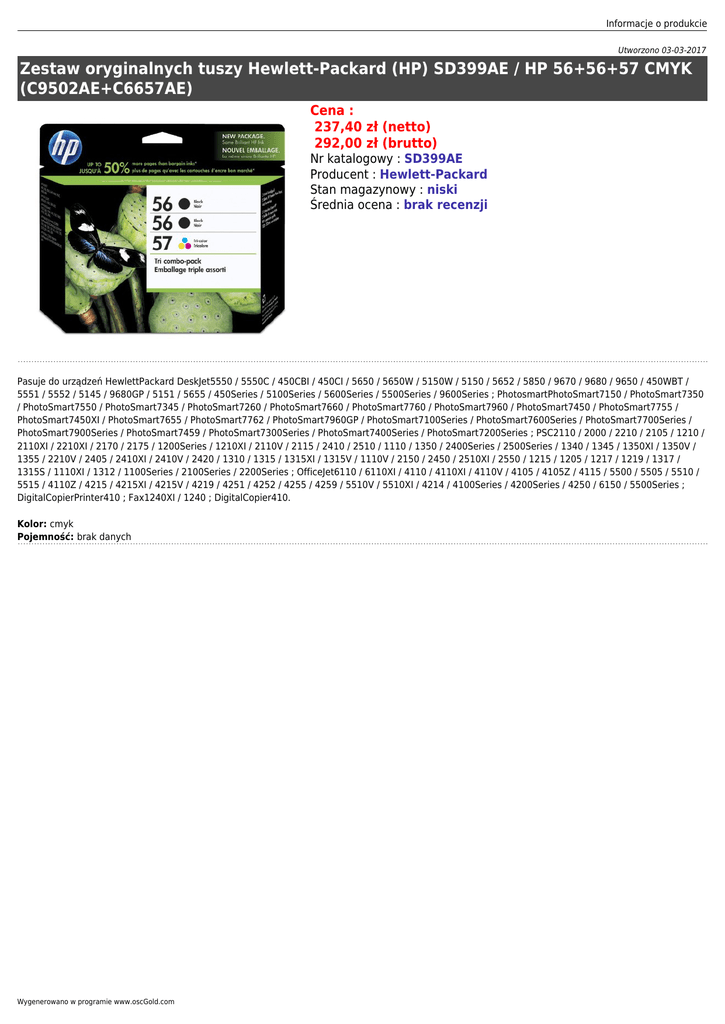 Informacje o produkcie Utworzono 03-03-2017 Zestaw oryginalnych tuszy Hewlett-Packard (HP) SD399AE / HP 56+56+57 CMYK (C9502AE+C6657AE) Cena : 237,40 zł (netto) 292,00 zł (brutto) Nr katalogowy : SD399AE Producent : Hewlett-Packard Stan magazynowy : niski Średnia ocena : brak recenzji Pasuje do urządzeń HewlettPackard DeskJet5550 / 5550C / 450CBI / 450CI / 5650 / 5650W / 5150W / 5150 / 5652 / 5850 / 9670 / 9680 / 9650 / 450WBT / 5551 / 5552 / 5145 / 9680GP / 5151 / 5655 / 450Series / 5100Series / 5600Series / 5500Series / 9600Series ; PhotosmartPhotoSmart7150 / PhotoSmart7350 / PhotoSmart7550 / PhotoSmart7345 / PhotoSmart7260 / PhotoSmart7660 / PhotoSmart7760 / PhotoSmart7960 / PhotoSmart7450 / PhotoSmart7755 / PhotoSmart7450XI / PhotoSmart7655 / PhotoSmart7762 / PhotoSmart7960GP / PhotoSmart7100Series / PhotoSmart7600Series / PhotoSmart7700Series / PhotoSmart7900Series / PhotoSmart7459 / PhotoSmart7300Series / PhotoSmart7400Series / PhotoSmart7200Series ; PSC2110 / 2000 / 2210 / 2105 / 1210 / 2110XI / 2210XI / 2170 / 2175 / 1200Series / 1210XI / 2110V / 2115 / 2410 / 2510 / 1110 / 1350 / 2400Series / 2500Series / 1340 / 1345 / 1350XI / 1350V / 1355 / 2210V / 2405 / 2410XI / 2410V / 2420 / 1310 / 1315 / 1315XI / 1315V / 1110V / 2150 / 2450 / 2510XI / 2550 / 1215 / 1205 / 1217 / 1219 / 1317 / 1315S / 1110XI / 1312 / 1100Series / 2100Series / 2200Series ; OfficeJet6110 / 6110XI / 4110 / 4110XI / 4110V / 4105 / 4105Z / 4115 / 5500 / 5505 / 5510 / 5515 / 4110Z / 4215 / 4215XI / 4215V / 4219 / 4251 / 4252 / 4255 / 4259 / 5510V / 5510XI / 4214 / 4100Series / 4200Series / 4250 / 6150 / 5500Series ; DigitalCopierPrinter410 ; Fax1240XI / 1240 ; DigitalCopier410. Kolor: cmyk Pojemność: brak danych Wygenerowano w programie www.oscGold.com