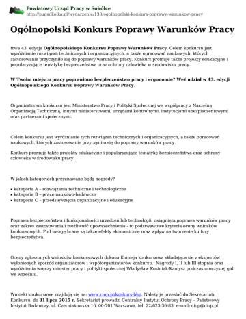 Powiatowy Urząd Pracy w Sokółce http://pupsokolka.pl/wydarzenie/138/ogolnopolski-konkurs-poprawy-warunkow-pracy Ogólnopolski Konkurs Poprawy Warunków Pracy trwa 43. edycja Ogólnopolskiego Konkursu Poprawy Warunków Pracy. Celem konkursu jest wyróżnianie rozwiązań technicznych i organizacyjnych, a także opracowań naukowych, których zastosowanie przyczyniło się do poprawy warunków pracy. Konkurs promuje także projekty edukacyjne i popularyzujące tematykę bezpieczeństwa oraz ochrony człowieka w środowisku pracy. W Twoim miejscu pracy poprawiono bezpieczeństwo pracy i ergonomię? Weź udział w 43. edycji Ogólnopolskiego Konkursu Poprawy Warunków Pracy. Organizatorem konkursu jest Ministerstwo Pracy i Polityki Społecznej we współpracy z Naczelną Organizacją Techniczną, innymi ministerstwami, urzędami kontrolnymi, instytucjami ubezpieczeniowymi oraz partnerami społecznymi. Celem konkursu jest wyróżnianie tych rozwiązań technicznych i organizacyjnych, a także opracowań naukowych, których zastosowanie przyczyniło się do poprawy warunków pracy. Konkurs promuje także projekty edukacyjne i popularyzujące tematykę bezpieczeństwa oraz ochrony człowieka w środowisku pracy. W jakich kategoriach przyznawane będą nagrody? ● ● ● kategoria A – rozwiązania techniczne i technologiczne kategoria B – prace naukowo-badawcze kategoria C – przedsięwzięcia organizacyjne i edukacyjne Poprawa bezpieczeństwa i funkcjonalności urządzeń lub technologii, osiągnięta poprawa warunków pracy oraz zakres zastosowania i możliwość upowszechnienia - to podstwawowe kryteria oceny wniosków konkursowych. Pod uwagę brane są także efekty ekonomiczne oraz wpływ na tworzenie kultury bezpieczeństwa. Oceny zgłoszonych wniosków konkursowych dokona Komisja konkursowa składająca się z ekspertów wyłonionych spośród organizatorów i współorganizatorów konkursu. Nagrody I, II lub III stopnia oraz wyróżnienia wręczy minister pracy i polityki społecznej Władysław Kosiniak-Kamysz podczas uroczystej gali we wrześniu. Wnioski konkursowe znajdują się na: www.ciop.pl/konkurs-bhp. Należy je przesłać do Sekretariatu Konkursu do 31 lipca 2015 r. Sekretariat prowadzi Centralny Instytut Ochrony Pracy – Państwowy Instytut Badawczy, ul. Czerniakowska 16, 00-701 Warszawa, tel. 22/623-36-83, e-mail: [email protected] Patronami medialnymi konkursu są: Infor.pl, Praca i Zdrowie, Przyjaciel przy Pracy, Kulturabezpieczeństwa.pl, TVP Info, Dziennik Gazeta Prawna, portalbhp.pl oraz Bezpieczenstwo Pracy nauka i praktyka.