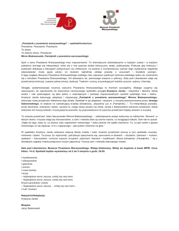 „Pamiętnik z powstania warszawskiego” – spektakl/oratorium. Powstanie. Powstanie. Powstanie. To słowo. To dziwne słowo. Powstanie. Miron Białoszewski, Pamiętnik z powstania warszawskiego Spór o sens Powstania Warszawskiego trwa nieprzerwanie. To dramatyczne doświadczenie w każdym czasie i w każdym pokoleniu domaga się interpretacji; mówi się o nim poprzez dzieła historyczne, eseje, publicystykę. Podczas gdy historycy i publicyści debatują o decyzjach politycznych czy militarnych, na pytania o humanistyczny wymiar tego wydarzenia najpełniej odpowiedzieć może język sztuki, on bowiem najtrafniej oddaje prawdę o uczuciach i kształcie pamięci. Z tego względu Muzeum Powstania Warszawskiego każdego roku zaprasza wybitnych twórców polskiego teatru do zmierzenia się z tematem Powstania Warszawskiego. Od dziewięciu lat, pierwszego sierpnia o północy, Sala pod Liberatorem staje się przestrzenią twórczej, czasem pełnej emocji, dyskusji. Teatrem i sceną, przywołującymi ludzkie uczucia, wybory i dramaty. Okrągła, siedemdziesiąta rocznica wybuchu Powstania Warszawskiego to moment szczególny. Dlatego czujemy się zaszczyceni, że zaproszenie do stworzenia rocznicowego spektaklu przyjęła Krystyna Janda – reżyserka i aktorka, której osoba i role postrzegane są jako jedne z ważniejszych i bardziej rozpoznawalnych symboli polskiego kina i teatru. Krystyna Janda dokonując adaptacji i reżyserując „Pamiętnik z powstania warszawskiego” Mirona Białoszewskiego, stworzyła nową przestrzeń odbierania tego dzieła. Spektakl w jej adaptacji i reżyserii, z muzyką skomponowaną przez Jerzego Satanowskiego, to wejście na zaskakującą ścieżkę dźwiękową, „słyszalną” już w „Pamiętniku...”. Ta interpretacja pozwala, przez słuchanie, mówienie i śpiew, wyrazić to, czego słowo pisane nie odda; Janda z Satanowskim stworzyli przestrzeń, której widzowie nie muszą widzieć; muszą jedynie pozwolić, by poprowadzono ich poprzez przestrzeń między słowem a muzyką. To zresztą przestrzeń, która fascynowała Mirona Białoszewskiego – oddziaływanie poezji melicznej na odbiorców. Moment, w którym słowa i muzyka stają się nierozerwalne, a rytm i melodia słów są równie ważne, co wciągająca fabuła. Sam tak to opisał : „Dążę do tego, żeby to, co pisane, było zapisaniem mówionego. I żeby pisanie nie zjadło mówieni a. To, co jest warte z języka mówionego, to się zapisuje. A to z napisanego – jest potem mówione na głos.” W spektaklu Krystyny Jandy widzowie usłyszą litanię miasta i ludzi, bowiem przestrzeń tworzą w tym spektaklu muzyka, mówienie i śpiew. Ta proza, by wybrzmieć, potrzebuje zasłuchania się; zanurzenia w słowach – strzałach, zdaniach – hukach, sylabach – kanonadach, rumorze, tupocie, krzykach, pieśniach, litaniach i modlitwach. Słowa bohaterów „Pamiętnika...” są z dźwiękami zagłady miasta połączone niczym pępowiną. Tworzą rytm i melodię walczącego miasta. Sala pod Liberatorem, Muzeum Powstania Warszawskiego. Wstęp biletowany. Bilety do kupienia w kasie MPW. Cena biletu: 14 zł. Spektakl będzie wystawiany od 2 do 5 sierpnia o godz. 20.00. I wydobywanie. I odsypywanie. I gaszenie. I pomoc. I nowe bomby. I krzyk. – Najświętsze serce Jezusa, zmiłuj się nad nami. – Najświętsze serce Jezusa, zmiłuj się nad nami. Wycie samolotów i bomb. – Najświętsze serce Jezusa… zmiłuj się nad nami… I huk! I koniec! Reżyseria/Adaptacja: Krystyna Janda Muzyka: Jerzy Satanowski Reżyseria światła: Katarzyna Łuszczyk Realizacja światła: Dariusz Adamski Reżyseria dźwięku: Mirosław Burkot Dyrygent: Wojciech Zieliński Obsada/Wokaliści: Krystyna Janda Anna Gadt (pierwszy sopran) Agnieszka Kiepuszewska (alt) Iwona Kmiecik (drugi sopran) Wyjciech Myrczek (bas) Marcin Wawrzynowicz (tenor) Muzycy: Paweł Bomert Piotr Maślanka Marta Oyrzanowska Paweł Stankiewicz Dorota Woźniak-Mocarska Wiesław Wysocki Kierownik produkcji: Marta Kuźmiak Produkcja MPW: Agnieszka Szulejewska Współpraca: Magdalena Brzeska, Jacek Chałupka