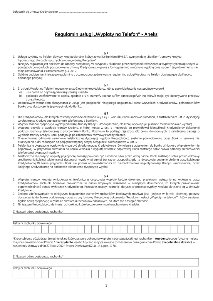 Załącznik do Umowy Kredytowej nr ................................................................................. Regulamin usługi „Wypłaty na Telefon” - Aneks §1 1. Usługa Wypłaty na Telefon dotyczy Kredytobiorców, którzy zawarli z Bankiem BPH S.A, zwanym dalej „Bankiem”, umowę kredytu hipotecznego dla osób fizycznych, zwanego dalej „Kredytem”. 2. Niniejszy regulamin jest aneksem do Umowy Kredytowej. W przypadku składania przez Kredytobiorców zlecenia wypłaty trybem opisanym w poniższych paragrafach, postanowienia Umowy Kredytowej związane z formą pisemną wniosku o wypłatę oraz wzorem tego dokumentu nie mają zastosowania, z zastrzeżeniem § 3 ust. 2. 3. Od dnia podpisania niniejszego regulaminu tracą moc poprzednie wersje regulaminu usługi Wypłaty na Telefon obwiązujące dla Kredytu opisanego powyżej. §2 1. Z usługi „Wypłat na Telefon” mogą skorzystać jedynie Kredytobiorcy, którzy spełniają łącznie następujące warunki: a) uruchomili co najmniej pierwszą transzę Kredytu, b) posiadają zdefiniowane w Banku, zgodnie z § 4, numer/y rachunku/ów bankowego/ych na który/e mają być dokonywane przelewy transz Kredytu, 2. Dodatkowym warunkiem skorzystania z usługi jest podpisanie niniejszego Regulaminu przez wszystkich Kredytobiorców, pełnomocników Banku oraz dostarczenie jego oryginału do Banku. §3 1. Dla Kredytobiorców, dla których zostaną spełnione określone w § 1 i § 2 warunki, Bank umożliwia składanie, z zastrzeżeniem ust. 2 dyspozycji wypłat transz Kredytu poprzez kontakt telefoniczny z Bankiem. 2. Wyjątek stanowi dyspozycja wypłaty pierwszej transzy Kredytu i Podwyższenia, dla której obowiązuje pisemna forma wniosku o wypłatę 3. Wstępna decyzja o wypłacie transzy Kredytu, o której mowa w ust. 1 następuje po prawidłowej identyfikacji Kredytobiorcy dokonanej podczas rozmowy telefonicznej z pracownikiem Banku. Rozmowa ta podlega rejestracji dla celów dowodowych, a ostateczną decyzję o wypłacie transzy Kredytu Bank podejmuje po zakończeniu rozmowy z Kredytobiorcą. 4. O ewentualnej odmowie wykonania telefonicznej dyspozycji wypłaty Kredytobiorca zostanie powiadomiony przez Bank w terminie nie dłuższym niż 5 dni roboczych od podjęcia wstępnej decyzji o wypłacie, o której mowa w ust. 3. 5. Telefoniczna dyspozycja wypłaty nie może być składana przez Kredytobiorcę równolegle z przesłaniem do Banku Wniosku o Wypłatę w formie papierowej. W przypadku przesłania do Banku Wniosku o wypłatę w formie papierowej, Bank zastrzega sobie prawo odmowy zrealizowania telefonicznej dyspozycji wypłaty. 6. Telefoniczna dyspozycja wypłaty pojedynczej transzy powinna być składana tylko przez jedną osobę. Bank zastrzega sobie prawo odmowy zrealizowania kolejnej telefonicznej dyspozycji wypłaty tej samej transzy w przypadku, gdy ta dyspozycja zostanie złożona przez kolejnego Kredytobiorcę. W takim przypadku Bank nie ponosi odpowiedzialności za niezrealizowanie wypłaty transzy Kredytu wnioskowanej przez kolejnego Kredytobiorcę na podstawie telefoniczną dyspozycją wypłat. §4 1. Wypłata transzy Kredytu wnioskowanej telefoniczną dyspozycją wypłaty będzie dokonana przelewem wyłącznie na wskazane przez Kredytobiorców rachunki bankowe prowadzone w banku krajowym, wskazane w niniejszym dokumencie, za których prawidłowość odpowiedzialność ponosi wyłącznie Kredytobiorca. Pozostałe zasady i warunki dotyczące procesu wypłaty Kredytu określone są w Umowie Kredytowej . 2. Zmiana zdefiniowanych w niniejszym Regulaminie numerów rachunków bankowych możliwa jest jedynie w formie pisemnej, poprzez dostarczenie do Banku podpisanego przez strony Umowy Kredytowej dokumentu ”Regulamin usługi „Wypłaty na telefon””, który zawierać będzie nową dyspozycję w zakresie określenia rachunków bankowych, na które ma nastąpić płatność. 3. Niniejszym Kredytobiorca definiuje rachunki, na które będzie dokonywał uruchomienia Kredytu: 1) Nazwa i adres posiadacza rachunku* Pełny nr rachunku bankowego *Kredytobiorca oświadcza, że rachunek na który zostanie dokonana wypłata kredytu/pożyczki jest rachunkiem rezydenta(osoba fizyczna mające miejsce zamieszkania w Polsce) / nierezydenta (osoba fizyczna mające miejsce zamieszkania poza granicami Polski) (niepotrzebne skreślić), w rozumieniu Ustawy z dnia 27 lipca 2002r. Prawo Dewizowe (DZ .U. 141. poz. 1178). 2) Nazwa i adres posiadacza rachunku* Pełny nr rachunku bankowego 1 *Kredytobiorca oświadcza, że rachunek na który zostanie dokonana wypłata kredytu/pożyczki jest rachunkiem rezydenta(osoba fizyczna mające miejsce zamieszkania w Polsce) / nierezydenta (osoba fizyczna mające miejsce zamieszkania poza granicami Polski) (niepotrzebne skreślić), w rozumieniu Ustawy z dnia 27 lipca 2002r. Prawo Dewizowe (DZ .U. 141. poz. 1178). 3) Nazwa i adres posiadacza rachunku* Pełny nr rachunku bankowego *Kredytobiorca oświadcza, że rachunek na który zostanie dokonana wypłata kredytu/pożyczki jest rachunkiem rezydenta(osoba fizyczna mające miejsce zamieszkania w Polsce) / nierezydenta (osoba fizyczna mające miejsce zamieszkania poza granicami Polski) (niepotrzebne skreślić), w rozumieniu Ustawy z dnia 27 lipca 2002r. Prawo Dewizowe (DZ .U. 141. poz. 1178). 4) Nazwa i adres posiadacza rachunku* Pełny nr rachunku bankowego *Kredytobiorca oświadcza, że rachunek na który zostanie dokonana wypłata kredytu/pożyczki jest rachunkiem rezydenta(osoba fizyczna mające miejsce zamieszkania w Polsce) / nierezydenta (osoba fizyczna mające miejsce zamieszkania poza granicami Polski) (niepotrzebne skreślić), w rozumieniu Ustawy z dnia 27 lipca 2002r. Prawo Dewizowe (DZ .U. 141. poz. 1178). §5 Kredytobiorca ma prawo wycofać telefoniczną dyspozycję wypłaty poprzez ponowny kontakt telefoniczny z Bankiem. Wycofanie dyspozycji jest możliwe jedynie do momentu zrealizowania przez Bank wypłaty transzy Kredytu. §6 Przyjęcie t