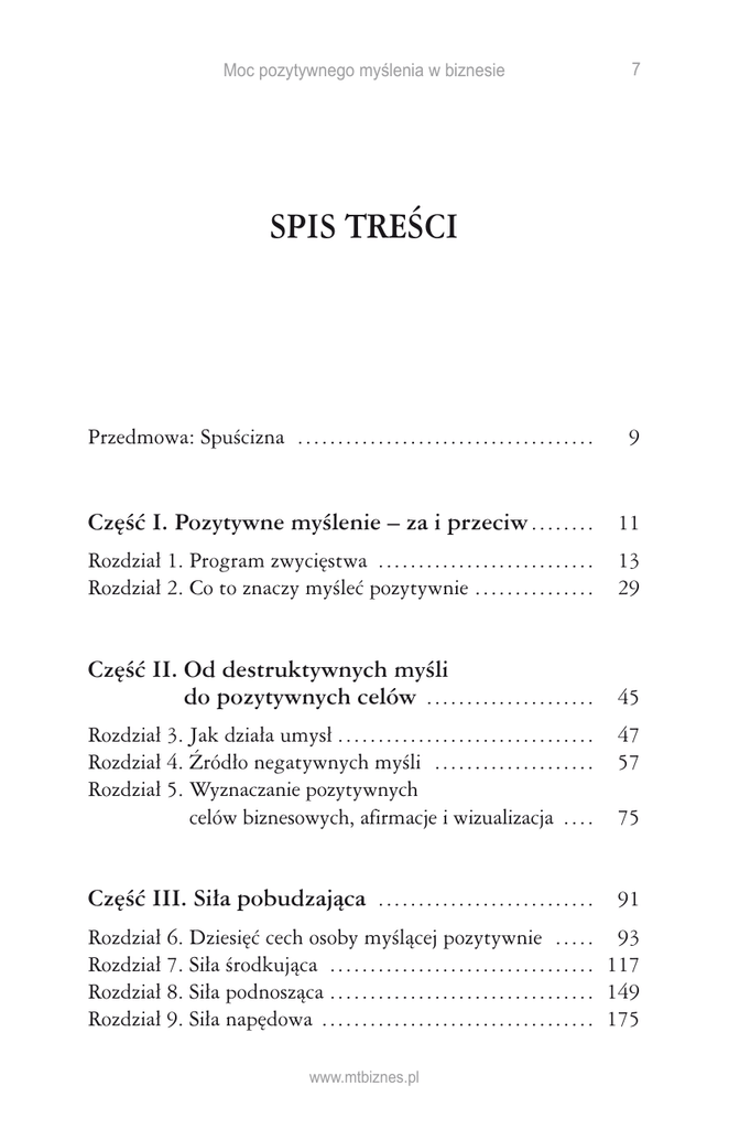 Moc pozytywnego myślenia w biznesie Spis treści Przedmowa: Spuścizna .. . . . . . . . . . . . . . . . . . . . . . . . . . . . . . . . . . . . . 9 Część I. Pozytywne myślenie – za i przeciw.. . . . . . . . 11 Rozdział 1. Program zwycięstwa .. . . . . . . . . . . . . . . . . . . . . . . . . . . Rozdział 2. Co to znaczy myśleć pozytywnie . . . . . . . . . . . . . . . 13 29 Część II. Od destruktywnych myśli do pozytywnych celów .. . . . . . . . . . . . . . . . . . . . . 45 Rozdział 3. Jak działa umysł . . . . . . . . . . . . . . . . . . . . . . . . . . . . . . . . Rozdział 4. Źródło negatywnych myśli . . . . . . . . . . . . . . . . . . . . . Rozdział 5. Wyznaczanie pozytywnych celów biznesowych, afirmacje i wizualizacja .. . . . 47 57 Część III. Siła pobudzająca .. . . . . . . . . . . . . . . . . . . . . . . . . . . 91 75 Rozdział 6. Dziesięć cech osoby myślącej pozytywnie .. . . . . 93 Rozdział 7. Siła środkująca .. . . . . . . . . . . . . . . . . . . . . . . . . . . . . . . . . 117 Rozdział 8. Siła podnosząca . . . . . . . . . . . . . . . . . . . . . . . . . . . . . . . . . 149 Rozdział 9. Siła napędowa .. . . . . . . . . . . . . . . . . . . . . . . . . . . . . . . . . . 175 www.mtbiznes.pl Moc pozytywnego myślenia w biznesie Rozdział 10. Siła przytrzymująca .. . . . . . . . . . . . . . . . . . . . . . . . . . . 205 Pomoce: A rkusz roboczy „Wyzwania w życiu zawodowym” . . . . . . . . . . . . . . . . 233 Podziękowania .. . . . . . . . . . . . . . . . . . . . . . . . . . . . . . . . . . . . . . . . . . . . . . 239 www.mtbiznes.pl Moc pozytywnego myślenia w biznesie Przedmowa Spuścizna I ntuicja i wnikliwość podpowiedziały mojemu mężowi, że wszyscy rodzimy się jako osoby myślące pozytywnie, ale z czasem nieuniknione stresy związane z życiem codziennym przesłaniają i tłumią niektóre cechy pozytywnego myślenia. Norman poświęcił znaczną część kariery zawodowej na to, aby pokazywać ludziom, jak odzyskać tę wrodzoną pozytywność, zwłaszcza w obliczu przeciwności losu lub wyzwań, jakie stawia życie. Mój mąż pragnął wprowadzić pozytywne myślenie do społeczności biznesu, bo biznes ma ogromny wpływ na nasze życie i kulturę. Zmiany w środowisku pracy zachodzą dziś szybciej niż kiedykolwiek wcześniej, więc dla ludzi biznesu szczególnie istotne znaczenie ma posiadanie narzędzia pozwalającego sprostać temu wyzwaniu, a to jest możliwe dzięki metodyce radzenia sobie ze zmianami. I w tym sensie Moc pozytywnego myślenia w biznesie stanowi naturalne przedłużenie dzieła Normana. Moc pozytywnego myślenia w biznesie to adaptacja wypróbowanych i sprawdzonych sposobów Normana Vincenta Peale’a, które pomogą Ci osiągnąć większą efektywność. Żywię przekonanie, że w środowisku pracy w XXI wieku jest to szczególnie www.mtbiznes.pl 10 Moc pozytywnego myślenia w biznesie istotne i przydatne. Mam nadzieję, że podróż do celu, jakim jest pozytywne myślenie, sprawi Ci wiele przyjemności. Ruth Stafford Peale www.mtbiznes.pl Moc pozytywnego myślenia w biznesie Część I POZYTYWNE MYŚLENIE – ZA I PRZECIW www.mtbiznes.pl 11 Moc pozytywnego myślenia w biznesie 13 Rozdział 1 Program zwycięstwa „U wierz w siebie! Pokładaj wiarę we własne zdolności! Bez pełnej pokory, ale i rozsądku, pewności siebie, wiary we własne siły nie osiągniesz sukcesu ani szczęścia. Kiedy posiądziesz zdrową pewność siebie, odniesiesz sukces”. Gdy po raz pierwszy przeczytałem te słowa, rozpoczynające bestseller Moc pozytywnego myślenia autorstwa dr. Normana Vincenta Peale’a, wstrząsnęły mną do głębi. Przebijała z nich prawda i siła. I tak jak miliony innych osób zaraziłem się pozytywnym myśleniem, tak jak miliony innych wprowadziłem jego zasady we wszystkie dziedziny życia, co spowodowało moją wręcz niewiarygodną przemianę wewnętrzną. Mając zaledwie dwadzieścia jeden lat, stałem się nowym człowiekiem. Moje związki z ludźmi radykalnie się poprawiły. Osiągnąłem większą pewność siebie i skupienie. Zniknęły stany załamania, których dotychczas doświadczałem. I w przeciwieństwie do innych koncepcji samodoskonalenia, zasady pozytywnego myślenia pozostały ze mną i poprowadziły mnie do wielu sukcesów w życiu osobistym i zawodowym. Większość programów samodoskonalenia przypomina potrawy kuchni chińskiej – smakują wspaniale i są sycące, ale parę godzin później jesteśmy gotowi zjeść pizzę. Zasady pozytywnego myślenia są inne, bo opierają się na solidnych fundamentach bezwww.mtbiznes.pl spornych, uniwersalnych prawd duchowych i naukowych. Kiedy pracowałem dla Juran Institute, firmy konsultingowej specjalizującej się w zarządzaniu jakością, połączyłem pozytywne myślenie i biznes. Przepracowałem tam jedenaście lat jako konsultant i miałem w tym czasie do czynienia z wieloma przedsiębiorstwami. Pomagałem im uzyskać lepsze wyniki poprzez skupienie się na jakości. Dążąc do podwyższenia jakości towarów oraz usług, nacisk kładziono wtedy przeważnie na przedmioty oraz procesy. Niepokoiło mnie, że niewiele uwagi zwracano na ludzi odpowiedzialnych za wytwarzanie tych przedmiotów oraz projektowanie procesów. Zaniedbywaliśmy element wykonawstwa o krytycznym wręcz znaczeniu. Ostatecznie przekonała mnie o tym rozmowa, jaką przeprowadziłem z dyrektorem generalnym sieci Ritz-Carlton Horstem Schulze. Ritz-Carlton została właśnie uhonorowana prestiżową nagrodą Malcolm Baldrige National Quality Award, którą przyznaje się firmom za wybitne osiągnięcia w dziedzinie jakości. Firma zainwestowała tysiące dolarów w przeszkolenie wszystkich pracowników w zakresie pojęć i możliwości wykorzystania TQM oraz zastosowania go w praktyce. Chciałem usłyszeć bezpośrednio od jej dyrektora generalnego, co uważa za klucz do odniesionego sukcesu. Chodził mi już po głowie czynnik ludzki, ale pragną