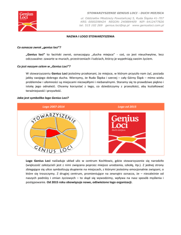 STOWARZYSZENIE GENIUS LOCI - DUCH MIEJSCA ul. Oddziałów Młodzieży Powstańczej 5, Ruda Śląska 41-707 KRS: 0000298424 REGON: 240884409 NIP: 6412477826 tel. 515 102 269 [email protected] www.geniusloci.com.pl NAZWA I LOGO STOWARZYSZENIA Co oznacza zwrot „genius loci”? „Genius loci” to łaciński zwrot, oznaczający „ducha miejsca” - coś, co jest nieuchwytne, lecz odczuwalne: zawarte w murach, przestrzeniach i ludziach, którzy je wypełniają swoim życiem. Co jest naszym celem w „Genius Loci”? W stowarzyszeniu Genius Loci jesteśmy przekonani, że miejsce, w którym przyszło nam żyć, posiada jakby swojego dobrego ducha. Wierzymy, że Ruda Śląska i szerzej – cały Górny Śląsk – mimo wielu problemów i ułomności są miejscami niezwykłymi i niebanalnymi. Staramy się to prawdziwe piękno i istotę jego odnaleźć. Chcemy korzystać z tego, co dziedziczymy z przeszłości, aby kształtować teraźniejszość i przyszłość. Jaka jest symbolika logo Genius Loci? Logo 2007-2014 Logo od 2015 Logo Genius Loci naśladuje układ ulic w centrum Kochłowic, gdzie stowarzyszenie się narodziło (większość założycieli jest z nimi związana poprzez miejsce urodzenia, szkołę, itp.). Z jednej strony zbiegające się ulice symbolizują skupienie na miejscach, z którymi jesteśmy emocjonalnie związani, o które się troszczymy. Z drugiej centrum, promieniujące na zewnątrz oznacza, że – niezależnie od naszych podróży i zmian życiowych – to skąd się wywodzimy, wpływa na nasz sposób myślenia i postępowanie. Od 2015 roku obowiązuje nowe, odświeżone logo organizacji.