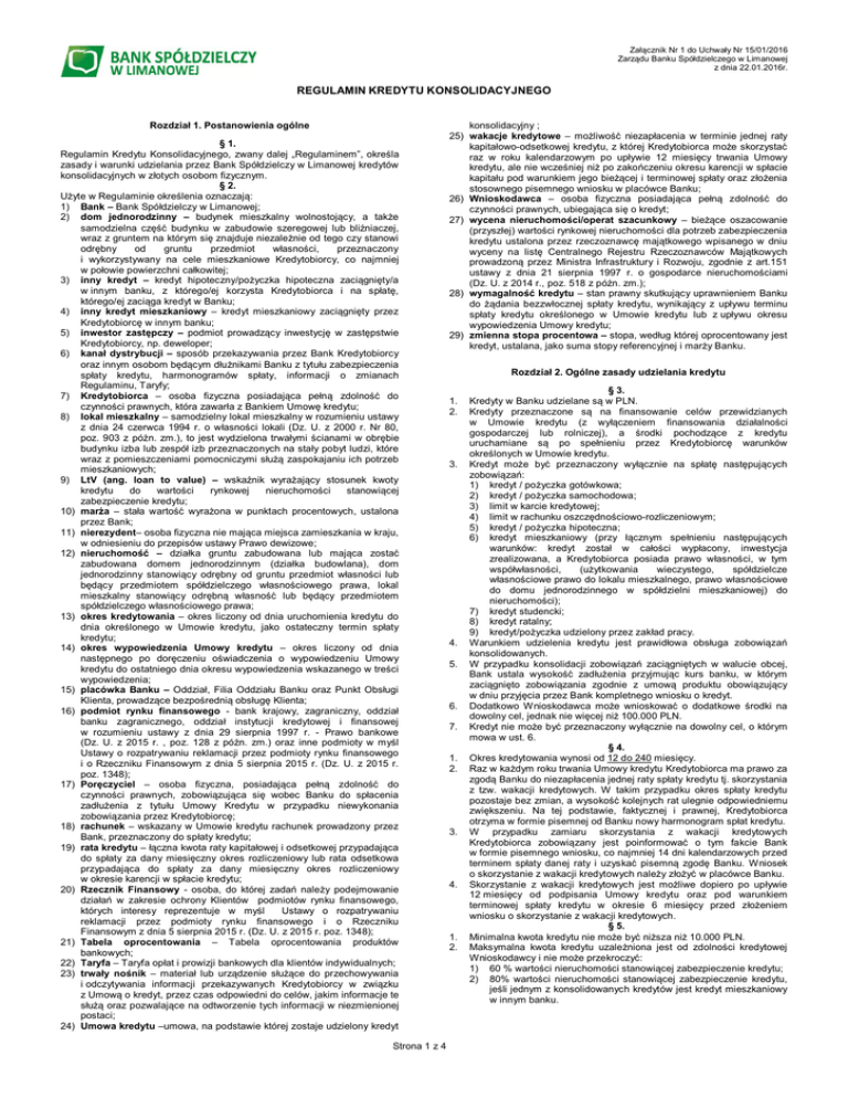 Załącznik Nr 1 do Uchwały Nr 15/01/2016 Zarządu Banku Spółdzielczego w Limanowej z dnia 22.01.2016r. REGULAMIN KREDYTU KONSOLIDACYJNEGO Rozdział 1. Postanowienia ogólne § 1. Regulamin Kredytu Konsolidacyjnego, zwany dalej „Regulaminem”, określa zasady i warunki udzielania przez Bank Spółdzielczy w Limanowej kredytów konsolidacyjnych w złotych osobom fizycznym. § 2. Użyte w Regulaminie określenia oznaczają: 1) Bank – Bank Spółdzielczy w Limanowej; 2) dom jednorodzinny – budynek mieszkalny wolnostojący, a także samodzielna część budynku w zabudowie szeregowej lub bliźniaczej, wraz z gruntem na którym się znajduje niezależnie od tego czy stanowi odrębny od gruntu przedmiot własności, przeznaczony i wykorzystywany na cele mieszkaniowe Kredytobiorcy, co najmniej w połowie powierzchni całkowitej; 3) inny kredyt – kredyt hipoteczny/pożyczka hipoteczna zaciągnięty/a w innym banku, z którego/ej korzysta Kredytobiorca i na spłatę, którego/ej zaciąga kredyt w Banku; 4) inny kredyt mieszkaniowy – kredyt mieszkaniowy zaciągnięty przez Kredytobiorcę w innym banku; 5) inwestor zastępczy – podmiot prowadzący inwestycję w zastępstwie Kredytobiorcy, np. deweloper; 6) kanał dystrybucji – sposób przekazywania przez Bank Kredytobiorcy oraz innym osobom będącym dłużnikami Banku z tytułu zabezpieczenia spłaty kredytu, harmonogramów spłaty, informacji o zmianach Regulaminu, Taryfy; 7) Kredytobiorca – osoba fizyczna posiadająca pełną zdolność do czynności prawnych, która zawarła z Bankiem Umowę kredytu; 8) lokal mieszkalny – samodzielny lokal mieszkalny w rozumieniu ustawy z dnia 24 czerwca 1994 r. o własności lokali (Dz. U. z 2000 r. Nr 80, poz. 903 z późn. zm.), to jest wydzielona trwałymi ścianami w obrębie budynku izba lub zespół izb przeznaczonych na stały pobyt ludzi, które wraz z pomieszczeniami pomocniczymi służą zaspokajaniu ich potrzeb mieszkaniowych; 9) LtV (ang. loan to value) – wskaźnik wyrażający stosunek kwoty kredytu do wartości rynkowej nieruchomości stanowiącej zabezpieczenie kredytu; 10) marża – stała wartość wyrażona w punktach procentowych, ustalona przez Bank; 11) nierezydent– osoba fizyczna nie mająca miejsca zamieszkania w kraju, w odniesieniu do przepisów ustawy Prawo dewizowe; 12) nieruchomość – działka gruntu zabudowana lub mająca zostać zabudowana domem jednorodzinnym (działka budowlana), dom jednorodzinny stanowiący odrębny od gruntu przedmiot własności lub będący przedmiotem spółdzielczego własnościowego prawa, lokal mieszkalny stanowiący odrębną własność lub będący przedmiotem spółdzielczego własnościowego prawa; 13) okres kredytowania – okres liczony od dnia uruchomienia kredytu do dnia określonego w Umowie kredytu, jako ostateczny termin spłaty kredytu; 14) okres wypowiedzenia Umowy kredytu – okres liczony od dnia następnego po doręczeniu oświadczenia o wypowiedzeniu Umowy kredytu do ostatniego dnia okresu wypowiedzenia wskazanego w treści wypowiedzenia; 15) placówka Banku – Oddział, Filia Oddziału Banku oraz Punkt Obsługi Klienta, prowadzące bezpośrednią obsługę Klienta; 16) podmiot rynku finansowego - bank krajowy, zagraniczny, oddział banku zagranicznego, oddział instytucji kredytowej i finansowej w rozumieniu ustawy z dnia 29 sierpnia 1997 r. - Prawo bankowe (Dz. U. z 2015 r. , poz. 128 z późn. zm.) oraz inne podmioty w myśl Ustawy o rozpatrywaniu reklamacji przez podmioty rynku finansowego i o Rzeczniku Finansowym z dnia 5 sierpnia 2015 r. (Dz. U. z 2015 r. poz. 1348); 17) Poręczyciel – osoba fizyczna, posiadająca pełną zdolność do czynności prawnych, zobowiązująca się wobec Banku do spłacenia zadłużenia z tytułu Umowy Kredytu w przypadku niewykonania zobowiązania przez Kredytobiorcę; 18) rachunek – wskazany w Umowie kredytu rachunek prowadzony przez Bank, przeznaczony do spłaty kredytu; 19) rata kredytu – łączna kwota raty kapitałowej i odsetkowej przypadająca do spłaty za dany miesięczny okres rozliczeniowy lub rata odsetkowa przypadająca do spłaty za dany miesięczny okres rozliczeniowy w okresie karencji w spłacie kredytu; 20) Rzecznik Finansowy - osoba, do której zadań należy podejmowanie działań w zakresie ochrony Klientów podmiotów rynku finansowego, których interesy reprezentuje w myśl Ustawy o rozpatrywaniu reklamacji przez podmioty rynku finansowego i o Rzeczniku Finansowym z dnia 5 sierpnia 2015 r. (Dz. U. z 2015 r. poz. 1348); 21) Tabela oprocentowania – Tabela oprocentowania produktów bankowych; 22) Taryfa – Taryfa opłat i prowizji bankowych dla klientów indywidualnych; 23) trwały nośnik – materiał lub urządzenie służące do przechowywania i odczytywania informacji przekazywanych Kredytobiorcy w związku z Umową o kredyt, przez czas odpowiedni do celów, jakim informacje te służą oraz pozwalające na odtworzenie tych informacji w niezmienionej postaci; 24) Umowa kredytu –umowa, na podstawie której zostaje udzielony kredyt Strona 1 z 4 konsolidacyjny ; 25) wakacje kredytowe – możliwość niezapłacenia w terminie jednej raty kapitałowo-odsetkowej kredytu, z której Kredytobiorca może skorzystać raz w roku kalendarzowym po upływie 12 miesięcy trwania Umowy kredytu, ale nie wcześniej niż po zakończeniu okresu karencji w spłacie kapitału pod warunkiem jego bieżącej i terminowej spłaty oraz złożenia stosownego pisemnego wniosku w placówce Banku; 26) Wnioskodawca – osoba fizyczna posiadająca pełną zdolność do czynności prawnych, ubiegająca się o kredyt; 27) wycena nieruchomości/operat szacunkowy – bieżące oszacowanie (przyszłej) wartości rynkowej nieruchomości dla potrzeb zabezpieczenia kredytu ustalona przez rzeczoznawcę majątkowego wpisanego w dniu wyceny na listę Centralnego Rejestru Rzeczoznawców Majątkowych prowadzoną przez Ministra Infrastruktury i Rozwoju, zgodnie z art.151 ustawy z 