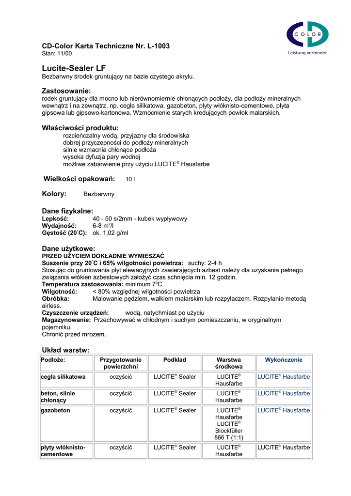 CD-Color Karta Techniczne Nr. L-1003 Stan: 11/00 Lucite-Sealer LF Bezbarwny środek gruntujący na bazie czystego akrylu. Zastosowanie: rodek gruntujący dla mocno lub nierównomiernie chłonących podłoży, dla podłoży mineralnych wewnątrz i na zewnątrz, np. cegła silikatowa, gazobeton, płyty włóknisto-cementowe, płyta gipsowa lub gipsowo-kartonowa. Wzmocnienie starych kredujących powłok malarskich. Właściwości produktu: rozcieńczalny wodą, przyjazny dla środowiska dobrej przyczepności do podłoży mineralnych silnie wzmacnia chłonące podłoża wysoka dyfuzja pary wodnej możliwe zabarwienie przy użyciu LUCITE® Hausfarbe Wielkości opakowań: Kolory: 10 l Bezbarwny Dane fizykalne: Lepkość: 40 - 50 s/2mm - kubek wypływowy Wydajność: 6-8 m2/l ° Gęstość (20 C): ok. 1,02 g/ml Dane użytkowe: PRZED UŻYCIEM DOKŁADNIE WYMIESZAĆ Suszenie przy 20°C i 65% wilgotności powietrza: suchy: 2-4 h Stosując do gruntowania płyt elewacyjnych zawierajęcych azbest należy dla uzyskania pełnego związania włókien azbestowych założyć czas schnięcia min. 12 godzin. Temperatura zastosowania: minimum 70C Wilgotność: < 80% względnej wilgotności powietrza Obróbka: Malowanie pędzlem, wałkiem malarskim lub rozpylaczem. Rozpylanie metodą airless. Czyszczenie urządzeń: wodą, natychmiast po użyciu Magazynowanie: Przechowywać w chłodnym i suchym pomieszczeniu, w oryginalnym pojemniku. Chronić przed mrozem. Układ warstw: Podłoże: Przygotowanie powierzchni Podkład Warstwa środkowa Wykończenie cegła silikatowa oczyścić LUCITE® Sealer LUCITE® Hausfarbe LUCITE® Hausfarbe beton, silnie chłonący oczyścić LUCITE® Sealer LUCITE® Hausfarbe LUCITE® Hausfarbe gazobeton oczyścić LUCITE® Sealer LUCITE® Hausfarbe LUCITE® Blockfüller 866 T (1:1) LUCITE® Hausfarbe płyty włóknistocementowe oczyścić LUCITE® Sealer LUCITE® Hausfarbe LUCITE® Hausfarbe powleczone płyty azbestowocementowe np. Glasel oczyścić1 LUCITE® Sealer LUCITE® Hausfarbe LUCITE® Hausfarbe płyty włóknistocementowe dachy oczyścić LUCITE® Sealer 1 x 2 LUCITE® Roof-Coat 2 LUCITE® Roof-Coat oczyścić i odkurzyć LUCITE® Sealer LUCITE® Inside LUCITE® Inside płyty gipsowe, płyty gipsowokartonowe 1 - W czasie przygotowywania (czyszczenia) elewacji i powierzchni dachowych zawierających azbest należy przestrzegać reguł technicznych dla substancji niebezpiecznych TRGS 519. 2 - Druga warstwa konieczna tylko przy powierzchniach silnie zwietrzałych. Informacje bezpieczeństwa: Utylizacja: Do recyklingu przeznaczać tylko puste puszki; niestwardniałe resztki należy przekazać do punktu odpadów specjalnych lub punktu odpadów szkodliwych i trudnych. Kod odpadów: 08 01 11 Kod produktu: M-GF-01 Wskazówki szczególne: Regularna kontrola i konserwacja jest konieczna, aby uniknąć szkód warstw i/lub elementów malowanych. Dlatego zaleca się wykonywanie regularnych ekspertyz stanu podłoża i farby oraz dokonywanie poprawek. Wskazówki ogólne: Podczas malowania i suszenia dokładnie wietrzyć pomieszczenie. W razie niedostatecznego wietrzenia i/lub stosowania rozpylacza należy używać ochronny aparat oddechowy. Niskie temperatury i/lub wysoka wilgotność powietrza utrudniają wyschnięcie malowanej powierzchni. Podłoże musi być czyste, suche, wyszlifowane, odtłuszczone, nie może zawierać substancji utrudniających przyczepność farby i musi być fachowo przygotowane. Należy przestrzegać VOB, część C, DIN 18363, pkt. 3. Nakładanie wałkiem malarskim lub rozpylaczem pozwala uzyskać cieńsze warstwy, ale wierzchnia warstwa będzie słabiej pokryta i grozi jej szybsze wycieranie. Chronić przed dziećmi. Należy przestrzegać instrukcji bezpieczeństwa. Trzymać z dala od dzieci i nie wlewać do kanalizacji. Powyższe dane zostały zebrane na podstawie najnowszego stanu techniki rozwoju i zastosowania. Zawierają one ogólne porady. Dane te opisują nasze produkty oraz informują o ich zastosowaniu i przeróbce. W ulotce tej nie jesteśmy w stanie opisać wszystkich występujących w praktyce rodzajów podłoża i sposobów ich obróbki malarskiej, dlatego w przypadku wątpliwości prosimy o kontakt z naszym działem technicznym pod numerem telefonu: + 49 2330 926628. Z chwilą pojawienia się nowej, uwarunkowanej postępem technicznym, edycji naszej ulotki technicznej wszelkie wcześniejsze dane tracą swoją ważność.