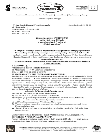 Projekt współfinansowany ze środków Unii Europejskiej w ramach Europejskiego Funduszu Społecznego Człowiek – najlepsza inwestycja Wyższa Szkoła Biznesu i Przedsiębiorczości ul. Akademicka 12 27-400 Ostrowiec Świętokrzyski tel. + 48 41 260 40 41 fax + 48 41 263 21 10 Ostrowiec Św., 2013-01-16 Zapytanie o cenę nr 4/WSBIP/2013/KZ z dnia 16 stycznia 2013 roku w ramach realizacji Projektu pt: „Kuźnia zawodowa” W związku z realizacją projektu współfinansowanego przez Unię Europejską w ramach Europejskiego Funduszu Społecznego, mając na względzie postanowienia i obowiązki wynikające ze stosowania zasady efektywnego zarządzania finansami Wyższa Szkoła Biznesu i Przedsiębiorczości w Ostrowcu Św., zaprasza do złożenia oferty cenowej w prowadzonym rozeznaniu cenowym na: zakup i dostarczenie wymienionych poniżej podręczników dla 80 uczestników Projektu „Kuźnia zawodowa” I. ZAMAWIAJĄCY Wyższa Szkoła Biznesu i Przedsiębiorczości ul. Akademicka 12, 27-400 Ostrowiec Świętokrzyski NIP: 661 125 95 98 REGON: 290698978 II. SZCZEGÓŁOWY OPIS PRZEDMIOTU ZAMÓWIENIA Przedmiotem zamówienia jest zakup i dostarczenie wymienionych poniżej podręczników dla 80 uczestników Projektu „ „Kuźnia zawodowa” współfinansowanego ze środków Europejskiego Funduszu Społecznego w ramach Programu Operacyjnego Kapitał Ludzki, Priorytet IX. Rozwój wykształcenia i kompetencji w regionach, Działanie 9.2. Podniesienie atrakcyjności i jakości szkolnictwa zawodowego, na podstawie umowy zawartej pomiędzy Wyższą Szkołę Biznesu i Przedsiębiorczości w Ostrowcu Świętokrzyskim a Instytucją Pośredniczącą - Świętokrzyskim Biurem Rozwoju Regionalnego w Kielcach. 1) podręczniki do Warsztatów informatycznych: a) Excel 2007 PL. Seria praktyk, Autor: Michael Price , b) ABC Word 2010 PL, Autor: Aleksandra Tomaszewska , c) Narzędzia google dla małych i średnich przedsiębiorstw. Poradnik bardzo praktyczny, 2) podręczniki do Akademii przedsiębiorczości: a) ABC small business'u, Autor: Włodzimierz Markowski, b) Trudne pytania na rozmowie o pracę, czyli jak odnieść sukces podczas rekrutacji, Autor: Katarzyna Półtoraczyk, c) Ryczałt, Karta podatkowa, podatkowa księga przychodów i rozchodów, ćwiczenia, Autor: Bożena Padurek. Zamówienie obejmuje dostarczenie i zakup 80 sztuk każdego z w.w. podręczników. III. TERMIN WYKONANIA ZAMÓWIENIA Termin wykonania przedmiotu zamówienia: 1) do 29 stycznia 2013 roku – 16 sztuk każdego z podręczników, 2) do 28 lutego 2013 roku – dla pozostałej części zamówienia. Projekt Kuźnia zawodowa realizowany przez Wyższą Szkołę Biznesu i Przedsiębiorczości w Ostrowcu Świętokrzyskim na podstawie umowy ze Świętokrzyskim Biurem Rozwoju Regionalnego w Kielcach pełniącym rolę Instytucji Pośredniczącej w ramach Działania 9.2 Programu Operacyjnego Kapitał Ludzki Projekt współfinansowany ze środków Unii Europejskiej w ramach Europejskiego Funduszu Społecznego Człowiek – najlepsza inwestycja IV. TRYB POSTĘPOWANIA Rozpoznanie rynku IV. OPIS SPOSBU PRZYGOTOWANIA OFERTY 1. Oferent powinien stworzyć ofertę na formularzu załączonym do niniejszego zapytania. Oferta powinna być: - posiadać datę sporządzenia, - zawierać adres lub siedzibę oferenta, numer telefonu, numer NIP, - podpisana przez wykonawcę V. MIEJSCE ORAZ TERMIN SKŁADANIA OFERT 1. Oferta powinna być przesłana za pośrednictwem: - poczty - wyłącznie usługa pocztex, kuriera lub też dostarczona osobiście na adres: ul. Akademicka 12, 27-400 Ostrowiec Św., do dnia 25 stycznia 2013 roku., do godziny 16.00 2. Ocena ofert zostanie dokonana w dniu 26 stycznia 2013 roku, a wyniki i wybór najkorzystniejszej oferty zostanie ogłoszony 28 stycznia 2013 roku o godzinie 8.30 w siedzibie Biura Projektu „Kuźnia zawodowa”, przy ul. Akademickiej 12 w Ostrowcu Św. 3. Oferty złożone po terminie nie będą rozpatrywane. 4. Oferent może przed upływem terminu składania ofert zmienić lub wycofać swoją ofertę. 5. W toku badania i oceny ofert Zamawiający może żądać od oferentów wyjaśnień dotyczących treści złożonych ofert. 6. Zapytanie o cenę zamieszczono na stronie: http://kuzniazawod.wsbip.edu.pl/ VI. OCENA OFERT Zamawiający dokona oceny ważnych ofert na podstawie kryterium ceny. VII. INFORMACJE DOTYCZĄCE WYBORU NAJKORZYSTNIEJSZEJ OFERTY Zostanie wybrana oferta z najniższą zaproponowana ceną. O wyborze najkorzystniejszej oferty Zamawiający zawiadomi oferentów podczas ogłoszenia wyników postępowania, tj. 28 stycznia 2013 roku o godzinie 8.30 lub telefonicznie (dotyczy oferentów, którzy nie stawią się na ogłoszeniu wyników). VIII. DODATKOWE INFORMACJE Dodatkowych informacji udziela Irena Wieczorek pod numerem telefonu + 48 41 260 40 41. IX. ZAŁĄCZNIKI Wzór formularza ofertowego. Projekt Kuźnia zawodowa realizowany przez Wyższą Szkołę Biznesu i Przedsiębiorczości w Ostrowcu Świętokrzyskim na podstawie umowy ze Świętokrzyskim Biurem Rozwoju Regionalnego w Kielcach pełniącym rolę Instytucji Pośredniczącej w ramach Działania 9.2 Programu Operacyjnego Kapitał Ludzki Projekt współfinansowany ze środków Unii Europejskiej w ramach Europejskiego Funduszu Społecznego Człowiek – najlepsza inwestycja Załącznik nr 1 do zapytania ofertowego nr 4/WSBIP/2013/KZ OFERTA CENOWA dla Wyższej Szkoły Biznesu i Przedsiębiorczości w Ostrowcu Św., ul. Akademicka 12 w związku z realizacją projektu współfinansowanego przez Unię Europejską w ramach Europejskiego Funduszu Społecznego Nawiązując do zapytania ofertowego nr 4/WSBIP/2013/KZ na zakup i dostarczenie wymienionych poniżej podręczników dla 80 uczestników Projektu „Kuźnia zawodowa” „Kuźnia zawodowa” współfinansowanego ze środków Europejskiego Funduszu Społecznego w ramach Programu Operacyjnego Kapitał Ludzki, Priorytet IX. Rozwój wykształcenia i kompetencji w regionach, Działanie 9.2. Podniesienie a