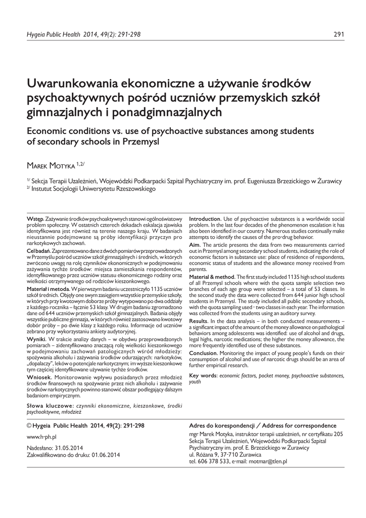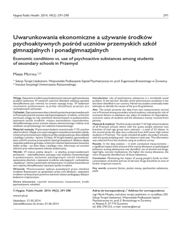 MotykaPublic Hygeia M. Uwarunkowania Health 2014, 49(2): ekonomiczne 291-298a używanie środków psychoaktywnych pośród uczniów ... 291 Uwarunkowania ekonomiczne a używanie środków psychoaktywnych pośród uczniów przemyskich szkół gimnazjalnych i ponadgimnazjalnych Economic conditions vs. use of psychoactive substances among students of secondary schools in Przemysl Marek Motyka 1,2/ 1/ 2/ Sekcja Terapii Uzależnień, Wojewódzki Podkarpacki Szpital Psychiatryczny im. prof. Eugeniusza Brzezickiego w Żurawicy Instutut Socjologii Uniwersytetu Rzeszowskiego Wstęp. Zażywanie środków psychoaktywnych stanowi ogólnoświatowy problem społeczny. W ostatnich czterech dekadach eskalacja zjawiska identyfikowana jest również na terenie naszego kraju. W badaniach nieustannie podejmowane są próby identyfikacji przyczyn pro narkotykowych zachowań. Cel badań. Zaprezentowano dane z dwóch pomiarów przeprowadzonych w Przemyślu pośród uczniów szkół gimnazjalnych i średnich, w których zwrócono uwagę na rolę czynników ekonomicznych w podejmowaniu zażywania tychże środków: miejsca zamieszkania respondentów, identyfikowanego przez uczniów statusu ekonomicznego rodziny oraz wielkości otrzymywanego od rodziców kieszonkowego. Materiał i metoda. W pierwszym badaniu uczestniczyło 1135 uczniów szkół średnich. Objęły one swym zasięgiem wszystkie przemyskie szkoły, w których przy kwotowym doborze próby wytypowano po dwa oddziały z każdego rocznika – łącznie 53 klasy. W drugim badaniu zgromadzono dane od 644 uczniów przemyskich szkół gimnazjalnych. Badania objęły wszystkie publiczne gimnazja, w których również zastosowano kwotowy dobór próby – po dwie klasy z każdego roku. Informacje od uczniów zebrano przy wykorzystaniu ankiety audytoryjnej. Wyniki. W trakcie analizy danych – w obydwu przeprowadzonych pomiarach – zidentyfikowano znaczącą rolę wielkości kieszonkowego w podejmowaniu zachowań patologicznych wśród młodzieży: spożywania alkoholu i zażywania środków odurzających: narkotyków, „dopalaczy”, leków o potencjale narkotycznym; im wyższe kieszonkowe tym częściej identyfikowane używanie tychże środków. Wniosek. Monitorowanie wpływu posiadanych przez młodzież środków finansowych na spożywanie przez nich alkoholu i zażywanie środków narkotycznych powinno stanowić obszar podlegający dalszym badaniom empirycznym. Introduction. Use of psychoactive substances is a worldwide social problem. In the last four decades of the phenomenon escalation it has also been identified in our country. Numerous studies continually make attempts to identify the causes of the pro-drug behavior. Aim. The article presents the data from two measurements carried out in Przemysl among secondary school students, indicating the role of economic factors in substance use: place of residence of respondents, economic status of students and the allowance money received from parents. Material & method. The first study included 1135 high school students of all Przemysl schools where with the quota sample selection two branches of each age group were selected – a total of 53 classes. In the second study the data were collected from 644 junior high school students in Przemysl. The study included all public secondary schools, with the quota sampling used - two classes in each year. The information was collected from the students using an auditory survey. Results. In the data analysis – in both conducted measurements – a significant impact of the amount of the money allowance on pathological behaviors among adolescents was identified: use of alcohol and drugs, legal highs, narcotic medications; the higher the money allowance, the more frequently identified use of these substances. Conclusion. Monitoring the impact of young people’s funds on their consumption of alcohol and use of narcotic drugs should be an area of further empirical research. Key words: economic factors, pocket money, psychoactive substances, youth Słowa kluczowe: czynniki ekonomiczne, kieszonkowe, środki psychoaktywne, młodzież © Hygeia Public Health 2014, 49(2): 291-298 Adres do korespondencji / Address for correspondence www.h-ph.pl mgr Marek Motyka, instruktor terapii uzależnień, nr certyfikatu 205 Sekcja Terapii Uzależnień, Wojewódzki Podkarpacki Szpital Psychiatryczny im. prof. E. Brzezickiego w Żurawicy ul. Różana 9, 37-710 Żurawica tel. 606 378 533, e-mail: [email protected] Nadesłano: 31.05.2014 Zakwalifikowano do druku: 01.06.2014 Hygeia Public Health 2014, 49(2): 291-298 292 Wprowadzenie Zjawisko zażywania środków psychoaktywnych – zarówno na Świecie, jak i na rodzimej scenie narkotykowej – charakteryzuje się w ostatnich czterech dekadach spektakularną dynamiką. Korzystanie z tego typu specyfików stało się zjawiskiem masowym, obejmującym różne grupy społeczne [1-3]. W teoretycznych ujęciach sięganie po odurzające medykamenty niemal zawsze determinowane było przez czynniki ekonomiczne. Według Roberta Mertona głównym źródłem zachowań dewiacyjnych – do których zaliczał m.in. narkomanię – są nieprawidłowości występujące w strukturze społecznej [4]. Analizując społeczeństwo amerykańskie i jego dynamiczny rozwój, zwrócił on uwagę na odbiegające od powszechnie przyjętych ustanowień zachowania tej części społeczeństwa, która z braku możliwości realizacji kulturowo wyznaczonych celów – w tym wypadku szeroko rozumianego sukcesu, zwłaszcza ekonomicznego – poszukiwała innych możliwości zaspokojenia swoich potrzeb, bądź złagodzenia goryczy wynikającej z braku zasobów umożliwiających osiągnięcie owego sukcesu [5]. Również Zygmunt Bauman zwrócił uwagę na skłonności do zażywania narkotyków pośród osób zmarginalizowanych, pochodzących z „obszarów nędzy” pragnących uzyskać poprzez stany odurzenia namiastkę ekstatycznych, radosnych doznań doświadczanych przez 