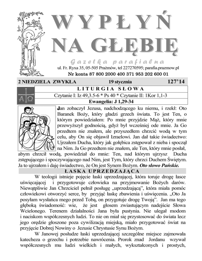 WYPŁYŃ NA GŁĘBIĘ Gazetka parafialna ul. Fr. Ryxa 35, 05-505 Prażmów, tel 227270595; parafia.prazmow.pl Nr konta 87 800 2000 400 371 953 202 600 01 2 NIEDZIELA ZWYKŁA 19 stycznia 127’14 LITURGIA SŁOWA Czytanie I: Iz 49,3.5-6 * Ps 40 * Czytanie II: 1Kor 1,1-3 Ewangelia: J 1,29-34 Jan zobaczył Jezusa, nadchodzącego ku niemu, i rzekł: Oto Baranek Boży, który gładzi grzech świata. To jest Ten, o którym powiedziałem: Po mnie przyjdzie Mąż, który mnie przewyższył godnością, gdyż był wcześniej ode mnie. Ja Go przedtem nie znałem, ale przyszedłem chrzcić wodą w tym celu, aby On się objawił Izraelowi. Jan dał takie świadectwo: Ujrzałem Ducha, który jak gołębica zstępował z nieba i spoczął na Nim. Ja Go przedtem nie znałem, ale Ten, który mnie posłał, abym chrzcił wodą, powiedział do mnie: Ten, nad którym ujrzysz Ducha zstępującego i spoczywającego nad Nim, jest Tym, który chrzci Duchem Świętym. Ja to ujrzałem i daję świadectwo, że On jest Synem Bożym. Oto słowo Pańskie. Ł A S K A U P R Z E D ZA J Ą C A W teologii istnieje pojęcie łaski uprzedzającej, która toruje drogę łasce uświęcającej i przygotowuje człowieka na przyjmowanie Bożych darów. Niewątpliwie Jan Chrzciciel pełnił posługę „uprzedzającą”, która miała pomóc człowiekowi otworzyć serce, by przyjąć łaskę zbawienia i uświęcenia. „Oto Ja posyłam wysłańca mego przed Tobą, on przygotuje drogę Twoją”. Jan ma tego głęboką świadomość: wie, że jest głosem zwiastującym nadejście Słowa Wcielonego. Terenem działalności Jana była pustynia. Nie ulegał modom i naciskom współczesnych ludzi. To nie on miał się przystosować do świata lecz jego orędzie głoszone poza cywilizacją miejską, miało przygotować świat na przyjęcie Dobrej Nowiny o Jezusie Chrystusie Synu Bożym. W Janowej posłudze łaski uprzedzającej szczególne miejsce zajmowała katecheza o grzechu i potrzebie nawrócenia. Prorok znad Jordanu wzywał współczesnych mu ludzi wielkich i małych, wykształconych i prostych, pobożnych i zagubionych do stawania w prawdzie. Wyznawali przecież przed nim swoje grzechy. Jednak Chrzciciel nie udzielał rozgrzeszenia, bo nie miał takiej władzy. Pamiętamy, że gdy Pan Jezus powiedział do paralityka: „odpuszczone są ci twoje grzechy”, faryzeusze byli oburzeni i mówili: „Kimże on jest, że wypowiada bluźnierstwa? Któż może odpuścić grzechy prócz samego Boga” (por. Łk 5, 20-21). Z pewnością nikomu do głowy nie przyszło, że Jan ma władzę odpuszczania grzechów. Sam prorok wie, że jest głosem wzywającym do skruchy, ale po nim idzie mocniejszy, to znaczy Ten, który jest Miłością i miłosierdziem samym i ma władzę odpuszczania grzechów. Zadziwiająca jest pokora Jana, czyli życie w prawdzie. Wie kim jest, zna swoje miejsce, nie szuka próżnej chwały, nie skupia na sobie. „Idzie za mną mocniejszy ode mnie, a ja nie jestem godzien, aby się schylić i rozwiązać rzemyk u Jego sandałów. Ja chrzciłem was wodą, On zaś chrzcić was będzie Duchem Świętym”. Dzisiejsza Ewangelia jest kontynuacją opisu wydarzeń sprzed tygodnia. Chrzest Chrystusa w Jordanie, świadectwo Boga Ojca - „Ten jest mój Syn umiłowany”, oraz niezwykły znak zstępującej gołębicy - Ducha Świętego, były dla Jana Chrzciciela namacalnym potwierdzeniem, że jego misja dobiega kresu. Posłannictwo ostatniego proroka Starego Przymierza osiąga punkt kulminacyjny, gdy wskazuje na swego kuzyna - Jezusa z Nazaretu - i obwieszcza światu, że jest On Barankiem Bożym, który przyszedł zgładzić grzech świata i przewyższa godnością każdego człowieka, bo jest Synem Bożym. Jan wskazując na Chrystusa przedstawia Go jako Tego, który gładzi grzech świata. Zauważmy, że św. Jan używa liczby pojedynczej. Tak o grzechu świata pisze Andre Frossard: „Jest tylko jeden grzech, a wszystkie inne są jego zatrutymi gałęziami – a jest nim wybieranie siebie. Zbawienie przyszło nas szukać właśnie w głębi tej studni. I dusza ludzka wyciągnięta na światło, wyzwolona ze swej pychy z zachwytem zobaczyła, że wobec miłosnej szczodrości Boga bycie niczym stało się decydującą korzyścią” (Credo, Paryż 1983, 54). Dlatego Jan nazywa Chrystusa Barankiem, On bowiem jest cichy i pokornego serca i wybawia nas z niewoli pychy grzechu pierworodnego poprzez ofiarną miłość aż do śmierci i to śmierci krzyżowej. Jan mówi: „Oto Baranek Boży” i za chwilę: „On jest Synem Bożym”. To niesamowite zestawienie dwóch, po ludzku wykluczających się rzeczywistości: słabość baranka i wszechmoc Syna Bożego. Jakże często oczekujemy od Boga mocy w naszym rozumieniu. Często słyszę zarzut: „Dlaczego Bóg nic nie robi skoro tyle zła na świecie? Dlaczego nieprawość tak często zwycięża i odnosi sukces?” Pamiętamy wydarzenie z Ewangelii, gdy Jan i Jakub chcieli modlić się, aby Bóg zesłał pioruny na jedno z miasteczek samarytańskich, które nie udzieliło gościny Chrystusowi i Jego uczniom. Wciąż mamy ludzkie oczekiwania wobec Wszechmocy Boga. Dlatego w centrum naszej wiary jest Baranek ukrzyżowany i bezbronny. Jeśli jestem zjednoczony z Chrystusem, którego przyjmuję 2 w Eucharystii, jeśli wzrok mam utkwiony w Jego ranach, czy mogę mieć pretensje, że nie używa swej mocy, by zniszczyć moich wrogów? Szatan zrobi wszystko, by wmówić nam, że wróg jest na zewnątrz. Ale Chrystus zaprasza nas do walki wewnętrznej o zwycięstwo miłości w naszych sercach. Wszyscy przegotowujemy się na ostateczną godzinę próby. A będzie to doświadczenie największej słabości: choroba, cierpienie, starość, śmierć. Oczekujemy na kanonizację błogosławionego Jana Pawła II, która nastąpi w niedzielę Miłosierdzia. Ileż razy ten wielki świadek prawdy i miłości, sprawując Eucharystię w różnych miejscach świata, ukazywał człowiekowi Jezusa w Najświ