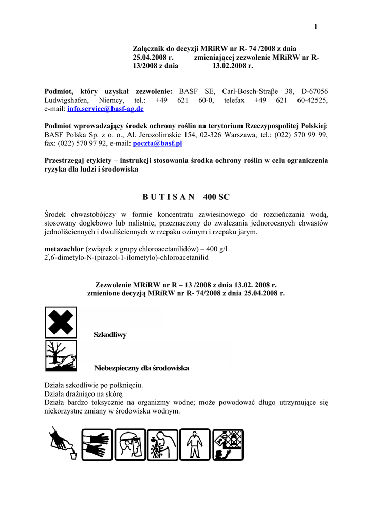 1 Załącznik do decyzji MRiRW nr R- 74 /2008 z dnia 25.04.2008 r. zmieniającej zezwolenie MRiRW nr R13/2008 z dnia 13.02.2008 r. Podmiot, który uzyskał zezwolenie: BASF SE, Carl-Bosch-Straβe 38, D-67056 Ludwigshafen, Niemcy, tel.: +49 621 60-0, telefax +49 621 60-42525, e-mail: [email protected] Podmiot wprowadzający środek ochrony roślin na terytorium Rzeczypospolitej Polskiej: BASF Polska Sp. z o. o., Al. Jerozolimskie 154, 02-326 Warszawa, tel.: (022) 570 99 99, fax: (022) 570 97 92, e-mail: [email protected] Przestrzegaj etykiety – instrukcji stosowania środka ochrony roślin w celu ograniczenia ryzyka dla ludzi i środowiska BUTISAN 400 SC Środek chwastobójczy w formie koncentratu zawiesinowego do rozcieńczania wodą, stosowany doglebowo lub nalistnie, przeznaczony do zwalczania jednorocznych chwastów jednoliściennych i dwuliściennych w rzepaku ozimym i rzepaku jarym. metazachlor (związek z grupy chloroacetanilidów) – 400 g/l 2',6'-dimetylo-N-(pirazol-1-ilometylo)-chloroacetanilid Zezwolenie MRiRW nr R – 13 /2008 z dnia 13.02. 2008 r. zmienione decyzją MRiRW nr R- 74/2008 z dnia 25.04.2008 r. Szkodliwy Niebezpieczny dla środowiska Działa szkodliwie po połknięciu. Działa drażniąco na skórę. Działa bardzo toksycznie na organizmy wodne; może powodować długo utrzymujące się niekorzystne zmiany w środowisku wodnym. 2 Uwaga! 1. Zabrania się stosowania środka e strefie bezpośredniej ochrony ujęć wody oraz na terenie uzdrowisk, otulin parków narodowych i rezerwatów. 2. Nie zanieczyszczać wód środkiem ochrony roślin lub jego opakowaniem. DZIAŁANIE NA CHWASTY Środek pobierany jest poprzez korzenie kiełkujących chwastów i niszczy je przed wschodami. Działa również na chwasty po wschodach do fazy pierwszej pary liści. Chwasty wrażliwe np.: chwastnica jednostronna, jasnota purpurowa, jasnota różowa, komosa biała, maruna bezwonna, miotła zbożowa, przytulia czepna, rumian polny, stulicha psia, tasznik pospolity, tobołki polne. Chwasty średnio wrażliwe np.: fiołek polny, rdest powojowy, rdest ptasi. Chwasty odporne np.: ostrożeń polny, perz właściwy, powój polny, rzodkiew świrzepa, wilczomlecz obrotny. ZAKRES STOSOWANIA, TERMINY I DAWKI rzepak jary Środek stosować bezpośrednio po siewie rzepaku, na starannie uprawioną glebę (bez grud). Nasiona rzepaku wysiewać na jednakową głębokość i dokładnie przykryć ziemią. Zalecana dawka: 2,5 l/ha. rzepak ozimy Środek stosować bezpośrednio po siewie rzepaku, na starannie uprawioną (bez grud) glebę. Nasiona rzepaku wysiać na jednakową głębokość i dokładnie przykryć ziemią. Zalecana dawka: 2,5 l/ha. W celu zwiększenia zakresu zwalczanych gatunków chwastów środek można stosować w tym terminie łącznie ze środkiem Command 480 EC w dawce: Butisan 400 SC 2,0 l/ha + Command 480 EC 0,15 - 0,2 l/ha. Uwaga Mieszaniny ze środkiem Command 480 EC nie stosować na glebach lekkich (piaszczystych). Podczas stosowania tej mieszaniny przestrzegać ściśle zaleceń, przeciwwskazań, środków ostrożności zawartych w etykiecie-instrukcji stosowania środka Command 480 EC. UWAGI 1. Niższe z zalecanych dawki środków Butisan 400 SC i Command 480 EC stosować na glebach lżejszych, a wyższe na glebach cięższych, o dużej zawartości próchnicy i w warunkach silnego zachwaszczenia. 2. Po opryskaniu pola nie wykonywać żadnych zabiegów pielęgnacyjnych. 3. Silne opady deszczu po zabiegu mogą spowodować zahamowanie wzrostu roślin, przerzedzenie łanu lub deformację liści rzepaku, zwłaszcza w niskich temperaturach. Objawy te są szczególnie widoczne wówczas, gdy rzepak uprawia się na glebach lekkich i piaszczystych, mają one jednak charakter przejściowy i nie wpływają na przezimowanie oraz plonowanie rzepaku. Zalecana ilość wody: 200-300 l/ha. Zalecane opryskiwanie: średniokropliste. 3 NASTĘPSTWO ROŚLIN Środek rozkłada się w okresie wegetacji nie stwarzając zagrożenia dla roślin uprawianych następczo. W przypadku konieczności wcześniejszego zaorania plantacji traktowanej środkiem Butisan 400 SC (w wyniku uszkodzenia roślin przez mrozy, choroby lub szkodniki) po wykonaniu orki wiosennej (na głębokość około 15 cm) można uprawiać rzepak jary, ziemniaki, kukurydzę, zboża jare lub rośliny kapustne. W przypadku konieczności zlikwidowania plantacji jesienią można (po wykonaniu płytkiej uprawy) wysiać ponownie rzepak, po wcześniejszym zaoraniu na głębokość 20 cm, poczynając od końca września można uprawiać zboża ozime. Podczas stosowania mieszaniny ze środkiem Command 480 EC przestrzegać zaleceń następstwa roślin zgodnie z etykietą - instrukcją stosowania środka Command 480 EC. PRZECIWWSKAZANIA Środka nie stosować w czasie wschodów rzepaku. Podczas stosowania środka nie dopuścić do: - znoszenia cieczy użytkowej na sąsiednie plantacje roślin uprawnych - nakładania się cieczy użytkowej na stykach pasów zabiegowych i uwrociach. OKRES PREWENCJI DLA LUDZI, ZWIERZĄT, PSZCZÓŁ (okres zapobiegający zatruciu): NIE DOTYCZY OKRES KARENCJI (okres od dnia ostatniego zabiegu do dnia zbioru roślin przeznaczonych do konsumpcji): rzepak jary, rzepak ozimy - NIE DOTYCZY SPORZĄDZANIE CIECZY UŻYTKOWEJ Przed przystąpieniem do sporządzania cieczy użytkowej dokładnie ustalić potrzebną jej ilość. Zawartością opakowania przed użyciem wstrząsnąć. Odmierzoną ilość środka wlać do zbiornika opryskiwacza napełnionego częściowo wodą (z włączonym mieszadłem) i uzupełnić wodą do potrzebnej ilości. Po wlaniu środka do zbiornika opryskiwacza nie wyposażonego w mieszadło hydrauliczne ciecz w zbiorniku mechanicznie wymieszać. W przypadku stosowania mieszaniny ze środkiem Command 480 EC, przygotować ciecz użytkową środka Butisan 400 SC w połowie wymaganej ilości wody, dodać Command 480 EC i uzupełnić wodą do wymaganej ilości. Opróżnione opakowania przepłukać trzykrotnie wodą, a po
