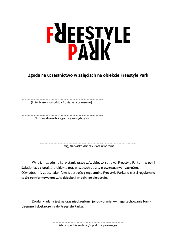 Zgoda na uczestnictwo w zajęciach na obiekcie Freestyle Park