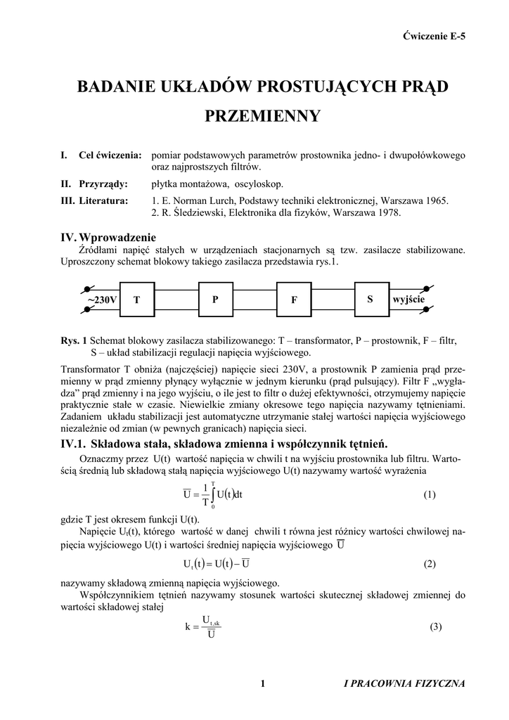 Ćwiczenie E-5 BADANIE UKŁADÓW PROSTUJĄCYCH PRĄD PRZEMIENNY I. Cel ćwiczenia: pomiar podstawowych parametrów prostownika jedno- i dwupołówkowego oraz najprostszych filtrów. II. Przyrządy: płytka montażowa, oscyloskop. III. Literatura: 1. E. Norman Lurch, Podstawy techniki elektronicznej, Warszawa 1965. 2. R. Śledziewski, Elektronika dla fizyków, Warszawa 1978. IV. Wprowadzenie Źródłami napięć stałych w urządzeniach stacjonarnych są tzw. zasilacze stabilizowane. Uproszczony schemat blokowy takiego zasilacza przedstawia rys.1. ~230V P T F S wyjście Rys. 1 Schemat blokowy zasilacza stabilizowanego: T – transformator, P – prostownik, F – filtr, S – układ stabilizacji regulacji napięcia wyjściowego. Transformator T obniża (najczęściej) napięcie sieci 230V, a prostownik P zamienia prąd przemienny w prąd zmienny płynący wyłącznie w jednym kierunku (prąd pulsujący). Filtr F „wygładza” prąd zmienny i na jego wyjściu, o ile jest to filtr o dużej efektywności, otrzymujemy napięcie praktycznie stałe w czasie. Niewielkie zmiany okresowe tego napięcia nazywamy tętnieniami. Zadaniem układu stabilizacji jest automatyczne utrzymanie stałej wartości napięcia wyjściowego niezależnie od zmian (w pewnych granicach) napięcia sieci. IV.1. Składowa stała, składowa zmienna i współczynnik tętnień. Oznaczmy przez U(t) wartość napięcia w chwili t na wyjściu prostownika lub filtru. Wartością średnią lub składową stałą napięcia wyjściowego U(t) nazywamy wartość wyrażenia T U= 1 U(t )dt T ∫0 (1) gdzie T jest okresem funkcji U(t). Napięcie Ut(t), którego wartość w danej chwili t równa jest różnicy wartości chwilowej napięcia wyjściowego U(t) i wartości średniej napięcia wyjściowego U U t (t ) = U (t ) − U (2) nazywamy składową zmienną napięcia wyjściowego. Współczynnikiem tętnień nazywamy stosunek wartości skutecznej składowej zmiennej do wartości składowej stałej U k = t ,sk (3) U 1 I PRACOWNIA FIZYCZNA Ćwiczenie E-5 T U t ,sk = gdzie 1 U t (t )dt T ∫0 (4) Współczynnik tętnień k jest miarą efektywności filtru. Wartości skuteczne napięcia wyjściowego i składowej zmiennej spełniają zależność U sk2 = U 2 + U t2, sk (5) Zależność (5) wynika z definicji wartości skutecznej i średniej. [W literaturze można spotkać oznaczenie wartości skutecznej indeksem RMS (URMS). Jest to skrót angielskiego terminu „średni pierwiastek kwadratowy”.] IV.2. Prostownik jednopołówkowy (półfalowy) i dwupołówkowy. Prostownik jednopołówkowy. Najprostszym prostownikiem jest pojedyncza dioda półprzewodnikowa, przez którą zaczyna płynąć prąd w kierunku przewodzenia, gdy różnica potencjałów między wyprowadzeniami elektrycznymi obszarów "p" i "n" półprzewodnika staje się większa od napięcia dyfuzyjnego Ud niespolaryzowanego zewnętrznym napięciem złącza p-n. W momencie, gdy różnica potencjałów ponownie osiąga wartość napięcia dyfuzyjnego Ud , w obwodzie przestaje płynąć prąd w kierunku przewodzenia. Po obniżeniu się napięcia poniżej wartości Ud przez złącze płynie prąd w kierunku zaporowym, ale natężenie tego prądu jest mniejsze od natężenia prądu przewodzenia o kilka rzędów wielkości. Amplituda napięcia przemiennego w takim obwodzie musi być mniejsza od wartości bezwzględnej napięcia przebicia lawinowego diody. Schemat prostownika jednopołówkowego przedstawia rys.2a. ∼ Uwe R ∼ U(t) Uwe R U(t) b) a) Uwe ∼ R U(t) Uwe c) Rys. 2 Prostownik: a) jednopołówkowy, b) dwupołówkowy w układzie mostkowym (Graetza), c) dwupołówkowy z dzielonym uzwojeniem transformatora. 2 I PRACOWNIA FIZYCZNA Ćwiczenie E-5 Dla idealnego prostownika o zerowym oporze elektrycznym w stanie przewodzenia i nieskończonym oporze w stanie spolaryzowania zaporowego oraz przy założeniu, że Ud jest bardzo małe (Ud = 0) napięcie wyjściowe U(t) będzie równe U(t ) = U o sin (ωt ) dla U we (t ) > 0 i (6) U (t ) = 0 dla U we (t ) < 0 . Przebieg napięcia na wyjściu prostownika jednopołówkowego przedstawia rys.3a. U a) Usk Uo U 1 2 T T 3 2 T 2T T 3 2 T 2T t U b) 1 2 T t Rys. 3 Napięcie wyjściowe z prostownika jednopołówkowego a) i dwupołówkowego b). Wartość średnia przedstawionego napięcia na rys.3a wynosi T U U U = o ∫ sin ωtdt = o , π T 0 (7) zaś wartość skuteczna T U sk = U o2 U sin 2 ωtdt = o , ∫ T 0 2 (8) gdzie T jest okresem napięcia przemiennego a Uo amplitudą. [Dla napięcia przemiennego sinusoidalnego wartość skuteczna jest równa Uo/ 2 , natomiast wartość średnia wynosi zero]. Prostownik dwupołówkowy. Zasadniczą wadą prostownika jednopołówkowego jest to, że przewodzi on co najwyżej w czasie połowy okresu napięcia przemiennego. Wady tej pozbawiony jest prostownik dwupołówkowy, przedstawiony na rysunku 2b i 2c. Dla idealnych elementów prostujących wartość średnia napięcia pulsującego na wyjściu prostownika dwupołówkowego jest równa 2U o U= (9) π a wartość skuteczna 3 I PRACOWNIA FIZYCZNA Ćwiczenie E-5 Uo (10) 2 Przebieg U(t) pokazany na rysunku 4c reprezentuje wypadkowy przebieg napięcia na wyjściu prostownika jednopołówkowego; Ut jest składową zmienną (rys.4b), U jest składową stałą (rys.4a) tego napięcia zmiennego. U sk = U a) U 0 t Ut T Ut b) 0 t U(t) U(t) c) 0 1 2 3 2 T T T 2T t Rys.4 Nakładanie się napięcia zmiennego i stałego na wyjściu prostownika. Skorzystajmy z zależności (5) i obliczymy Ut, sk tętnień U t2, sk = U sk2 − U 2 gdzie Usk jest wartością skuteczną napięcia U(t) na wyjściu prostownika lub filtru. W przypadku prostownika jednopołówkowego mamy 2 2 U U U 2t , sk = o − o 2 π 1 1 U t , sk = U o − = 0,386U o 4 π2 U 0,386U o k pr = t , sk = = 1,21 U 0,318U o kpr jest współczynnikiem tętnień prostownika. Dla prostownika dwupołówkowego mamy 1 4 U t , sk = U o − = 0,307 U o 2 π2 4 I PRACOWNIA FIZYCZNA Ćwiczenie E-5 k pr = U t , sk = 0,482 
