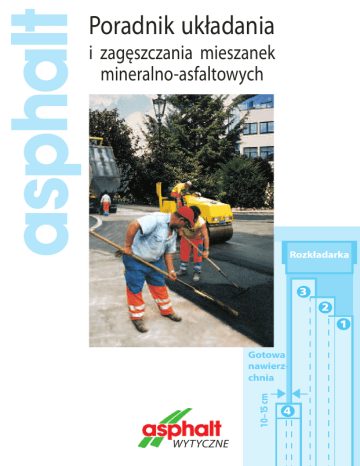 Poradnik układania i zagęszczania mieszanek mineralno-asfaltowych Rozkładarka 10–15 cm Gotowa nawierzchnia WYTYCZNE Poradnikukładaniaizagęszczania mieszanekmineralno-asfaltowych 1 Przygotowaniepodłoża .....................................................................................2 Podłoża niezwiązane ..............................................................................................2 Podłoża związane ....................................................................................................2 2 Zamawianieiodbiórmieszanki......................................................................6 Zamawianie mieszanki ..........................................................................................6 Odbiór zamówionej mieszanki............................................................................7 3 Transportmieszanki ............................................................................................8 4 Ocenamieszankiprzedwbudowaniem....................................................10 Pomiar temperatury..............................................................................................10 Wzrokowa ocena mieszanki ..............................................................................11 Mieszanka prawidłowa ..................................................................................11 Mieszanka zbyt zimna ....................................................................................12 Mieszanka przegrzana ....................................................................................12 Dalsze postępowanie z mieszankami, dla których podczas oceny wzrokowej stwierdzono wady............................................13 Mieszanka zbyt zimna ....................................................................................13 Mieszanka przegrzana ....................................................................................13 5 Układaniemieszanki..........................................................................................14 Prace przygotowawcze ........................................................................................14 Reguły układania....................................................................................................16 Kontrola układania ................................................................................................17 Układanie ręczne....................................................................................................18 Układanie w chłodnych porach roku..............................................................19 Układanie podczas opadów ..............................................................................19 6 Zagęszczaniemieszanki ..................................................................................20 Reguły zagęszczania ............................................................................................20 Przygotowanie walców........................................................................................22 Przejazd walca ........................................................................................................23 Podstawowe zasady wałowania mieszanek mineralno-asfaltowych ........................................................................................23 Błędy zagęszczania ................................................................................................26 7 Szorstkość ...............................................................................................................28 Układanie i zagęszczanie ....................................................................................28 Zasady ........................................................................................................................28 8 Specjalnerodzajeukładania– wskazówki Kompaktowe warstwy asfaltowe (kompaktasfalt) ..........................................29 Czynności przygotowawcze ..............................................................................29 Prace przygotowawcze przed rozpoczęciem układania ..........................29 Podczas układania ..................................................................................................30 Asfalty porowate ..........................................................................................................30 Czynności przygotowawcze ..............................................................................30 Przygotowania przed układaniem ..................................................................31 Podczas układania ..................................................................................................31 Asfalty niskotemperaturowe....................................................................................32 Czynności wstępne ................................................................................................32 Przygotowania przed układaniem ..................................................................32 Podczas układania ..................................................................................................32 Nawierzchnie rozjaśniane ........................................................................................33 Nawierzchnie asfaltowe na górnej powierzchni nasypu kolejowego ......33 Budowle wodne i składowiska odpadów............................................................33 Nawierzchnie ograniczające występowanie gołoledzi ..................................34 Nawierzchnie kolorowe ............................................................................................34 9 Złączaispoiny ............................................................................................................35 Reguły ..............................................................................................................................35 Złącza podłużne...........