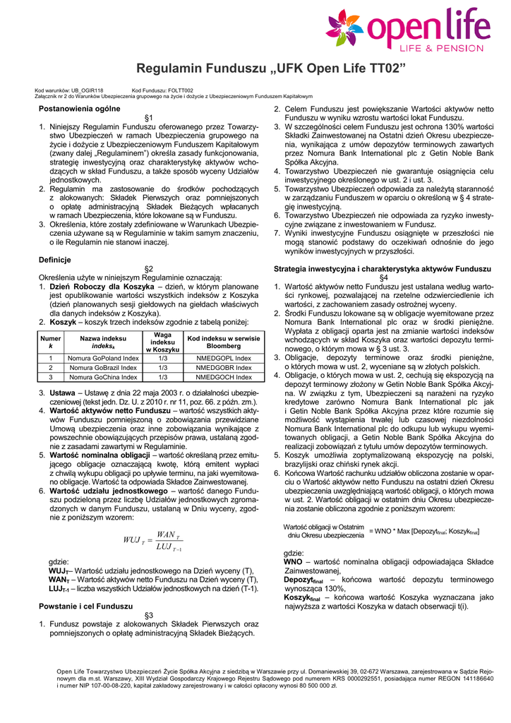 Regulamin Funduszu „UFK Open Life TT02” Kod warunków: UB_OGIR118 Kod Funduszu: FOLTT002 Załącznik nr 2 do Warunków Ubezpieczenia grupowego na życie i dożycie z Ubezpieczeniowym Funduszem Kapitałowym Postanowienia ogólne §1 1. Niniejszy Regulamin Funduszu oferowanego przez Towarzystwo Ubezpieczeń w ramach Ubezpieczenia grupowego na życie i dożycie z Ubezpieczeniowym Funduszem Kapitałowym (zwany dalej „Regulaminem”) określa zasady funkcjonowania, strategię inwestycyjną oraz charakterystykę aktywów wchodzących w skład Funduszu, a także sposób wyceny Udziałów jednostkowych. 2. Regulamin ma zastosowanie do środków pochodzących z alokowanych: Składek Pierwszych oraz pomniejszonych o opłatę administracyjną Składek Bieżących wpłacanych w ramach Ubezpieczenia, które lokowane są w Funduszu. 3. Określenia, które zostały zdefiniowane w Warunkach Ubezpieczenia używane są w Regulaminie w takim samym znaczeniu, o ile Regulamin nie stanowi inaczej. 2. Celem Funduszu jest powiększanie Wartości aktywów netto Funduszu w wyniku wzrostu wartości lokat Funduszu. 3. W szczególności celem Funduszu jest ochrona 130% wartości Składki Zainwestowanej na Ostatni dzień Okresu ubezpieczenia, wynikająca z umów depozytów terminowych zawartych przez Nomura Bank International plc z Getin Noble Bank Spółka Akcyjna. 4. Towarzystwo Ubezpieczeń nie gwarantuje osiągnięcia celu inwestycyjnego określonego w ust. 2 i ust. 3. 5. Towarzystwo Ubezpieczeń odpowiada za należytą staranność w zarządzaniu Funduszem w oparciu o określoną w § 4 strategię inwestycyjną. 6. Towarzystwo Ubezpieczeń nie odpowiada za ryzyko inwestycyjne związane z inwestowaniem w Fundusz. 7. Wyniki inwestycyjne Funduszu osiągnięte w przeszłości nie mogą stanowić podstawy do oczekiwań odnośnie do jego wyników inwestycyjnych w przyszłości. Definicje §2 Określenia użyte w niniejszym Regulaminie oznaczają: 1. Dzień Roboczy dla Koszyka – dzień, w którym planowane jest opublikowanie wartości wszystkich indeksów z Koszyka (dzień planowanych sesji giełdowych na giełdach właściwych dla danych indeksów z Koszyka). 2. Koszyk – koszyk trzech indeksów zgodnie z tabelą poniżej: Numer k Nazwa indeksu indeksk 1 2 3 Nomura GoPoland Index Nomura GoBrazil Index Nomura GoChina Index Waga indeksu w Koszyku 1/3 1/3 1/3 Kod indeksu w serwisie Bloomberg NMEDGOPL Index NMEDGOBR Index NMEDGOCH Index 3. Ustawa – Ustawę z dnia 22 maja 2003 r. o działalności ubezpieczeniowej (tekst jedn. Dz. U. z 2010 r. nr 11, poz. 66. z późn. zm.). 4. Wartość aktywów netto Funduszu – wartość wszystkich aktywów Funduszu pomniejszoną o zobowiązania przewidziane Umową ubezpieczenia oraz inne zobowiązania wynikające z powszechnie obowiązujących przepisów prawa, ustalaną zgodnie z zasadami zawartymi w Regulaminie. 5. Wartość nominalna obligacji – wartość określaną przez emitującego obligacje oznaczającą kwotę, którą emitent wypłaci z chwilą wykupu obligacji po upływie terminu, na jaki wyemitowano obligacje. Wartość ta odpowiada Składce Zainwestowanej. 6. Wartość udziału jednostkowego – wartość danego Funduszu podzieloną przez liczbę Udziałów jednostkowych zgromadzonych w danym Funduszu, ustalaną w Dniu wyceny, zgodnie z poniższym wzorem: WAN T WUJ T = LUJ T −1 gdzie: WUJT– Wartość udziału jednostkowego na Dzień wyceny (T), WANT – Wartość aktywów netto Funduszu na Dzień wyceny (T), LUJT-1 – liczba wszystkich Udziałów jednostkowych na dzień (T-1). Powstanie i cel Funduszu Strategia inwestycyjna i charakterystyka aktywów Funduszu §4 1. Wartość aktywów netto Funduszu jest ustalana według wartości rynkowej, pozwalającej na rzetelne odzwierciedlenie ich wartości, z zachowaniem zasady ostrożnej wyceny. 2. Środki Funduszu lokowane są w obligacje wyemitowane przez Nomura Bank International plc oraz w środki pieniężne. Wypłata z obligacji oparta jest na zmianie wartości indeksów wchodzących w skład Koszyka oraz wartości depozytu terminowego, o którym mowa w § 3 ust. 3. 3. Obligacje, depozyty terminowe oraz środki pieniężne, o których mowa w ust. 2, wyceniane są w złotych polskich. 4. Obligacje, o których mowa w ust. 2, cechują się ekspozycją na depozyt terminowy złożony w Getin Noble Bank Spółka Akcyjna. W związku z tym, Ubezpieczeni są narażeni na ryzyko kredytowe zarówno Nomura Bank International plc jak i Getin Noble Bank Spółka Akcyjna przez które rozumie się możliwość wystąpienia trwałej lub czasowej niezdolności Nomura Bank International plc do odkupu lub wykupu wyemitowanych obligacji, a Getin Noble Bank Spółka Akcyjna do realizacji zobowiązań z tytułu umów depozytów terminowych. 5. Koszyk umożliwia zoptymalizowaną ekspozycję na polski, brazylijski oraz chiński rynek akcji. 6. Końcowa Wartość rachunku udziałów obliczona zostanie w oparciu o Wartość aktywów netto Funduszu na ostatni dzień Okresu ubezpieczenia uwzględniającą wartość obligacji, o których mowa w ust. 2. Wartość obligacji w ostatnim dniu Okresu ubezpieczenia zostanie obliczona zgodnie z poniższym wzorem: Wartość obligacji w Ostatnim = WNO * Max [Depozytfinal; Koszykfinal] dniu Okresu ubezpieczenia gdzie: WNO – wartość nominalna obligacji odpowiadająca Składce Zainwestowanej, Depozytfinal – końcowa wartość depozytu terminowego wynosząca 130%, Koszykfinal – końcowa wartość Koszyka wyznaczana jako najwyższa z wartości Koszyka w datach obserwacji t(i). §3 1. Fundusz powstaje z alokowanych Składek Pierwszych oraz pomniejszonych o opłatę administracyjną Składek Bieżących. Open Life Towarzystwo Ubezpieczeń Życie Spółka Akcyjna z siedzibą w Warszawie przy ul. Domaniewskiej 39, 02-672 Warszawa, zarejestrowana w Sądzie Rejonowym dla m.st. Warszawy, XIII Wydział Gospodarczy Krajowego Rejestru Sądowego pod numerem KRS 0000292551, posiadająca numer REGON 1411866