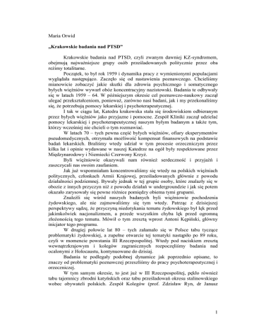 Maria Orwid „Krakowskie badania nad PTSD” Krakowskie badania nad PTSD, czyli zwanym dawniej KZ-syndromem, obejmują najwaŜniejsze grupy osób prześladowanych politycznie przez oba reŜimy totalitarne. Początek, to był rok 1959 i dynamika pracy z wymienionymi populacjami wyglądała następująco. Zaczęło się od nastawienia poznawczego. Chcieliśmy mianowicie zobaczyć jakie skutki dla zdrowia psychicznego i somatycznego byłych więźniów wywarł obóz koncentracyjny nazistowski. Badania te odbywały się w latach 1959 – 64. W późniejszym okresie cel poznawczo-naukowy zaczął ulegać przekształceniom, poniewaŜ, zarówno nasi badani, jak i my przekonaliśmy się, Ŝe potrzebują pomocy lekarskiej i psychoterapeutycznej. I tak w ciągu lat, Katedra krakowska stała się środowiskiem odbieranym przez byłych więźniów jako przyjazne i pomocne. Zespół Kliniki zaczął udzielać pomocy lekarskiej i psychoterapeutycznej naszym byłym badanym a takŜe tym, którzy wcześniej nie chcieli o tym rozmawiać. W latach 70 – tych pewna część byłych więźniów, ofiary eksperymentów pseudomedycznych, otrzymała moŜliwość kompensat finansowych na podstawie badań lekarskich. Braliśmy wtedy udział w tym procesie orzeczniczym przez kilka lat i opinie wydawane w naszej Katedrze na ogół były respektowane przez Międzynarodowy i Niemiecki Czerwony KrzyŜ. Byli więźniowie okazywali nam równieŜ serdeczność i przyjaźń i zaszczycali nas swoim zaufaniem. Jak juŜ wspomniałam koncentrowaliśmy się wtedy na polskich więźniach politycznych, członkach Armii Krajowej, prześladowanych głównie z powodu działalności podziemnej. Bywały jednak w tej grupie osoby, które znalazły się w obozie z innych przyczyn niŜ z powodu działań w undergroundzie i jak się potem okazało zarysowały się pewne róŜnice pomiędzy obiema tymi grupami. Znaleźli się wśród naszych badanych byli więźniowie pochodzenia Ŝydowskiego, ale nie zajmowaliśmy się tym wtedy. Patrząc z dzisiejszej perspektywy sądzę, Ŝe przyczyną niedotykania tematu Ŝydowskiego był lęk przed jakimkolwiek nacjonalizmem, a przede wszystkim chyba lęk przed ogromną złoŜonością tego tematu. Mówił o tym zresztą wprost Antoni Kępiński, główny inicjator tego programu. W drugiej połowie lat 80 – tych załamało się w Polsce tabu tyczące problematyki Ŝydowskiej, a zupełne otwarcie tej tematyki nastąpiło po 89 roku, czyli w momencie powstania III Rzeczpospolitej. Wtedy pod naciskiem zresztą wewnątrzkrajowym i kolegów zagranicznych rozpoczęliśmy badania nad ocalonymi z Holocaustu, kontynuowane do dzisiaj. Badania te podlegały podobnej dynamice jak poprzednio opisane, to znaczy od problematyki poznawczej przeszliśmy do pracy psychoterapeutycznej i orzeczniczej. W tym samym okresie, to jest juŜ w III Rzeczpospolitej, pękło równieŜ tabu tajemnicy zbrodni katyńskich oraz tabu prześladowań okresu stalinowskiego wobec obywateli polskich. Zespół Kolegów (prof. Zdzisław Ryn, dr Janusz 1 Heiztman, dr Krzysztof Rutkowski i pani Renata Jędrzejowska) rozpoczął badania nad skutkami prześladowań reŜimu stalinowskiego, w konsekwencji terapię i orzecznictwo. Jak widać dynamika wszystkich tych trzech programów była podobna i bardzo wyraźnie związana z sytuacją polityczną w kraju. Nie znaczy to, aŜeby byli więźniowie obozów koncentracyjnych nazistowskich byli szczególnie dobrze traktowani w Polsce Ludowej, ale w zasadzie problem ten był mniej zagraŜający politycznie niŜ dwa pozostałe. NaleŜy zwrócić uwagę, Ŝe od lat 60 – tych badania krakowskie obejmowały II pokolenie i to zarówno dzieci byłych więźniów obozów koncentracyjnych (Małgorzata Dominik, Aleksander Teuch), jak i dzieci osób ocalonych z Holocaustu. Co wniosły badania krakowskie merytorycznie do badanego problemu? Przede wszystkim opisały psychopatologię i symptomatologią somatyczną stwierdzoną u byłych więźniów (Adam Szymusik – doktorat) i uzyskane wyniki tej pracy są właściwie toŜsame z współczesnym opisem PTSD zawartym w międzynarodowych klasyfikacjach chorób psychicznych - tyle, Ŝe badania krakowskie zostały opublikowane w 1962 roku, a międzynarodowe klasyfikacje zawierające opis PTSD funkcjonują od lat 80 – tych. Ponadto badania krakowskie ukazały szerszy kontekst KZ-syndromu, to znaczy nie tylko jego stronę biologiczno-somatyczną, ale takŜe pokazały perspektywę psychospołeczną i etyczną tego zagadnienia. Opisały sylwetkę ocalonego, która zgodna jest, a nawet nieco wyprzedziła klasyczne opisy osobowości i relacji z innymi ludźmi oraz światem tzw. survivors. Ten fakt wydaje mi się waŜny, poniewaŜ pojęcie ocalony (survivor) w języku psychiatrii katastrof zaistniało po II wojnie światowej i cechy tak zwanej sylwetki psychicznej ocalonego są we wszystkich trzech badanych populacjach prawie toŜsame. Wykazują oni syndrom przewlekłego zmęczenia, zaburzenia snu, koszmarne sny, stałe poczucie zagroŜenia i lęku, częste dekompensacje depresyjne, poczucie samotności i alienacji, poczucie, Ŝe nikt ich nie rozumie. Dla prawie wszystkich prześladowanych grupa kolegów lub osób, które przeŜyły sprawy podobne, stanowi układ odniesienia w Ŝyciu, często waŜniejszy niŜ rodzina. Ocaleni na ogół miewają trudne relacje z ludźmi. Są głęboko nieufni. Niektórzy w ogóle nie załoŜyli rodzin, poniewaŜ nie chcieli, jak to określali, „infekować” dzieci domowymi nieszczęściami. Ci, którzy mają dzieci, wykazuję szczególne trudności w procesie separacji, indywiduacji, nie tylko w adolescencji dzieci, ale właściwie przez całe Ŝycie. Wszystkie te grupy, w szczególności byli więźniowie i ocaleni z Holocaustu trwają w stanie Ŝałoby i kaŜda kolejna utrata w Ŝyciu jest dla nich trudniejsza do zniesienia niŜ dla populacji nie dotkniętej w tym stopniu. Bardzo wielu spośród naszych badanych wykazuje uwraŜliwie