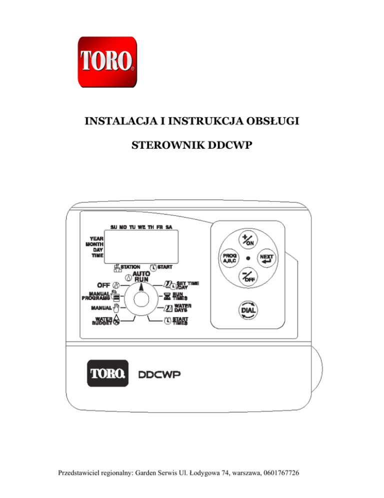INSTALACJA I INSTRUKCJA OBSŁUGI STEROWNIK DDCWP Przedstawiciel regionalny: Garden Serwis Ul. Łodygowa 74, warszawa, 0601767726 Spis Treści 1. Specyfikacja Sterownika 2. Instalacja 3. Podłączenie i Funkcjonowanie Czujnika Deszczu 4. Programowanie - Data i Godzina - Czas Działania - Dni Nawadniania - Regulacja Sezonowa - Sterowanie Manualne - Ustawienie Manualne Programu - Wyłączenie - Auto-run 5. Automatycznie wykrywanie napięcia prądu elektrycznego 6. Pamięć sterownika 7. Zalecane długości kabla ziemnego 8. Plan Nawadniania Dziękujemy za zakup wodoodpornego Sterownika Toro DDCWP, który wyposażony jest w najnowszą technologię programowania dostępną na łatwym do użytkowania cyfrowym wyświetlaczu. Poniższe instrukcje pomogą rozpocząć pracę ze sterownikiem DDCWP. Postępowanie zgodnie z prostymi krokami, zważając szczególnie na UWAGI, które dadzą ci pomocne wskazówki i porady dotyczące programowania, zwiększy maksymalnie wydajność sterownika DDCWP. Przedstawiciel regionalny: Garden Serwis Ul. Łodygowa 74, warszawa, 0601767726 SPECYFIKACJA STEROWNIKA: Sterownik DDCWP może pracować przy jednym zaworze głównym i jednym zaworze sekcyjnym jednocześnie. Sterownik DDCWP pracuje pod prądem stałym, oznacza to, że używa tylko cewek na prąd stały DC (tzw zespół blokujący cewkę). Nie pracuje pod prądem zmiennym. Sterownik został w pełni przetestowany przy użyciu Toro DC Latching Solenoids. Jeśli zamierzacie Państwo użyć innej marki, należy ją przetestować przed dokonaniem instalacji. Jako, że zespół blokujący cewkę jest bardziej wrażliwy na zanieczyszczenia niż zwykła cewka prądu zmiennego (AC) Toro zaleca stosowanie filtru i zaworu głównego w systemie. Sterownik DDCWP został przetestowany, by działać także 2 metry pod wodą. Stopień ochrony IP68. Należy przed otworzeniem schowka na baterię sterownik całkowicie wysuszyć. Wszystkie podłączenia elektryczne muszę być wodoodporne, aby zachować trwałość komponentów systemu. Sterownik jest w tym celu wyposażony w wodoodporne złączki typu 3M. Jeśli wymagane jest zastosowanie więcej połączeń, Toro poleca złączki 3M DBY. Należy wykonać całą instalację elektryczną przed podłączeniem zasilania (9V) do sterownika. Przedstawiciel regionalny: Garden Serwis Ul. Łodygowa 74, warszawa, 0601767726 INSTALACJA STEROWNIKA DDCWP Wypoziomuj i przymocuj obudowę sterownika do solidnej powierzchni. Jeśli mocujecie Państwo w skrzynce zaworowej, rekomenduje się umieszczenie sterownika pod pokrywą zostawiając wystarczająco kabla tak, aby można było łatwo zdjąć pokrywę i mieć dostęp do sterownika. Następnie należy podłączyć przewody cewki (DC) do sterownika. Istotne jest to, aby dopasować przewody kolorami (czarny do czarnego, czerwony do czerwonego) Po podłączeniu przewodów sekcji, usuń pokrywę komory na baterię i wyjmij dwa łącza baterii 9VDC. Podłącz dwie 9VDC baterie alkaiczne, wsuń do komory na baterie, zamknij pokrywę zgodnie z ruchem wskazówek zegara. Zmieniać bądź umieszczać baterie należy w suchych warunkach. Jeśli wilgoć dostanie się do komory na baterie, może to doprowadzić do pogorszenia się jakości pracy baterii. UWAGA: Kiedy do sterownika zostanie podłączone zasilanie zaczyna kalibrować wszystkie cewki wysyłając sygnał pulsujący „OFF” mający na celu późniejsze właściwe ich działanie. Dlatego istotne jest podłączenie wszystkich przewodów od zaworów przed załączeniem zasilania do sterownika. Jeśli jest konieczność programowania sterownika przed instalacją należy po zakończonym programowaniu wyciągnąć baterie i dopiero wtedy podłączyć przewody. Przedstawiciel regionalny: Garden Serwis Ul. Łodygowa 74, warszawa, 0601767726 PODŁĄCZENIE I FUNKCJONOWANIE CZUJNIKA DESZCZU Sterownik DDCWP współpracuje z Czujnikiem Deszczu Toro TRS. Rozetnij żółte przewody ze sterownika i używając wodoodpornych połącz dwa przewody od czujnika deszczu do żółtych przewodów sterownika. Sterownik będzie współgrał z każdym czujnikiem deszczu N.C.(normalnie zamknięty). Należy postępować zgodnie z instrukcją obsługi producenta. Aktywacja czujnika deszczu spowoduje wstrzymanie programu nawadniania aż do momentu przywrócenia mu statusu zamkniętego N.C. . Uwaga: Gdy nawadnianie wstrzymane jest z powodu czujnika deszczu, wyświetlacz pokaże OFF oraz ikonę parasola. PROGRAMOWANIEProgramowanie Zalecane jest wciśnięcie przycisku RESET w celu wyczyszczenia pamięci. Wciśnij DIAL, aby przejść do ustawień daty i godziny. Pozycja: SET TIME/DAY Ustaw aktualny rok, miesiąc, dzień i godzinę Ustaw rok posługując się przyciskami +/ON lub -/OFF Wciśnij NEXT, aby zatwierdzić ustawienia. Ustaw miesiąc posługując się przyciskami +/ON lub -/OFF Przedstawiciel regionalny: Garden Serwis Ul. Łodygowa 74, warszawa, 0601767726 Wciśnij NEXT, aby zatwierdzić ustawienia. Ustaw dzień posługując się przyciskami +/ON lub -/OFF Wciśnij NEXT, aby zatwierdzić ustawienia. Ustaw 24godzinny zegar(domyślny) lub AM/PM posługując się przyciskami +/ON lub -/OFF Wciśnij NEXT, aby zatwierdzić ustawienia. Ustaw godzinę posługując się przyciskami +/ON lub -/OFF Wciśnij NEXT, jeśli chcesz wrócić do ustawienia roku. UWAGA: Naciskając +/ON lub -/OFF bez przerwy, liczby zaczną zmieniać się szybciej. Wciśnij DIAL, aby przejść do ustawień czasu działania Pozycja: RUN TIME Sterownik DDCWP ma 3 niezależne programy: A, B i C. Program A ma początkowy program z ustawieniami: 5minutowy czas nawadniania każdej sekcji, z czasem rozpoczęcia 04:00 (AM). Ustawienia te można usunąć (patrz: „Usuwanie Ustawień Programu”) lub zmodyfikować postępując wg następujących kroków: Wciśnij PROG, aby wybrać pożądany program. Ustaw pożądany czas działania pierwszej sekcji posługując się przyciskami +/ON lub -/OFF (od 1min do 4h) Wciśnij NEXT, aby zatwierdzić ustawienia i przej