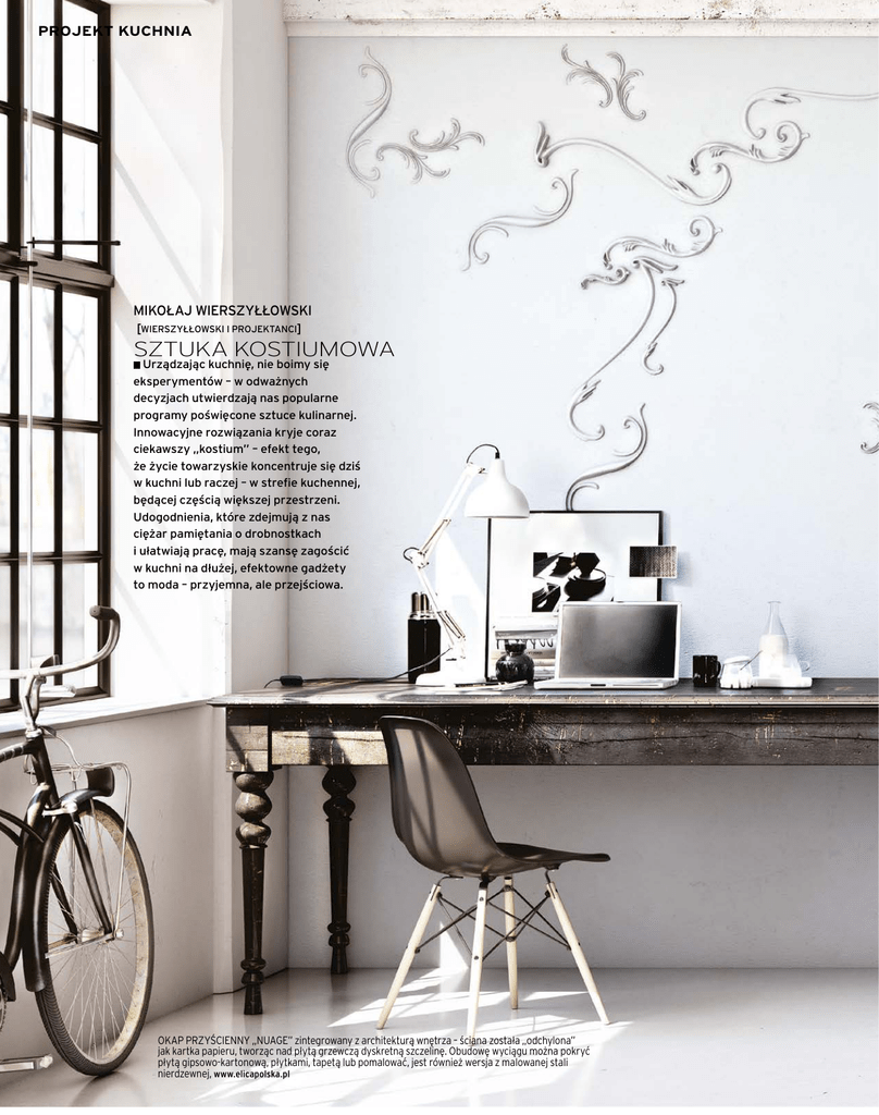 PROJEKT KUCHNIA MIKOŁAJ WIERSZYŁŁOWSKI [WIERSZYŁŁOWSKI I PROJEKTANCI] SZTUKA KOSTIUMOWA Urządzając kuchnię, nie boimy się eksperymentów – w odważnych decyzjach utwierdzają nas popularne programy poświęcone sztuce kulinarnej. Innowacyjne rozwiązania kryje coraz ciekawszy „kostium” – efekt tego, że życie towarzyskie koncentruje się dziś w kuchni lub raczej – w strefie kuchennej, będącej częścią większej przestrzeni. Udogodnienia, które zdejmują z nas ciężar pamiętania o drobnostkach i ułatwiają pracę, mają szansę zagościć w kuchni na dłużej, efektowne gadżety to moda – przyjemna, ale przejściowa. OKAP PRZYŚCIENNY „NUAGE” zintegrowany z architekturą wnętrza – ściana została „odchylona” jak kartka papieru, tworząc nad płytą grzewczą dyskretną szczelinę. Obudowę wyciągu można pokryć płytą gipsowo-kartonową, płytkami, tapetą lub pomalować, jest również wersja z malowanej stali nierdzewnej, www.elicapolska.pl inspektor gadżet Naszpikowana elektroniką niczym auto Jamesa Bonda. Urodą dorównująca szpilkom od Manolo Blahnika. Wyposażona w sprzęt, który przejmuje większość obowiązków kucharza, zostawiając mu przyjemność eksperymentowania, dosmaczania. Kuchnia jest dla dorosłych tym, czym wesołe miasteczko dla dzieci. PROJEKT KUCHNIA TAK DALEKO, TAK BLISKO HERNAN GOMEZ [STUDIO GOMEZ] Jeśli się zastanowić, można dojść do wniosku, że nowoczesne kuchenne rozwiązania hołdują tradycji – weźmy na przykład płytę podgrzewaną na całej powierzchni, przecież to współczesna wersja kuchni z fajerkami. A funkcje smart? Multimedia pozwalają być razem, także podczas gotowania i jedzenia, choć w rzeczywistości jesteśmy oddaleni o setki kilometrów. Oszczędzają czas, ułatwiają komunikację z domownikami (interaktywna kuchenka przekaże wiadomość dla rodziny), przygotowują listy zakupów, sterują oświetleniem, o określonej godzinie uruchomią ekspres. Dzięki nim można... odrobinę zwolnić tempo życia. KUCHNIA „INVISIBLE”, proj. Mauro Carlesi, z włókna węglowego – materiału lekkiego i odpornego, używanego głównie w motoryzacji i przemyśle kosmicznym. Ma połączenie z internetem, ekran dotykowy wbudowany w blat pozwala także na sterowanie wszystkimi automatycznymi elementami kuchni, a także dźwiękiem w domu, www.toncelli.it OKAP WYSPOWY „YE”, proj. Fabrizio Crisa dla marki Elica ma kształt rozgałęzienia drzewa. Wykonany z tworzywa Cristalplant o aksamitnej, przypominającej kamień powierzchni. Urządzenie jest zdalnie sterowane, oświetlenie LED firmy iGuzzini oraz silniki o dużej mocy, www.elicapolska.pl A rchitekt Rafał Darski, specjalista od rozwiązań kuchennych, co prawda uważa, że pogoń za nowinkami jest w wielu przypadkach nieracjonalna (po co superpiekarnik z efektami specjalnymi osobie, która jada na mieście?), ale... doskonale ją rozumie. – Sam jestem gadżeciarzem. Jeśli kogoś najnowszy sprzęt uszczęśliwia, to czemu nie? Liczy się zabawa! – mówi. Robert Charkiewicz też należy do grupy entuzjastów: inteligentne rozwiązania, technologie 3D, dostawa produktów spożywczych przez drony, interaktywne powierzchnie mebli – co nie tylko zwiększy ich funkcjonalność, ale wpłynie również na wygląd: będą mogły na życzenie właściciela zmieniać kolory. – Jesteśmy coraz większymi indywidualistami, widać to w aranżacji kuchni – uzasadnia. 144 dobre wnętrze 12/2014 – Komunikujące się ze sobą płyty grzewcze, pochłaniacze, które same ustalają moc wyciągu, czy lodówki informujące o kończących się zapasach są super, bo pomagają w codziennej pracy – twierdzi architekt Mikołaj Wierszyłłowski. – Natomiast wszędobylskie monitory z dostępem do internetu czy telewizji oraz podświetlenia LED już niekoniecznie. Zresztą lodówka z TV, która miała premierę kilka lat temu, dość szybko zniknęła z rynku. Gadżetomania ma swoje granice, wyznaczają je życie i rzeczywiste potrzeby użytkowników – dodaje. Hernan Gomez nie ma wątpliwości: – Zmiana pokoleniowa spowoduje, że cyfryzacja kuchni będzie się rozwijała, tego trendu nie da się powstrzymać. Ale nie dajmy się zwariować, bo przestaniemy kiedyś w ogóle myśleć! – podsumowuje. A może po prostu będziemy myśleć inaczej? 6