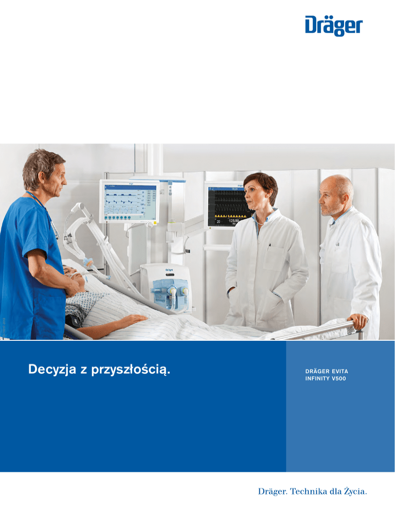 D-76317-2013 Decyzja z przyszłością. DRÄGER EVITA INFINITY V500 2| W jaki sposób mogę D-76325-2013 D-76319-2013 przygotować się na przyszłość? Decyzja o leczeniu z zastosowaniem respiratora najwyższej jakości D-76300-2013 Nie istnieje jeden sposób, aby sprostać najtrudniejszym wyzwaniom, które pojawiają się na oddziale intensywnej terapii. Zasadniczą kwestią pozostaje skrócenie czasu, w którym pacjent jest podłączony do respiratora. Ciągła wentylacja na wysokim poziomie musi być zgodna ze standardami planów leczenia. Każdego dnia pojawiają się nowi pacjenci i nowe wyzwania. W diagnozie i przy podejmowaniu prawidłowej decyzji o leczeniu pacjenta liczy się każda minuta. Gdy stan pacjenta się ustabilizuje, kiedy jest właściwy moment na rozpoczęcie odzwyczajania go od respiratora? Lekarze wiedzą, że odzwyczajanie od wentylacji mechanicznej może zająć dużo czasu. W jaki sposób można to zrobić najszybciej jak to możliwe? D-76367-2013 D-76339-2013 D-76330-2013 |3 STANDARD EVITY Respiratory Evita wspierają Twoją pracę od ponad 25 lat, dzięki: –– wysokim standardom wykonania –– możliwości dowolnego konfigurowania i aktualizowania –– zaawansowanej koncepcji szkolenia i serwisu Spełnianie Twoich obecnych i przyszłych potrzeb wymaga coraz nowocześniejszych rozwiązań. Respirator Evita V500 oferuje innowacyjną technologię i zapewnia wysokiej wydajności wentylację. 4| Kompletny zestaw przyrządów do leczenia NARZĘDZIA DO PROWADZENIA TERAPII ODDECHOWEJ –– Narzędzia do diagnozowania stanu płuc, np. manewr niskiego przepływu (punkty przegięcia) –– Oddech za oddechem przy trendach rekrutacji (np. PEEP, EIP, VT, Cdyn) –– Ułatwione procedury rekrutacji (np. lnspiration Hold, QuickSet, PressureLink) . –– PC-APRV z funkcją AutoRelease –– Zintegrowane monitorowanie przepływu CO2 (VCO2, VTCO2, Slope Phase 3, Vds/VTe) –– Parametr odzwyczajania (np. RSBi, P 0.1, NIF) –– Automatyczne odzwyczajanie za pomocą funkcji SmartCare/PS® –– Zmienne wspomaganie ciśnieniowe, proporcjonalne wspomaganie ciśnieniowe, automatyczna kompensacja rurki intubacyjnej –– Graficzna prezentacja oporów i podatności płuc za pomocą Smart Pulmonary View –– Koncepcja „Room-to-breathe” (AutoFlow®, BIPAP, VG) –– Odpowiednie parametry w wentylacji noworodków (najmniejsza objętość oddechowa: 2 ml) FUNKCJE WSPIERAJĄCE TWOJĄ PRACĘ –– Wentylacja nieinwazyjna we wszystkich trybach i dla wszystkich kategorii pacjentów –– Terapia O2 umożliwia płynne dozowanie ilości tlenu –– Pełna konfiguracja ekranu: 6 różnych widoków dla każdego pacjenta, w zależności od potrzeb indywidualnego leczenia –– Pełen zapis wszystkich danych pacjenta oraz alarmów i trendów –– Eksport danych przez interfejs USB –– Intuicyjna funkcja pomocy z bezpośrednim dostępem do Instrukcji Obsługi, opisów trybów wentylacji, alarmów i innych funkcji urządzenia –– Funkcja RFID np. do monitorowania okresów wymiany akcesoriów i zapamiętywania ustawień wentylacji przy zmianie urządzenia (przy transporcie) D-76108-2013 |5 6| wsparcie w każdej fazie terapii Zaawansowane Wentylacja nieinwazyjna Zapobieganie Wentylacja inwazyjna Powrót do zdrowia Stabilizacja Odzwyczajanie Dräger Evita V500 pomaga prowadzić wentylację najwyższej jakości na wszystkich etapach terapii oddechowej. Ułatwia podejmować słuszne decyzje co usprawnia Twoją codzienną pracę – zarówno dzisiaj, jak i jutro. OCHRONA ODZWYCZAJANIE –– Wentylacja nieinwazyjna z czułym wyzwalaczem wdechu i automatycznym wyłączeniem przy wydechu, aby poprawić synchronizację respiratora z naturalna pracą oddechową pacjenta –– SmartCare/PS – automatyczny protokół procesu odzwyczajania od respiratora pomaga skrócić czas pobytu pacjenta na oddziale intensywnej terapii* –– Konfigurowalne limity dla funkcji SmartCare/PS umożliwiają indywidualne dopasowanie do sytuacji pacjenta –– Funkcja kompleksowego monitorowania parametrów do obserwacji postępów w odzwyczajaniu –– Zmienne wspomaganie ciśnieniowe do zwiększenia naturalnej zmienności objętości oddechowej STABILIZACJA –– Analiza niskim przepływem statycznej charakterystyki płuca w celu optymalizacji ustawień wentylacji –– Funkcje QuickSet i PressureLink pozwalają na proste i szybkie prowadzenie procedur rekrutacji –– Funkcja AutoRelease w PC-APRV stabilizuje objętość końcowo-oddechową płuc POWRÓT DO ZDROWIA –– Terapia O2 umożliwia powrót do zdrowia po ekstubacji i wentylacji nieinwazyjnej * F. Lellouche et al.; Am J respir Care Med Vol 174, pp 894-900, 2006. Wyniki oparte są na wieloośrodkowym badaniu klinicznym European Multicenter Randomized Trial, z udziałem 144 pacjentów wykazujących polepszony stan układu oddechowego oraz stabilny stan hemodynamiczny i neurologiczny, bez objawów zespołu ostrej niewydolności oddechowej (ARDS) przed rozpoczęciem odzwyczajania. |7 Transport D-43483-2012 GS500, PS500, JEDNOSTKA TRANSPORTOWA (TSU), UCHWYT MONTAŻOWY DO ŁÓŻKA Pełną elastyczność użytkowania w dowolnym miejscu szpitala – nawet przez 4 godziny – zapewniają mobilne źródło zasilania PS500 oraz mobilny kompresor powietrza GS500. Jednostka transportowa TSU wyposażona jest w dwie butle z gazem i przyłącze do łóżka, co sprawia, że transport pacjenta staje się łatwiejszy. Accessories MT-2099-2007 AKCESORIA INFINITY ID Akcesoria Infinity® ID zostały opracowane specjalnie, w celu uproszczenia obsługi i optymalizacji cyklów pracy: funkcja RFID wykrywa nieprawidłowe połączenia obwodu pacjenta do portów oraz umożliwia import ustawień wentylacji po podłączeniu do respiratora. Okresy wymiany akcesoriów mogą być monitorowane. Training D-76030-2013 MATERIAŁY SZKOLENIOWE EVITA V500 Firma Drager wspiera codzienną pracę w szpitalu, oferując innowacyjne, interaktywne programy szkoleniowe, kt