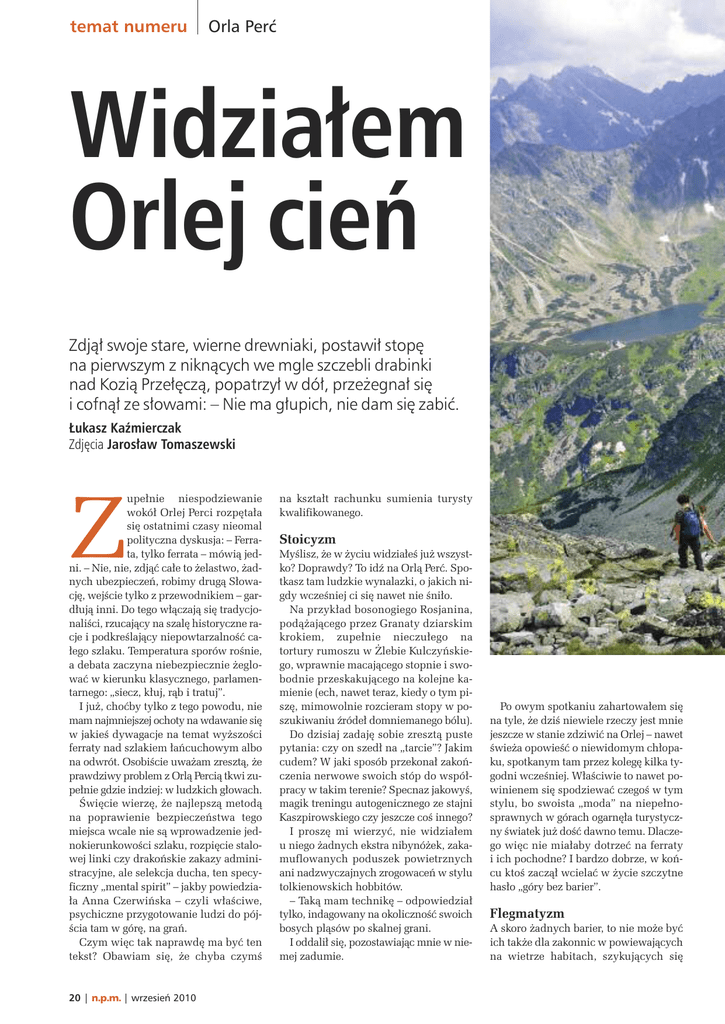 temat numeru Orla Perć Widziałem Orlej cień Zdjął swoje stare, wierne drewniaki, postawił stopę na pierwszym z niknących we mgle szczebli drabinki nad Kozią Przełęczą, popatrzył w dół, przeżegnał się i cofnął ze słowami: – Nie ma głupich, nie dam się zabić. Łukasz Kaźmierczak Zdjęcia Jarosław Tomaszewski Z upełnie niespodziewanie wokół Orlej Perci rozpętała się ostatnimi czasy nieomal polityczna dyskusja: – Ferrata, tylko ferrata – mówią jedni. – Nie, nie, zdjąć całe to żelastwo, żadnych ubezpieczeń, robimy drugą Słowację, wejście tylko z przewodnikiem – gardłują inni. Do tego włączają się tradycjonaliści, rzucający na szalę historyczne racje i podkreślający niepowtarzalność całego szlaku. Temperatura sporów rośnie, a debata zaczyna niebezpiecznie żeglować w kierunku klasycznego, parlamentarnego: „siecz, kłuj, rąb i tratuj”. I już, choćby tylko z tego powodu, nie mam najmniejszej ochoty na wdawanie się w jakieś dywagacje na temat wyższości ferraty nad szlakiem łańcuchowym albo na odwrót. Osobiście uważam zresztą, że prawdziwy problem z Orlą Percią tkwi zupełnie gdzie indziej: w ludzkich głowach. Święcie wierzę, że najlepszą metodą na poprawienie bezpieczeństwa tego miejsca wcale nie są wprowadzenie jednokierunkowości szlaku, rozpięcie stalowej linki czy drakońskie zakazy administracyjne, ale selekcja ducha, ten specyficzny „mental spirit” – jakby powiedziała Anna Czerwińska – czyli właściwe, psychiczne przygotowanie ludzi do pójścia tam w górę, na grań. Czym więc tak naprawdę ma być ten tekst? Obawiam się, że chyba czymś 20 | n.p.m. | wrzesień 2010 na kształt rachunku sumienia turysty kwalifikowanego. Stoicyzm Myślisz, że w życiu widziałeś już wszystko? Doprawdy? To idź na Orlą Perć. Spotkasz tam ludzkie wynalazki, o jakich nigdy wcześniej ci się nawet nie śniło. Na przykład bosonogiego Rosjanina, podążającego przez Granaty dziarskim krokiem, zupełnie nieczułego na tortury rumoszu w Żlebie Kulczyńskiego, wprawnie macającego stopnie i swobodnie przeskakującego na kolejne kamienie (ech, nawet teraz, kiedy o tym piszę, mimowolnie rozcieram stopy w poszukiwaniu źródeł domniemanego bólu). Do dzisiaj zadaję sobie zresztą puste pytania: czy on szedł na „tarcie”? Jakim cudem? W jaki sposób przekonał zakończenia nerwowe swoich stóp do współpracy w takim terenie? Specnaz jakowyś, magik treningu autogenicznego ze stajni Kaszpirowskiego czy jeszcze coś innego? I proszę mi wierzyć, nie widziałem u niego żadnych ekstra nibynóżek, zakamuflowanych poduszek powietrznych ani nadzwyczajnych zrogowaceń w stylu tolkienowskich hobbitów. – Taką mam technikę – odpowiedział tylko, indagowany na okoliczność swoich bosych pląsów po skalnej grani. I oddalił się, pozostawiając mnie w niemej zadumie. Po owym spotkaniu zahartowałem się na tyle, że dziś niewiele rzeczy jest mnie jeszcze w stanie zdziwić na Orlej – nawet świeża opowieść o niewidomym chłopaku, spotkanym tam przez kolegę kilka tygodni wcześniej. Właściwie to nawet powinienem się spodziewać czegoś w tym stylu, bo swoista „moda” na niepełnosprawnych w górach ogarnęła turystyczny światek już dość dawno temu. Dlaczego więc nie miałaby dotrzeć na ferraty i ich pochodne? I bardzo dobrze, w końcu ktoś zaczął wcielać w życie szczytne hasło „góry bez barier”. Flegmatyzm A skoro żadnych barier, to nie może być ich także dla zakonnic w powiewających na wietrze habitach, szykujących się Wędrującym Orlą Percią niemal przez cały czas towarzyszy wspaniały widok na Tatry Wysokie. Na zdjęciu, ponad grzbietem otaczającym Dolinę Pięciu Stawów Polskich, widzimy m.in. Ganek, Niżnie Rysy, Rysy, Wołowy Grzbiet, Mięguszowieckie Szczyty, Cubrynę i Koprowy do forsowania osławionej drabinki nad Kozią Przełęczą. Dla takiego widoku naprawdę warto było przerwać wędrówkę w kierunku Kozich Czub, usiąść i obserwować dalszy bieg wydarzeń. Dziwne, ale od samego początku byłem pewien, że owe eremickie zapasy z przeszkodą to będzie bułka z masłem. No i nie pomyliłem się – siostrzyczki pokonały drabinkę lekko, z gracją, stylowo, z wprawą godną samego Jana Długosza albo jeszcze lepiej – krakowskich Pokutników. O tak, czegoś równie niespodziewanego doświadczyć można chyba tylko na Orlej. A może się mylę? To dlaczego w takim razie spotykam tam ciągle ludzi jakby nieco odklejonych od rzeczywistości? Na przykład człowieka z parasolem, który rączką zahaczał o klamry w pięk- nym, ukośnym kominku w Orlej Baszcie. Świetnie wyekwipowany – wysokiej klasy oddychająca odzież turystyczna, markowe buty, wystająca z plecaka rurka CamelBacka. Tylko ten parasol… I to nie żadne tam udziwnione, wspinaczkowe ustrojstwo, ale zwykłe, reklamowe barachło z nadrukiem bodajże jednej z sieci stacji benzynowych. Ów dżentelmen jakby żywcem wyjęty z „Klubu Pickwicka” miał tylko jedną odpowiedź na moje wątpliwości: – Zaprawdę, zaprawdę, powiadam ci młody, niedoświadczony człowieku, w górach trzeba być zawsze gotowym na niepogodę. Hmm..., a masz jeszcze jakieś inne, równie celne uwagi Wujku Dobra Rado? Na przykład, co należy zrobić podczas spotkania z rozjuszonym buhajem, nacie- rającym od strony podciętego Żydowskiego Żlebu w kierunku Zmarzłej Przełączki Wyżniej? Mowa o przerośniętym człowieku-demolce, o którym już kiedyś wspominałem na łamach „n.p.m.”, rozdającym kuksańce każdemu, kto ośmielił się spojrzeć na jego towarzyszkę w lamparcim anturażu. A zaiste było na co popatrzeć: spalona solarycznym słońcem twarz Fatimy spod Wołomina wspaniale kontrastująca ze śniegiem zalegającym w żlebie. Absolutna biel i czerń. A w tle tego wszystkiego grało podwójne, łańcuchowe staccato – tych w ręce i tych grubszych – na ręce… Cierpl