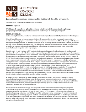 Jak rozliczać korzystanie z samochodów służbowych do celów prywatnych Gazeta Prawna, Tygodnik Podatkowy, Piotr Andrzejak EKSPERT wyjaśnia W jaki sposób pracodawca (płatnik) powinien ustalić wartość świadczenia nieodpłatnego polegającego na wykorzystywaniu samochodu służbowego do celów prywatnych? PIOTR ANDRZEJAK radca prawny i doradca podatkowy w Zespole Podatkowym Kancelarii Sołtysiński Kawecki i Szlęzak Wartość nieodpłatnego wykorzystywania służbowych samochodów do celów prywatnych pracowników zasadniczo stanowi przychód pracownika ze stosunku pracy w rozumieniu art. 12 ust. 1 ustawy o PIT. Zgodnie z tym przepisem przychodem ze stosunku pracy jest m.in. wartość pieniężna świadczeń w naturze, jak również wartość innych nieodpłatnych świadczeń. Dla pracownika podstawowe znaczenie ma sposób ustalenia przez pracodawcę wartości świadczenia nieodpłatnego polegającego na wykorzystywaniu przez pracownika samochodu służbowego dla celów prywatnych. Zgodnie z art. 12 ust. 2 ustawy o PIT wartość pieniężną nieodpłatnych świadczeń ustala się według zasad określonych w art. 11 ust. 2-2b. Ponieważ w większości przypadków pracodawca udostępniający własny pojazd pracownikom do korzystania z niego również dla celów prywatnych nie prowadzi działalności w zakresie najmu samochodów, dla ustalenia wartości przychodu pracownika przywoływany jest art. 11 ust. 2a pkt 4 ustawy o PIT. W świetle tej regulacji wartość pieniężną nieodpłatnych świadczeń ustala się na podstawie cen rynkowych stosowanych przy świadczeniu usług lub udostępnianiu rzeczy lub praw tego samego rodzaju i gatunku, z uwzględnieniem w szczególności ich stanu i stopnia zużycia oraz czasu i miejsca udostępnienia. W rezultacie organy podatkowe nakazują obliczać przychód pracownika na podstawie cen najmu pojazdów stosowanych przez przedsiębiorców profesjonalnie świadczących usługi krótkotrwałego najmu pojazdów (tzw. wypożyczalnie samochodów). Może to jednak prowadzić do dość kuriozalnych rezultatów. W przypadkach prywatnego wykorzystywania pojazdów służbowych w celu dojazdu do pracy z miejsca zamieszkania potencjalny oszacowany przychód pracownika obliczony w oparciu o stawki dzienne stosowane przez wypożyczalnie samochodów (brak bowiem podmiotów świadczących usługi najmu pojazdu na okres krótszy niż dzień) jest niewspółmierny do faktycznej korzyści pracownika. W praktyce obrotu pojawiają się różne sposoby urealnienia przychodu pracownika z wykorzystywania samochodu służbowego do celów prywatnych. Stosowanym rozwiązaniem jest m.in. ryczałtowe określenie takiego przychodu. Stosowaniu ryczałtów stoi jednak na przeszkodzie treść art. 11 ust. 2a ustawy o PIT. Stąd rozwiązanie takie narażone jest na ryzyko sporu pracodawcy (płatnika) z organami skarbowymi co do rzetelności wyliczenia przychodu pracownika. Należy jednocześnie zwrócić uwagę, że w przypadku samochodów służbowych leasingowanych przez pracodawcę ustalenie przychodu pracownika z tytułu prywatnego użytkowania samochodu służbowego powinno nastąpić w oparciu o art. 11 ust. 2a pkt 2 ustawy o PIT, zgodnie z którym, jeżeli przedmiotem świadczeń są usługi zakupione przychód pracownika, ustala się według cen zakupu. W konsekwencji, jeżeli pracownik prowadzi ewidencję pojazdu, w której wyodrębniono podróże prywatne od służbowych, ustalenie przychodu pracownika nastąpiłoby poprzez przypisanie pracownikowi jako przychodu proporcjonalnej części kosztów usług zakupionych przez pracodawcę w związku z eksploatacją samochodu (koszty raty leasingowej, ubezpieczenia, paliwa itp.).
