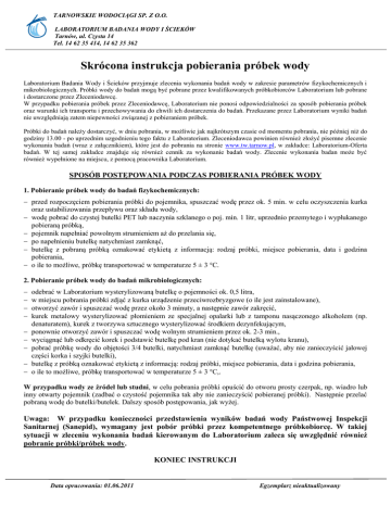TARNOWSKIE WODOCIĄGI SP. Z O.O. LABORATORIUM BADANIA WODY I ŚCIEKÓW Tarnów, ul. Czysta 14 Tel. 14 62 35 414, 14 62 35 362 Skrócona instrukcja pobierania próbek wody Laboratorium Badania Wody i Ścieków przyjmuje zlecenia wykonania badań wody w zakresie parametrów fizykochemicznych i mikrobiologicznych. Próbki wody do badań mogą być pobrane przez kwalifikowanych próbkobiorców Laboratorium lub pobrane i dostarczone przez Zleceniodawcę. W przypadku pobierania próbek przez Zleceniodawcę, Laboratorium nie ponosi odpowiedzialności za sposób pobierania próbek oraz warunki ich transportu i przechowywania do chwili ich dostarczenia do badań. Przekazane przez Laboratorium wyniki badań nie uwzględniają zatem niepewności związanej z pobieraniem próbek. Próbki do badań należy dostarczyć, w dniu pobrania, w możliwie jak najkrótszym czasie od momentu pobrania, nie później niż do godziny 13.00 - po uprzednim uzgodnieniu tego faktu z Laboratorium. Zleceniodawca powinien również złożyć pisemne zlecenie wykonania badań (wraz z załącznikiem), które jest do pobrania na stronie www.tw.tarnow.pl, w zakładce: Laboratorium-Oferta badań. W tej samej zakładce znajduje się również cennik za wykonanie badań wody. Zlecenie wykonania badan może być również wypełnione na miejscu, z pomocą pracownika Laboratorium. SPOSÓB POSTĘPOWANIA PODCZAS POBIERANIA PRÓBEK WODY 1. Pobieranie próbek wody do badań fizykochemicznych: przed rozpoczęciem pobierania próbki do pojemnika, spuszczać wodę przez ok. 5 min. w celu oczyszczenia kurka oraz ustabilizowania przepływu oraz składu wody, wodę pobrać do czystej butelki PET lub naczynia szklanego o poj. min. 1 litr, uprzednio przemytego i wypłukanego pobieraną próbką, pojemnik napełniać powolnym strumieniem aż do przelania się, po napełnieniu butelkę natychmiast zamknąć, butelkę z pobraną próbką oznakować etykietą z informacją: rodzaj próbki, miejsce pobierania, data i godzina pobierania, o ile to możliwe, próbkę transportować w temperaturze 5 ± 3 °C. 2. Pobieranie próbek wody do badań mikrobiologicznych: odebrać w Laboratorium wysterylizowaną butelkę o pojemności ok. 0,5 litra, w miejscu pobrania próbki zdjąć z kurka urządzenie przeciwrozbryzgowe (o ile jest zainstalowane), otworzyć zawór i spuszczać wodę przez około 3 minuty, a następnie zawór zakręcić, kurek metalowy wysterylizować płomieniem ze specjalnej opalarki lub z tamponu nasączonego alkoholem (np. denaturatem), kurek z tworzywa sztucznego wysterylizować środkiem dezynfekującym, ponownie otworzyć zawór i spuszczać wodę wolnym strumieniem przez ok. 2-3 min., wyciągnąć lub odkręcić korek i podstawić butelkę pod kran (nie dotykać butelką wylotu kranu), pobrać próbkę wody do objętości 3/4 butelki, natychmiast zamknąć butelkę (uważać, aby nie zanieczyścić jałowej części korka i szyjki butelki), butelkę z próbką oznakować etykietą z informacją: rodzaj próbki, miejsce pobierania, data i godzina pobierania, o ile to możliwe, próbkę transportować w temperaturze 5 ± 3 °C,. W przypadku wody ze źródeł lub studni, w celu pobrania próbki opuścić do otworu prosty czerpak, np. wiadro lub inny otwarty pojemnik (zadbać o czystość pojemnika tak aby nie zanieczyścić pobieranej próbki). Następnie przelać pobraną wodę do butelki/butelek. Dalszy sposób postępowania, jak wyżej. Uwaga: W przypadku konieczności przedstawienia wyników badań wody Państwowej Inspekcji Sanitarnej (Sanepid), wymagany jest pobór próbki przez kompetentnego próbkobiorcę. W takiej sytuacji w zleceniu wykonania badań kierowanym do Laboratorium zaleca się uwzględnić również pobranie próbki/próbek wody. KONIEC INSTRUKCJI Data opracowania: 01.06.2011 Egzemplarz nieaktualizowany