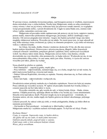Dominik Samselski kl. II LOP Alicja W pewnej wiosce, niedaleko kwiecistej polany, nad brzegiem jeziora w wielkim, murowanym domu mieszkała wraz z córką kobieta. Nosiła imię Małgorzata, miała za sobą czterdzieści cztery wiosny i choć na jej twarzy widoczne były już pierwsze oznaki starości, to wyglądem wciąż przypominała siebie, z przed dwudziestu lat. Ciągle ta sama blada cera, ciemno-rude włosy i pełne, naturalnie czerwone usta. Małgorzata od początku miała zaplanowane jak potoczy się jej życie, najpierw matura, potem studia, stanowisko prokuratora okręgowego, przystojny, dobrze zarabiający mąż i dziecko. Od zawsze pragnęła mieć dziecko : kogoś, kto będzie ją kochał i kogo ona także mogłaby obdarować miłością. Wszystko jej się udało. No może poza tym, że mąż odszedł od niej, kilka miesięcy temu zwolniono ją z pracy za złamanie przepisów, a jej córka od miesięcy walczy z rakiem trzustki. Jej Alicja. Jej mała, słodka Alunia ( niedawno skończyła 18 lat, ale dla niej zawsze będzie małym dzieckiem). Dziewczyna z artystyczną duszą, długich, lekko kręconych czarnych włosach i anielskim, potężnym głosem i pędzlem, który zachwycał wszystkich wokół. Jej obrazy także miały duszę. Małgorzata zawsze była z niej dumna, a kiedy dowiedziała się o jej chorobie, obie postanowiły, że będą walczyć. Wydawało jej się, że ma niewyobrażalnie silną córkę i że ona sama, także jest silna. Niestety, w życiu nie zawsze wszystko jest takie, jakim się wydaje. * Nocą obudził ją telefon ze szpitala. - Pani Damięcka? – zapytał ją gruby, męski głos. - Przy telefonie – odpowiedziała, zastanawiając się, co u licha, mogło być aż tak ważne, by jakiś mężczyzna budził ją o trzeciej nad ranem. - Doktor Edward Kądzielski, dzwonię ze szpitala. Niestety obawiam się, że Pani córka nas opuściła. - Zaraz tam będę – odpowiedziała i rozłączyła się. * Dwadzieścia minut później znalazła się w budynku szpitalnym. Nawet nie było jej smutno. Praca zabrała jej wszystkie uczucia. W sądzie od początku musiała być twardą sztuką i z czasem nauczyła się być taka także w życiu. Wszystko zmieniło się, gdy weszła do sali, w której leżała Alicja – blada, zimna, martwa. Uklękła przed nią, opierając dłonie na łóżku a łzy leciały jej z oczu strumieniami. Straciła swój największy skarb. Przecież mogła się na to przygotować – wiedziała, że Zuzanna umrze, ale nie, matka nigdy nie będzie gotowa na śmierć ukochanego, jedynego dziecka. Lekarze przyszli, by zakryć ciało jej córki, a wtedy pielęgniarka, kładąc jej lekko dłoń na ramieniu powiedziała : - Ala kazała to Pani przekazać – wcisnęła jej w dłoń kartkę i odeszła. Małgorzata otarła łzy i szybkim ruchem rozwinęła papier. To był list od Alicji. Pisała : Kochana Mamo! Czuję, że wygram. Naprawdę czuję, że będzie dobrze, Ale gdyby tak się nie stało, to mam jedno marzenie : Gdybym umarła młodo, pogrzeb mnie w satynie, Połóż moje ciało w łożu usłanym białymi różami. Wiesz, jak je uwielbiam. 1 Potem pójdź z orszakiem pogrzebowym nad rzekę, w niej moje prochy o wschodzie słońca. Ja tak naprawdę nigdy nie umrę, czuję to. Prawdziwi artyści nie umierają, ale proszę, Niech temu wszystkiemu towarzyszy jakaś miłosna ballada. Chciałabym, żeby tak było, bo wiesz, nigdy nie czułam, jak to jest naprawdę kogoś kochać, ale musi to być piękne uczucie. Teraz muszę już lecieć, bo możliwe, że czekają tam na mnie na górze. Kocham Cię, bądź silna. Twoja Alicja. Łzy zaczęły strumieniami płynąć z oczu Małgorzaty. Chciała płakać i krzyczeć, chciała pokazać, że cierpi., ale nie mogła. Wróciła do domu i wzięła gorący prysznic, gdzie po raz kolejny zalała się łzami. Oczami wyobraźni widziała, jak jej córka biegnie do niej, jak razem śmieją się, tańczą i śpiewają, ale teraz, to mogło być tylko jak najpiękniejszy sen. * Od kilku dni Jan, jej nowy sąsiad wpatrywał się w okno jej sypialni. Wprowadził się miesiąc po śmierci Alicji. Na początku ignorowała go, ale z czasem te jego nocne śledztwa stały się dla Małgorzaty prawdziwą męczarnią i choć grzecznie prosiła, by przestał to robić on i tak uparcie powtarzał tę czynność. Lubiła go, ale bez przesady. Pewnej nocy do sypialni kobiety wpadł jasny, świetlisty promień, który zbudził ją ze snu. Szum silnego wiatru zawładnął jej uszami, a jego moc otworzyła na oścież okiennice. Podmuch powietrza wpadł przez nie do pomieszczenia, a zdziwiona całym zajściem kobieta, postanowiła je zamknąć. Wychyliła się lekko, by sięgnąć za klamkę, a wtedy spostrzegła niesamowite zjawisko. Jej oczom ukazało się coś na kształt chmur. Biały puch rozciągał się przed nią wysoko w górę, tworząc ścieżkę. Niepewnie dotknęła go dłonią i wtedy usłyszała męski głos, który wołał do niej z góry : „Nie bój się, chodź do mnie.” Pomyślała, że musiała zwariować, ale mimo to, wysunęła bose stopy na puchowe podłoże. O dziwo, czuła się stabilnie, a nogami przebierała z taką lekkością i szybkością, że po raz kolejny posądziła samą siebie o obłąkanie. Miała wrażenie, że puszysta droga, która rozpościerała się przed nią, nie ma końca. Nagle oniemiała. Zobaczyła przed sobą mężczyznę. Był wysoki, piękny i ekscytujący. Przez kilka sekund nie zwracał na nią uwagi, lecz gdy uniósł twarz, zobaczyła w nim Jana. Sama jego obecność była dla Małgorzaty zaskoczeniem, jednak jeszcze bardziej zaskoczył ją fakt, że Jan posiadał śnieżnobiałe skrzydła. Postanowiła, że się nie odezwie – chciała, aby to Jan zabrał głos i znalazł rozsądne wytłumaczenie, na temat tego, dlaczego się tu znaleźli. - Małgorzato, ja.. – zaczął Jan ze spuszczoną głową, po chwili jednak wyprostował się, a jego twarz przybra