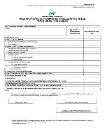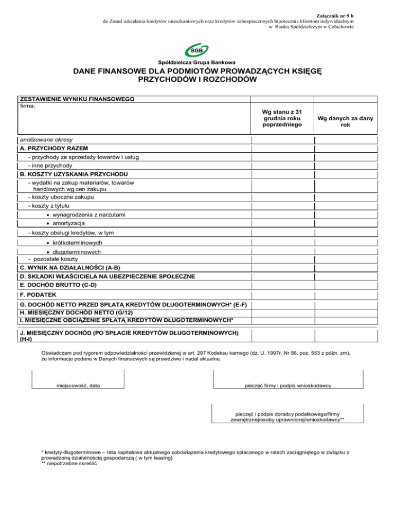 Załącznik nr 9 b do Zasad udzielania kredytów mieszkaniowych oraz kredytów zabezpieczonych hipotecznie klientom indywidualnym w Banku Spółdzielczym w Człuchowie DANE FINANSOWE DLA PODMIOTÓW PROWADZĄCYCH KSIĘGĘ PRZYCHODÓW I ROZCHODÓW ZESTAWIENIE WYNIKU FINANSOWEGO firma: Wg stanu z 31 grudnia roku poprzedniego Wg danych za dany rok analizowane okresy A. PRZYCHODY RAZEM - przychody ze sprzedaży towarów i usług - inne przychody B. KOSZTY UZYSKANIA PRZYCHODU - wydatki na zakup materiałów, towarów handlowych wg cen zakupu - koszty uboczne zakupu - koszty z tytułu wynagrodzenia z narzutami amortyzacja - koszty obsługi kredytów, w tym krótkoterminowych długoterminowych - pozostałe koszty C. WYNIK NA DZIAŁALNOŚCI (A-B) D. SKŁADKI WŁAŚCICIELA NA UBEZPIECZENIE SPOŁECZNE E. DOCHÓD BRUTTO (C-D) F. PODATEK G. DOCHÓD NETTO PRZED SPŁATĄ KREDYTÓW DŁUGOTERMINOWYCH* (E-F) H. MIESIĘCZNY DOCHÓD NETTO (G/12) I. MIESIĘCZNE OBCIĄŻENIE SPŁATĄ KREDYTÓW DŁUGOTERMINOWYCH* J. MIESIĘCZNY DOCHÓD (PO SPŁACIE KREDYTÓW DŁUGOTERMINOWYCH) (H-I) Oświadczam pod rygorem odpowiedzialności przewidzianej w art. 297 Kodeksu karnego (dz. U. 1997r. Nr 88, poz. 553 z póżn. zm), że informacje podane w Danych finansowych są prawdziwe i nadal aktualne. miejscowość, data pieczęć firmy i podpis wnioskodawcy pieczęć i podpis doradcy podatkowego/firmy zewnętrznej/osoby uprawnionej/wnioskodawcy** * kredyty długoterminowe – rata kapitałowa aktualnego zobowiązania kredytowego spłacanego w ratach zaciągniętego w związku z prowadzoną działalnością gospodarczą ( w tym leasing) ** niepotrzebne skreślić Załącznik nr 9 b do Zasad udzielania kredytów mieszkaniowych oraz kredytów zabezpieczonych hipotecznie klientom indywidualnym w Banku Spółdzielczym w Człuchowie ______________________________________________________________________________________________ (wypełnia pracownik banku) dochody zweryfikowano: ___________________________________ przyjęto do oceny zdolności kredytowej średniomiesięczny dochód w wysokości: _______________________________________ weryfikacji oświadczenia klienta o uzyskiwanych dochodach dokonano w oparciu o:_______________________________________ data i podpis pracownika dokonującego weryfikacji dochodów _______________________________________