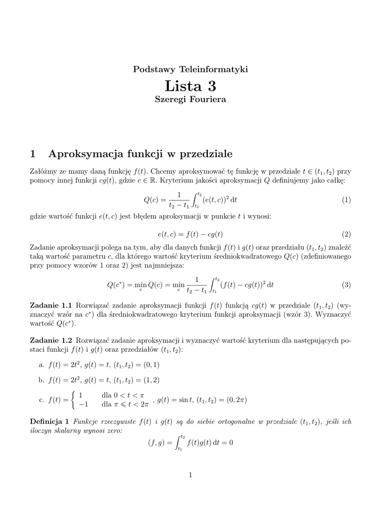 Zadanie 1.3 Aproksymować funkcję f (t) w przedziale (t1 , t2 ) poprzez kombinację liniową n ortogonalnych funkcji g1 (t), g2 (t), ..., gn (t) używając średniokwadratowego ktryterium jakości (wyznaczyć