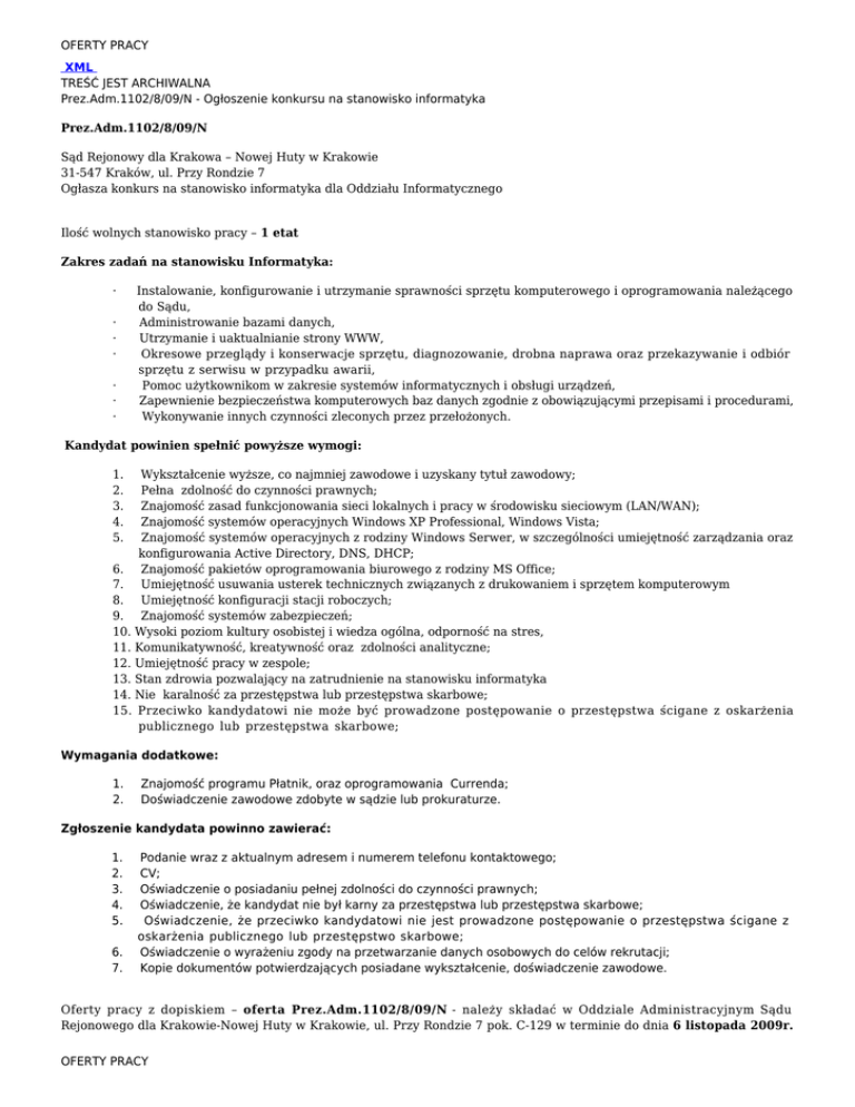 OFERTY PRACY XML TREŚĆ JEST ARCHIWALNA Prez.Adm.1102/8/09/N - Ogłoszenie konkursu na stanowisko informatyka Prez.Adm.1102/8/09/N Sąd Rejonowy dla Krakowa – Nowej Huty w Krakowie 31-547 Kraków, ul. Przy Rondzie 7 Ogłasza konkurs na stanowisko informatyka dla Oddziału Informatycznego Ilość wolnych stanowisko pracy – 1 etat Zakres zadań na stanowisku Informatyka: · · · · · · · Instalowanie, konfigurowanie i utrzymanie sprawności sprzętu komputerowego i oprogramowania należącego do Sądu, Administrowanie bazami danych, Utrzymanie i uaktualnianie strony WWW, Okresowe przeglądy i konserwacje sprzętu, diagnozowanie, drobna naprawa oraz przekazywanie i odbiór sprzętu z serwisu w przypadku awarii, Pomoc użytkownikom w zakresie systemów informatycznych i obsługi urządzeń, Zapewnienie bezpieczeństwa komputerowych baz danych zgodnie z obowiązującymi przepisami i procedurami, Wykonywanie innych czynności zleconych przez przełożonych. Kandydat powinien spełnić powyższe wymogi: 1. 2. 3. 4. 5. Wykształcenie wyższe, co najmniej zawodowe i uzyskany tytuł zawodowy; Pełna zdolność do czynności prawnych; Znajomość zasad funkcjonowania sieci lokalnych i pracy w środowisku sieciowym (LAN/WAN); Znajomość systemów operacyjnych Windows XP Professional, Windows Vista; Znajomość systemów operacyjnych z rodziny Windows Serwer, w szczególności umiejętność zarządzania oraz konfigurowania Active Directory, DNS, DHCP; 6. Znajomość pakietów oprogramowania biurowego z rodziny MS Office; 7. Umiejętność usuwania usterek technicznych związanych z drukowaniem i sprzętem komputerowym 8. Umiejętność konfiguracji stacji roboczych; 9. Znajomość systemów zabezpieczeń; 10. Wysoki poziom kultury osobistej i wiedza ogólna, odporność na stres, 11. Komunikatywność, kreatywność oraz zdolności analityczne; 12. Umiejętność pracy w zespole; 13. Stan zdrowia pozwalający na zatrudnienie na stanowisku informatyka 14. Nie karalność za przestępstwa lub przestępstwa skarbowe; 15. Przeciwko kandydatowi nie może być prowadzone postępowanie o przestępstwa ścigane z oskarżenia publicznego lub przestępstwa skarbowe; Wymagania dodatkowe: 1. 2. Znajomość programu Płatnik, oraz oprogramowania Currenda; Doświadczenie zawodowe zdobyte w sądzie lub prokuraturze. Zgłoszenie kandydata powinno zawierać: 1. 2. 3. 4. 5. 6. 7. Podanie wraz z aktualnym adresem i numerem telefonu kontaktowego; CV; Oświadczenie o posiadaniu pełnej zdolności do czynności prawnych; Oświadczenie, że kandydat nie był karny za przestępstwa lub przestępstwa skarbowe; Oświadczenie, że przeciwko kandydatowi nie jest prowadzone postępowanie o przestępstwa ścigane z oskarżenia publicznego lub przestępstwo skarbowe; Oświadczenie o wyrażeniu zgody na przetwarzanie danych osobowych do celów rekrutacji; Kopie dokumentów potwierdzających posiadane wykształcenie, doświadczenie zawodowe. Oferty pracy z dopiskiem – oferta Prez.Adm.1102/8/09/N - należy składać w Oddziale Administracyjnym Sądu Rejonowego dla Krakowie-Nowej Huty w Krakowie, ul. Przy Rondzie 7 pok. C-129 w terminie do dnia 6 listopada 2009r. OFERTY PRACY OFERTY PRACY bądź droga pocztową /decyduje data stempla pocztowego/ . Oferty otrzymane po terminie mogą zostać nie rozpatrzone. Lista osób zakwalifikowanych do drugiego etapu konkursu praktycznego sprawdzenia umiejętności, a także po zakończeniu konkursu rezerwowa lista kandydatów zostanie ogłoszona na stronie internetowej Sądu w zakładce: Aktualności/Ogłoszenia http://www.krakow-nowahuta.sr.gov.pl . Prosimy o dołączenie oświadczenia następującej treści: „Wyrażam zgodę na przetwarzanie moich danych osobowych zawartych w ofercie dla potrzeb niezbędnych do przeprowadzenia procesu rekrutacji ( zgodnie z ustawą z dn. 20.08.1997r. o ochronie danych osobowych Dz. U. Nr 133 poz.883) „ Prezes Sądu Rejonowego Dla Krakowa-Nowej Huty w Krakowie SSO Katarzyna Wierzbicka Podmiot publikujący Sąd Rejonowy dla KRAKOWA NOWEJ HUTY W KRAKOWIE Wytworzył prezes Katarzyna Wierzbicka - Prezes Sądu 2009-11-03 Publikujący - OFERTY PRACY