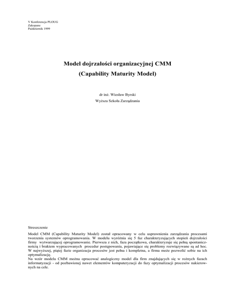 V Konferencja PLOUG Zakopane Październik 1999 Model dojrzałości organizacyjnej CMM (Capability Maturity Model) dr inż. Wiesław Byrski Wyższa Szkoła Zarządzania Streszczenie Model CMM (Capability Maturity Model) został opracowany w celu usprawnienia zarządzania procesami tworzenia systemów oprogramowania. W modelu wyróżnia się 5 faz charakteryzujących stopień dojrzałości firmy wytwarzającej oprogramowanie. Pierwsza z nich, faza początkowa, charakteryzuje się pełną spontanicznością i brakiem wypracowanych procedur postępowania, pojawiające się problemy rozwiązywane są ad hoc. W najwyższej, piątej fazie organizacja procesów jest pełna i kompletna, a firma może pozwolić sobie na ich optymalizację. Na wzór modelu CMM można opracować analogiczny model dla firm znajdujących się w rożnych fazach informatyzacji - od pozbawionej nawet elementów komputeryzacji do fazy optymalizacji procesów nakierownych na cele. 1. Wstęp Prowadzane przez kilka lat intensywne badania firm produkujących oprogramowanie w celu usprawnienia „przemysłowego” procesu wytwarzania oprogramowania doprowadziły do stworzenia bardzo ciekawego „Modelu dojrzałości organizacji software’owej” (Capability Maturity Model for Software) w skrócie CMM. Model ten opracowano w 1991 r. Software Engineering Institute z Carnagie Mellon University. Raport SEI znaleźć można np. w [4], a bogatą bibliografię nt. modeli CMM w [1]. Konstrukcję CMM oparta jest na koncepcji „dojrzałości” zarządzania procesami1, gdzie przez dojrzałość rozumiany jest stopień „zapanowania” nad zachodzącymi w firmie procesami. Chodzi tu nie tylko o procesy techniczne związane z bezpośrednim wytwarzaniem oprogramowania ale również o procesy zarządzania na poziomie operacyjnym i poziomie strategicznym. Bezpośrednia korzyść z modelu polega na wskazaniu kierunku zmian organizacji w celu osiągnięcia większej skuteczności. W modelu CMM zawarte są powszechnie przyjmowane zasady i ustalone praktyki postępowania określające stopień dojrzałości swoich procesów software’owych co może pomóc organizacjom wytwarzającym oprogramowanie na zaplanowanie ewolucyjnej ścieżki swojego rozwoju od chaotycznego, ad hoc, procesu do zdyscyplinowanego, mierzalnego i bezustannie doskonalonego dojrzałego procesu. 2. Konstrukcja modelu CMM 2.1. Struktura modelu CMM W modelu CMM wyróżniono pięć poziomów dojrzałości. Każdy poziom, z wyjątkiem pierwszego, ma podobną strukturę, przedstawioną na rys. 1: 1 warto wspomnieć w tym miejscu, że orientacja zarządzania na procesy została wywołana przez funkcjonującą w biznesie modę na reinżynierię procesu zarządzania, w chwili obecnej zostało z niej jako najwartościowsza część właśnie spojrzenie na firmę przez pryzmat zachodzących w niej procesów 2 Poziom dojrzałości określa Wyznaczony przez Dojrzałość procesu Kluczowe procesy Określane przez Organizowane Cele Atrybuty procesu Z zakresu Opisują Implementacji i organizacji Zasady praktyki określające Infrastructurę albo działanie rys 1 Struktura modelu CMM Poszczególne pojęcia za pomocą których opisywany jest model CMMM pokazany na rysunku 1 określane są następująco: • • • • • • poziom dojrzałości (maturity level) - rozumie się w tym modelu ustabilizowany poziom organizacji procesów zarządzania i technologicznych, dojrzałość procesu (proces capability) oznacza stopień możliwości przewidzenia jakie będą skutki tego procesu przy kolejnym jego uruchomieniu, procesy kluczowe (key process areas) określają grupę powiązanych odpowiednimi relacjami działań, które wykonywane wspólnie pozwolą na osiągnięcie celów uznawanych za istotne dla stopnia dojrzałości procesu, cele (goals) wyznaczają zakres, granice i intencje każdej dziedziny procesu, atrybuty procesu (common features) określone są w pięciu grupach: akceptacji stosowania, możliwości stosowania, mierzalności i analiz oraz weryfikacji implementacji. Atrybuty te pozwalają na określenie czy stosowanie kluczowych procesów jest efektywne, powtarzalne i skuteczne. Występuje silne powiązanie z ogólną kulturą organizacyjną firmy. zasady praktyki (key practices) określają infrastrukturę i postępowanie w celu najskuteczniejszego wykonania kluczowych procesów. 3 2.2 Poziomy dojrzałości Hierarchię poziomów dojrzałości w modelu CMM przedstawia rys. 2. Ciągłe doskonalenie procesów Przewidywalne procesy Optymalizacji Zarządzany Standardowe, spójne procesy Zdefiniowany Procesy uporządkowane Powtarzalny Początkowy Rys. 2. Pięć poziomów dojrzałości software’owej (Software Process Maturity) 1) Poziom początkowy: Organizacje znajdujące się na tym poziomie z reguły nie mają stabilnego środowiska projektowania i produkcji oprogramowania. Nawet jeżeli firma ma dobrze opanowaną techniczną stronę produkcji oprogramowania (narzędzia, fachowcy, metodyka itp.) to gdy brakuje w niej dobrych organizatorów proces wytwarzania oprogramowania jest nieustalony, wymyślany ad hoc, a często nawet chaotyczny. Zaledwie niektóre procesy są zdefiniowane (o ile w ogóle jakiekolwiek istnieją), a udanie się projektu zależy od indywidualnego wysiłku i talentu poszczególnych projektantów. Jakość wytworzonego oprogramowania jest sprawą przypadku i silnie zależy od umiejętności zaangażowanych jednostek. Dla menadżerów takich firm, jeżeli nie są informatykami, proces produkcji oprogramowania jest jedną, wielką czarną skrzynką. 2) Poziom powtarzalny Na tym poziomie znajduje się organizacja, która wprowadziła podstawowe procesy zarządzania projektami czyli opanowała umiejętność określenia wielkości oprogramowania, niezbędnych zasobów do jego wytworzenia, potrafi oszacować koszt i harmono- 4 gram itp. Opanowane są również elementy zarządzania jakością. Poziom ten nazywa się powtarzalnym, gdyż organizacja stosuje sposoby 