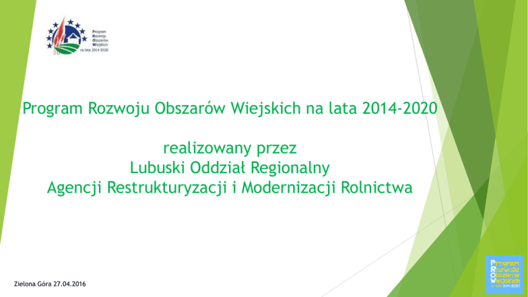 Program Rozwoju Obszarów Wiejskich na lata 2014-2020 realizowany przez Lubuski Oddział Regionalny Agencji Restrukturyzacji i Modernizacji Rolnictwa Zielona Góra 27.04.2016 Zgodnie z USTAWĄ z dnia 20 lutego 2015 r. o wspieraniu rozwoju obszarów wiejskich z udziałem środków Europejskiego Funduszu Rolnego na rzecz Rozwoju Obszarów Wiejskich w ramach Programu Rozwoju Obszarów Wiejskich na lata 2014–2020 ARiMR jest agencją płatniczą Jednocześnie z 14 działań określonych w w/w ustawie ARiMR wdraża 8 z 14 działań PROW 2014-2020 Działania dla których ARiMR jest podmiotem wdrażającym to: Działanie 4 - Inwestycje w środki trwałe poddziałania: 4.1 wsparcie inwestycji w gospodarstwa rolne 4.2 wsparcie inwestycji w przetwarzanie produktów rolnych, obrót nimi i ich rozwój Działanie 5 - przywracanie potencjału produkcji rolnej zniszczonego w wyniku klęsk żywiołowych i katastrof oraz wprowadzanie odpowiednich środków zapobiegawczych poddziałania: 5.1 wsparcie inwestycji w środki zapobiegawcze, których celem jest ograniczanie skutków prawdopodobnych klęsk żywiołowych, niekorzystnych zjawisk klimatycznych i katastrof, 5.2 wsparcie inwestycji w odtwarzanie gruntów rolnych i przywracanie potencjału produkcji rolnej zniszczonego w wyniku klęsk żywiołowych, niekorzystnych zjawisk klimatycznych i katastrof Działania dla których ARiMR jest podmiotem wdrażającym to: Działanie 6: Rozwój gospodarstw i działalności gospodarczej poddziałania: 6.1 pomoc w rozpoczęciu działalności gospodarczej na rzecz młodych rolników 6.2 pomoc na rozpoczęcie pozarolniczej działalności gospodarczej na obszarach wiejskich 6.3 pomoc na rozpoczęcie działalności gospodarczej na rzecz rozwoju małych gospodarstw 6.4 wsparcie inwestycji w tworzenie i rozwój działalności pozarolniczej 6.5 płatności na rzecz rolników kwalifikujących się do systemu dla małych gospodarstw, którzy trwale przekazali swoje gospodarstwo innemu rolnikowi Działanie 8: Inwestycje w rozwój obszarów leśnych i poprawę żywotności lasów Działania dla których ARiMR jest podmiotem wdrażającym to: Działanie 9: Tworzenie grup producentów i organizacji producentów Działanie 10: Działanie rolno-środowiskowo-klimatyczne Działanie 11: Rolnictwo ekologiczne Działanie 12: Płatności dla obszarów z ograniczeniami naturalnymi lub innymi szczególnymi ograniczeniami Harmonogram wdrożenia Działanie 10: Działanie rolno-środowiskowo-klimatyczne – wdrożono realizację z dniem 15 marca 2015 r. Działanie 11: Rolnictwo ekologiczne – wdrożono realizację z dniem 15 marca 2015 r. Działanie 12: Płatności dla obszarów z ograniczeniami naturalnymi lub innymi szczególnymi ograniczeniami – wdrożono realizację z dniem 15 marca 2015 r. Harmonogram wdrożenia Działanie 8: Inwestycje w rozwój obszarów leśnych i poprawę żywotności lasów – wdrożono realizację z dniem 15 czerwca 2015 r. Działanie 6: Rozwój gospodarstw i działalności gospodarczej poddziałania: 6.1 pomoc w rozpoczęciu działalności gospodarczej na rzecz młodych rolników – wdrożono realizację z dniem 20 sierpnia 2015 r. Działanie 4 - Inwestycje w środki trwałe poddziałania: 4.1 wsparcie inwestycji w gospodarstwa rolne – wdrożono realizację z dniem 19 października 2015 r. Harmonogram wdrożenia Działanie 9: Tworzenie grup producentów i organizacji producentów - planowane wdrożenie czerwiec 2016 r. Działanie 4 - Inwestycje w środki trwałe poddziałanie: 4.2 wsparcie inwestycji w przetwarzanie produktów rolnych, obrót nimi i ich rozwój - planowane wdrożenie lipiec 2016 r. Działanie 5 - przywracanie potencjału produkcji rolnej zniszczonego w wyniku klęsk żywiołowych i katastrof oraz wprowadzanie odpowiednich środków zapobiegawczych - planowane wdrożenie sierpień 2016 r. Działanie 6: Rozwój gospodarstw i działalności gospodarczej poddziałanie: 6.4 wsparcie inwestycji w tworzenie i rozwój działalności pozarolniczej - planowane wdrożenie październik 2016 r. Harmonogram wdrożenia Działanie 6: Rozwój gospodarstw i działalności gospodarczej poddziałania: 6.2 pomoc na rozpoczęcie pozarolniczej działalności gospodarczej na obszarach wiejskich 6.3 pomoc na rozpoczęcie działalności gospodarczej na rzecz rozwoju małych gospodarstw 6.5 płatności na rzecz rolników kwalifikujących się do systemu dla małych gospodarstw, którzy trwale przekazali swoje gospodarstwo innemu rolnikowi - planowane wdrożenie I kwartał 2017 r. Zgodnie z aktualnie obowiązującym Rozporządzeniem Ministra Rolnictwa i Rozwoju Wsi z dnia 12 października 2015 r. w sprawie wysokości limitów środków dostępnych w poszczególnych województwach lub latach w ramach określonych działań lub poddziałań Programu Rozwoju Obszarów Wiejskich na lata 2014–2020 (Dz. U. z 2015 r. poz. 1755) Wojewódzkie koperty finansowe wyznaczone zostały tylko w działaniach: - Wsparcie inwestycji w gospodarstwach rolnych na operacje typu modernizacja gospodarstw rolnych z przeznaczeniem na operacje związane z racjonalizacją technologii produkcji, wprowadzeniem innowacji, zmianą profilu produkcji, zwiększeniem skali produkcji, poprawą jakości produkcji lub zwiększeniem wartości dodanej produktu (obszar D) - Limit na 2016 r. - 8 073 737 euro - Pomoc na rozpoczęcie pozarolniczej działalności gospodarczej na obszarach wiejskich - Limit na 2016 r. - 1 324 608 euro - Pomoc na rozpoczęcie działalności gospodarczej na rzecz rozwoju małych gospodarstw - Limit na 2016 r. - 2 222 168 euro - Pomoc w rozpoczęciu działalności gospodarczej na rzecz młodych rolników - Limit na okres 2015-2020 r. - 17 217 586 euro Pierwszy nabór wniosków o przyznanie pomocy w ramach działania „Działanie rolno-środowiskowo-klimatyczne” przeprowadzony został w okresie od 15 marca do 10 lipca 2015 r. W ramach naboru do Biur Powiatowych ARiMR w województwie lubuskim wpłynęło 460 wniosków Trwa wydawa
