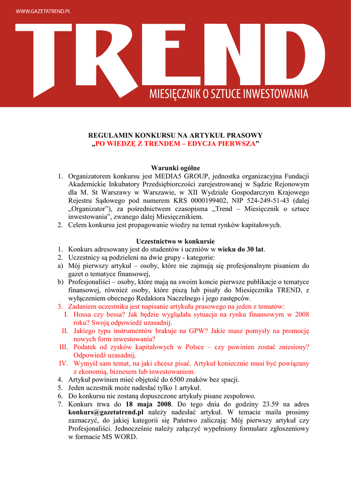REGULAMIN KONKURSU NA ARTYKUŁ PRASOWY „PO WIEDZĘ Z TRENDEM – EDYCJA PIERWSZA” Warunki ogólne 1. Organizatorem konkursu jest MEDIA5 GROUP, jednostka organizacyjna Fundacji Akademickie Inkubatory Przedsiębiorczości zarejestrowanej w Sądzie Rejonowym dla M. St Warszawy w Warszawie, w XII Wydziale Gospodarczym Krajowego Rejestru Sądowego pod numerem KRS 0000199402, NIP 524-249-51-43 (dalej „Organizator”), za pośrednictwem czasopisma „Trend – Miesięcznik o sztuce inwestowania”, zwanego dalej Miesięcznikiem. 2. Celem konkursu jest propagowanie wiedzy na temat rynków kapitałowych. Uczestnictwo w konkursie 1. Konkurs adresowany jest do studentów i uczniów w wieku do 30 lat. 2. Uczestnicy są podzieleni na dwie grupy - kategorie: a) Mój pierwszy artykuł – osoby, które nie zajmują się profesjonalnym pisaniem do gazet o tematyce finansowej, b) Profesjonaliści – osoby, które mają na swoim koncie pierwsze publikacje o tematyce finansowej, również osoby, które piszą lub pisały do Miesięcznika TREND, z wyłączeniem obecnego Redaktora Naczelnego i jego zastępców. 3. Zadaniem uczestnika jest napisanie artykułu prasowego na jeden z tematów: I. Hossa czy bessa? Jak będzie wyglądała sytuacja na rynku finansowym w 2008 roku? Swoją odpowiedź uzasadnij. II. Jakiego typu instrumentów brakuje na GPW? Jakie masz pomysły na promocję nowych form inwestowania? III. Podatek od zysków kapitałowych w Polsce – czy powinien zostać zniesiony? Odpowiedź uzasadnij. IV. Wymyśl sam temat, na jaki chcesz pisać. Artykuł koniecznie musi być powiązany z ekonomią, biznesem lub inwestowaniem. 4. Artykuł powinien mieć objętość do 6500 znaków bez spacji. 5. Jeden uczestnik może nadesłać tylko 1 artykuł. 6. Do konkursu nie zostaną dopuszczone artykuły pisane zespołowo. 7. Konkurs trwa do 18 maja 2008. Do tego dnia do godziny 23.59 na adres [email protected] należy nadesłać artykuł. W temacie maila prosimy zaznaczyć, do jakiej kategorii się Państwo zaliczają: Mój pierwszy artykuł czy Profesjonaliści. Jednocześnie należy załączyć wypełniony formularz zgłoszeniowy w formacie MS WORD. 8. Zgłoszenie do konkursu powinno zawierać: - artykuł w formie elektronicznej w formacie DOC ; - wypełniony formularz zgłoszeniowy, dostępny w portalu www.gazetatrend.pl . Zasady oceny 1. Jury przy ocenie będzie brało pod uwagę następujące kryteria: - zawartość merytoryczna artykułu; - ciekawa forma tekstu, kreatywność piszącego; - poprawność stylistyczna i gramatyczna. 2. Ogłoszenie wyników konkursu nastąpi nie później niż do dnia 9 czerwca 2008, w portalu inwestycyjnym miesięcznika TREND. Informacja zostanie podana również na łamach czasopisma TREND edycja czerwiec 2008 3. Przewiduje się przyznanie nagród za 3 pierwsze miejsca w obu kategoriach. 4. Laureaci pierwszych 3 miejsc obydwu kategoriach otrzymają w nagrodę zestaw książek o tematyce giełdowej i finansowej, a ich artykuły zostaną opublikowane w Miesięczniku lub w portalu www.gazetatrend.pl. Do wygrania książki o wartości: - miejsce 1: ok. 300 zł; - miejsce 2: ok. 200 zł; - miejsce 3: ok. 100 zł; oraz nagrody niespodzianki. 5. Fundatorami nagród są: Fundacja Edukacji Rynku Kapitałowego, Oficyna Wydawnicza SGH, Wydawnictwo Naukowe PWN, Księgarnia Uniwersytecka Liber. 6. Organizator konkursu zastrzega sobie możliwość zmiany nagród konkursowych w czasie trwania konkursu oraz po zakończeniu. 1. 2. 3. 4. Postanowienia końcowe Nadsyłając pracę na konkurs autor zgadza się na jej publikację w Miesięczniku i w portalu inwestycyjnym www.gazetatrend.pl oraz przenosi wszelkie prawa autorskie do artykułu na rzecz wydawcy Miesięcznika. Uczestnik konkursu wyraża zgodę na przetwarzanie danych osobowych na potrzeby konkursu oraz na potrzeby związane z promocją miesięcznika TREND oraz dodanie adresu do listy mailingowej portalu inwestycyjnego www.gazetaTREND.pl. Organizator zastrzega sobie prawo do odstąpienia od przyznania nagród, jeśli żadna z nadesłanych prac nie spełni warunków i wymogów określonych w Regulaminie. Po ogłoszeniu listy zwycięzców podany zostanie termin rozdania nagród. Po tym czasie ksiązki będzie można odebrać osobiście w biurze Akademickich Inkubatorów Przedsiębiorczości w Szkole Głównej Handlowej w okresie jednego miesiąca od ogłoszenia wyników. Brak odbioru nagrody we wskazanym okresie czasu powoduje przejście nagród na potrzeby innych konkursów, które będą organizowane przez wydawcę. 5. Niniejszy Regulamin jest jedynym dokumentem określającym zasady Konkursu. 6. W przypadku pytań prosimy o kontakt z Anną Grodecką pod adresem [email protected] .