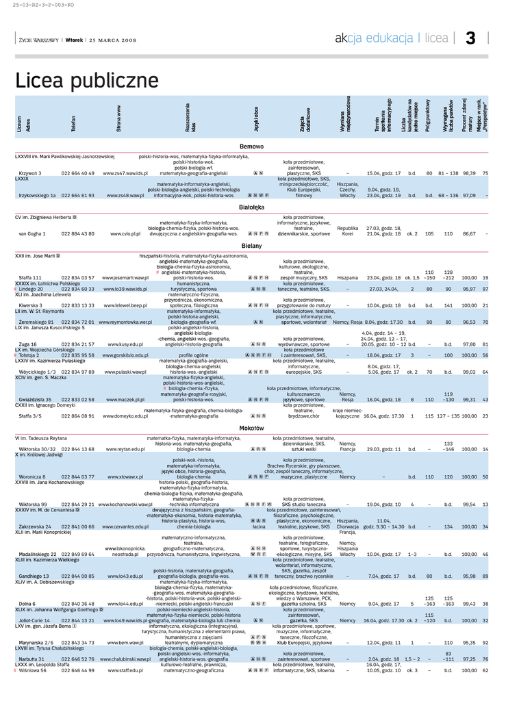 25-03-RZ-3-P-003-KO akcja edukacja | licea | Wtorek | 25 marca 2008 3 Miejsce w rank. „Perspektyw” Procent zdanej matury Wymagana liczba punktów Próg punktowy Liczba kandydatów na jedno miejsce Termin spotkania informacyjnego Wymiana międzynarodowa Zajęcia dodatkowe Języki obce Rozszerzenia klas Strona www Telefon Adres Liceum Licea publiczne Bemowo LXXVIII im. Marii Pawlikowskiej-Jasnorzewskiej Krzywoń 3 LXXIX Irzykowskiego 1a 022 664 40 49 022 664 61 93 polski-historia-wos, matematyka-fizyka-informatyka, polski-historia-wok. polski-biologia-wf. www.zs47.waw.ids.pl matematyka-geografia-angielski AN matematyka-informatyka-angielski, polski-biologia-angielski, polski-technologia www.zs48.waw.pl informacyjna-wok, polski-historia-wos ANWF koła przedmiotowe, zainteresowań, plastyczne, SKS koła przedmiotowe, SKS, miniprzedsiębiorczość, Klub Europejski, filmowy – 15.04, godz. 17 b.d. 80 81 – 138 98,39 75 Hiszpania, Czechy, Włochy 9.04, godz. 19, 23.04, godz. 19 b.d. b.d. 68 – 136 97,09 – koła przedmiotowe, informatyczne, językowe, teatralne, dziennikarskie, sportowe Republika Korei 27.03, godz. 18, 21.04, godz. 18 ok. 2 105 86,67 – 100,00 19 95,97 97 100,00 21 96,53 70 97,80 81 100,00 56 99,02 64 99,31 43 100,00 23 Białołęka CV im. Zbigniewa Herberta D van Gogha 1 022 884 43 80 www.cvlo.pl.pl matematyka-fizyka-informatyka, biologia-chemia-fizyka, polski-historia-wos. dwujęzyczna z angielskim-geografia-wos. ANFR 110 Bielany XXII im. Jose Marti D Staffa 111 022 834 03 57 XXXIX im. Lotnictwa Polskiego # Lindego 20 022 834 60 33 XLI im. Joachima Lelewela Kiwerska 3 022 833 13 33 LII im. W. St. Reymonta Żeromskiego 81 022 834 72 01 LIX im. Janusza Kusocińskiego S Zuga 16 022 834 21 57 LX im. Wojciecha Górskiego # Tołstoja 2 022 835 95 58 LXXIV im. Kazimierza Pułaskiego Wóycickiego 1/3 022 834 97 89 XCIV im. gen. S. Maczka Gwiaździsta 35 022 833 02 58 CXXII im. Ignacego Domeyki Staffa 3/5 022 864 08 91 hiszpański-historia, matematyka-fizyka-astronomia, angielski-matematyka-geografia, koła przedmiotowe, biologia-chemia-fizyka-astronomia, kulturowe, ekologiczne, teatralne, 110 128 # angielski-matematyka-historia, www.josemarti.waw.pl polski-historia-wos. ANFH zespół muzyczny, SKS Hiszpania 23.04, godz. 18 ok. 1,5 –150 –212 humanistyczna, koła przedmiotowe, www.lo39.waw.ids.pl turystyczna, sportowa ANR taneczne, teatralne, SKS. – 27.03, 24.04, 2 80 90 matematyczno-fizyczna, przyrodnicza, ekonomiczna, koła przedmiotowe, www.lelewel.beep.pl społeczna, filologiczna ANFH przygotowanie do matury – 10.04, godz. 18 b.d. b.d. 141 matematyka-informatyka, koła przedmiotowe, teatralne, polski-historia-angielski, plastyczne, informatyczne, www.reymontowka.wer.pl biologia-geografia-wf. AN sportowe, wolontariat Niemcy, Rosja 8.04, godz. 17.30 b.d. 80 80 polski-angielski-historia, angielski-biologia4.04, godz. 14 – 19, -chemia, angielski-wos.-geografia, koła przedmiotowe, 24.04, godz. 12 – 17, www.kusy.edu.pl angielski-historia-geografia ANR wyrównawcze, sportowe – 20.05, godz. 10 – 12 b.d. – b.d. koła przedmiotowe www.gorskilxlo.edu.pl profile ogólne ANRFH i zainteresowań, SKS, – 18.04, godz. 17 3 – 100 matematyka-geografia-angielski, koła przedmiotowe, teatralne, biologia-chemia-angielski, informatyczne, 8.04, godz. 17, www.pulaski.waw.pl historia-wos.-angielski ANFR europejskie, SKS – 5.06, godz. 17 ok. 2 70 b.d. matematyka-fizyka-angielski, polski-historia-wos-angielski, koła przedmiotowe, informatyczne, # biologia-chemia.-fizyka, matematyka-geografia-rosyjski, kulturoznawcze, Niemcy, 119 www.maczek.pl.pl polski-historia-wos. ANFR językowe, sportowe Rosja 16.04, godz. 18 8 110 –130 koła przedmiotowe, matematyka-fizyka-geografia, chemia-biologiateatralne, kraje niemiecwww.domeyko.edu.pl -matematyka-geografia ANR brydżowe,chór kojęzyczne 16.04, godz. 17.30 1 115 127 – 135 Mokotów VI im. Tadeusza Reytana Wiktorska 30/32 022 844 13 68 X im. Królowej Jadwigi matematka-fizyka, matematyka-informatyka, historia-wos. matematyka-geografia, www.reytan.edu.pl biologia-chemia ARN koła przedmiotowe, teatralne, dziennikarskie, SKS, Niemcy, sztuki walki Francja 29.03, godz. 11 b.d. polski-wok.-historia, koła przedmiotowe, matematyka-informatyka, Bractwo Rycerskie, gry planszowe, języki obce, historia-geografia, chór, zespół taneczny, informatyczne, Woronicza 8 022 844 03 77 www.xlowaw.x.pl biologia-chemia ARNF muzyczne, plastyczne Niemcy – b.d. XXVIII im. Jana Kochanowskiego historia-polski, geografia-historia, matematyka-fizyka-informatyka, chemia-biologia-fizyka, matematyka-geografia, matematyka-fizykakoła przedmiotowe, Wiktorska 99 022 844 29 21 www.kochanowski.waw.pl -technika informatyczna ANRFW SKS studio taneczna – 19.04, godz. 10 4 XXXIV im. M. de Cervantesa D dwujęzyczna z hiszpańskim, geografiakoła przedmiotowe, zainteresowań, -matematyka-ekonomia, historia-matematyka, filozoficzne, psychologiczne, historia-plastyka, historia-wos, HAR plastyczne, ekonomiczne, Hiszpania, 11.04, Zakrzewska 24 022 841 00 66 www.cervantes.edu.pl chemia-biologia łacina teatralne, językowe, SKS Chorwacja godz. 9.30 – 14.30 b.d. XLII im. Marii Konopnickiej Francja, matematyczno-informatyczna, koła przedmiotowe, teatralna, teatralne, fotograficzne, Niemcy, www.lokonopnicka. geograficzno-matematyczna, ANH sportowe, turystycznoHiszpania Madalińskiego 22 022 849 69 64 neostrada.pl przyrodnicza, humanistyczna, lingwistyczna, WRF -ekologiczne, misyjne, SKS Włochy 10.04, godz. 17 1–3 XLIII im. Kazimierza Wielkiego koła przedmiotowe, teatralne, wolontariat, informatyczne, polski-historia, matematyka-geografia, SKS, gazetka, zespół Gandhiego 13 022 844 00 85 www.lo43.edu.pl geografia-biologia, geografia-wos. A N F R taneczny, bractwo rycerskie – 7.04, godz. 17 b.d. XLIV im. A. Dobiszewskiego matematyka-fizyka-informatyka, biologia-chemia-fizyka, matematykakoła przedmiotowe, filozoficzne, -geografia-wos. matematyka-geografiaekologicz