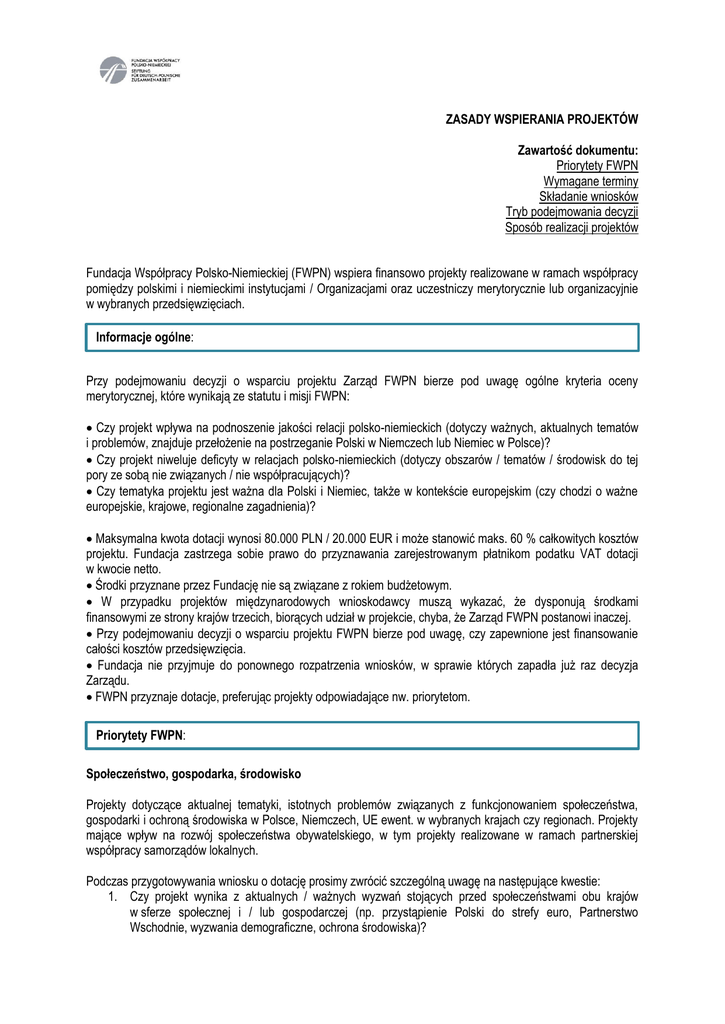ZASADY WSPIERANIA PROJEKTÓW Zawartość dokumentu: Priorytety FWPN Wymagane terminy Składanie wniosków Tryb podejmowania decyzji Sposób realizacji projektów Fundacja Współpracy Polsko-Niemieckiej (FWPN) wspiera finansowo projekty realizowane w ramach współpracy pomiędzy polskimi i niemieckimi instytucjami / Organizacjami oraz uczestniczy merytorycznie lub organizacyjnie w wybranych przedsięwzięciach. Informacje ogólne: Przy podejmowaniu decyzji o wsparciu projektu Zarząd FWPN bierze pod uwagę ogólne kryteria oceny merytorycznej, które wynikają ze statutu i misji FWPN: Czy projekt wpływa na podnoszenie jakości relacji polsko-niemieckich (dotyczy ważnych, aktualnych tematów i problemów, znajduje przełożenie na postrzeganie Polski w Niemczech lub Niemiec w Polsce)? Czy projekt niweluje deficyty w relacjach polsko-niemieckich (dotyczy obszarów / tematów / środowisk do tej pory ze sobą nie związanych / nie współpracujących)? Czy tematyka projektu jest ważna dla Polski i Niemiec, także w kontekście europejskim (czy chodzi o ważne europejskie, krajowe, regionalne zagadnienia)? Maksymalna kwota dotacji wynosi 80.000 PLN / 20.000 EUR i może stanowić maks. 60 % całkowitych kosztów projektu. Fundacja zastrzega sobie prawo do przyznawania zarejestrowanym płatnikom podatku VAT dotacji w kwocie netto. Środki przyznane przez Fundację nie są związane z rokiem budżetowym. W przypadku projektów międzynarodowych wnioskodawcy muszą wykazać, że dysponują środkami finansowymi ze strony krajów trzecich, biorących udział w projekcie, chyba, że Zarząd FWPN postanowi inaczej. Przy podejmowaniu decyzji o wsparciu projektu FWPN bierze pod uwagę, czy zapewnione jest finansowanie całości kosztów przedsięwzięcia. Fundacja nie przyjmuje do ponownego rozpatrzenia wniosków, w sprawie których zapadła już raz decyzja Zarządu. FWPN przyznaje dotacje, preferując projekty odpowiadające nw. priorytetom. Priorytety FWPN: Społeczeństwo, gospodarka, środowisko Projekty dotyczące aktualnej tematyki, istotnych problemów związanych z funkcjonowaniem społeczeństwa, gospodarki i ochroną środowiska w Polsce, Niemczech, UE ewent. w wybranych krajach czy regionach. Projekty mające wpływ na rozwój społeczeństwa obywatelskiego, w tym projekty realizowane w ramach partnerskiej współpracy samorządów lokalnych. Podczas przygotowywania wniosku o dotację prosimy zwrócić szczególną uwagę na następujące kwestie: 1. Czy projekt wynika z aktualnych / ważnych wyzwań stojących przed społeczeństwami obu krajów w sferze społecznej i / lub gospodarczej (np. przystąpienie Polski do strefy euro, Partnerstwo Wschodnie, wyzwania demograficzne, ochrona środowiska)? 2. W przypadku samorządów: na ile projekt podniesie jakość współpracy dwustronnej obu partnerów, czy ma wpływ na tę współpracę? 3. Czy projekt przyczynia się do aktywizacji i rozwijania społeczeństwa obywatelskiego w obu krajach? Czy rozwija jego instytucje? 4. Czy efekty płynące z realizacji projektu będą trwałe / długofalowe? 5. W przypadku projektów kierowanych do środowisk eksperckich: w jakim stopniu projekt wykorzystuje twórczo dotychczasowy stan wiedzy i istniejące know-how? Czy przyczynia się do rozwoju dziedziny, której dotyczy? 6. W jakim stopniu projekt wprowadza nowych partnerów, nowe instytucje aktywne w danym obszarze do debaty polsko-niemieckiej i europejskiej? 7. W jakim stopniu / czy projekt przyczynia się do profesjonalizacji / podnoszenia kwalifikacji osób zaangażowanych w danej dziedzinie / danym obszarze? 8. W jakim stopniu / czy / w jakiej formie efekty projektu będą udostępnione szerszym kręgom odbiorców / potencjalnie zainteresowanych ekspertów / specjalistów. Jaka jest koncepcja promocji projektu – czy i jak wykorzystane są media, w tym portale społecznościowe, nieformalne sieci itd.? Edukacja Projekty podnoszące jakość dwu- lub wielostronnych relacji poprzez pogłębienie wiedzy na wybrane tematy (w tym specjalistyczne i historyczne). Podnoszenie kompetencji językowych i wiedzy o kraju sąsiada. Podczas przygotowywania wniosku o dotację prosimy zwrócić szczególną uwagę na następujące kwestie: 1. Czy projekt popularyzuje wiedzę o kraju sąsiada skoncentrowaną na ważnych wybranych tematach, czy pogłębia wiedzę o zagadnieniach interesujących dla obu stron? 2. Czy program projektu odpowiada nowoczesnym standardom edukacyjnym? (aktywne i kreatywne uczestnictwo odbiorców projektu) 3. Czy projekt stwarza możliwość ponownego wykorzystania wyników, poszerzenia grupy docelowej? 4. Czy projekt jest innowacyjny? (np. niekonwencjonalne pomysły dotarcia do grup docelowych, nowoczesne pomoce dydaktyczne); 5. W przypadku projektów związanych z nauczaniem języka polskiego / i lub niemieckiego: czy projekt pobudza zainteresowanie nauką języka polskiego i / lub języka niemieckiego i popularyzuje język polski i / lub język niemiecki dzięki zastosowaniu nowoczesnych i atrakcyjnych metod nauczania? Czy projekt ma wpływ na opracowanie metod i programów nauczania języków polskiego i/lub niemieckiego jako obcego oraz pomocy dydaktycznych? 6. W przypadku projektów historycznych: czy projekt porusza tematy historyczne dotychczas niedostatecznie obecne w działaniach edukacyjnych, czy dociera do grup dotychczas pomijanych? W ramach doskonalenia zawodowego i specjalistycznego należy zwrócić uwagę, czy: 7. program służy dokształcaniu grup zawodowych ze zbliżonych branż, daje impulsy do zastosowania nabytych umiejętności w praktyce? 8. program obejmuje współpracę między instytucjami o podobnym profilu działalności i służy budowaniu ich kompetencji? Preferowana jest współpraca z krajami trzecimi i transfer doświadczeń polsko; 9. program ułatwia wymianę wiedzy i doświadczeń i skierowany jest w szczególności do przedstawicieli samorządów, pracowników trzeciego sektora, multiplikatorów, 