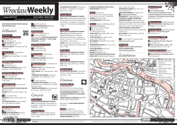 WrocławWeekly OD ZMIERZCHU DO ŚWITU (“From Dusk Till Dawn" / ul. Krupnicza 15) Frakcja (Rock: Free) - 21:00 Free City Guide to Events, Music, Film, Theatre, Museum, Pubs & More Thursday 30th Issue #274-275 WROCŁAW PHILHARMONIC CONCERT HALL Małgorzata Rodek (soprano), Rafał Bartmiński (tenor), Wrocław Philharmonic Orchestra - programe: J. Strauss /J. Strauss Jr /F. Lehar (Classical: 80/40PLN) - 19:00 24.12.2010 - 06.01.2011 > get more online: www.WroclawWeekly.pl > [email protected] Best wishes for the festive season and the New Year! InTheaters Współczesny (Contemporary) Theatre (ul. Rzeźnicza 12) > [24.12.10-30.12.10] Trans-Atlantyk - Thu 19:00 >> [31.12.10-06.01.10] Trans-Atlantyk - Fri 20:00; Sun, TueThu 19:00 Polski Theatre (ul. Zapolskiej 3) >> [31.12.10-06.01.10] Mayday (Run for Your Wife!) - Fri 17:00, 20:00 Polski Theatre: Kameralna (ul. Świdnicka 28) > [24.12.10-30.12.10] Kazimierz i Karolina (Kasimir und Karoline) - Sun, Tue-Thu 19:00 Polski Theatre / Świebodzki (pl. Orląt Lwowskich 20c) >> [31.12.10-06.01.10] Utwór o matce i ojczyźnie - Thu 17:00, 20:00 Komedia Theatre (pl. Teatralny 4) > [24.12.10-30.12.10] Z rączki do rączki (Cash On Delivery) - Sun 17:00 Mayday 2 (It Runs in the Family) - Thu 20:00 >> [31.12.10-06.01.10] Mayday 2 (It Runs in the Family) - Fri 20:00 Szalone nożyczki (Scherenschnitt) Sun 17:00; Wed & Thu 20:00 Lalek (Puppet) Theatre (pl. Teatralny 4) > [24.12.10-30.12.10] Kids Lato Muminków (Moomins’ Summer) - Tue & Wed 15:00 >> [31.12.10-06.01.10] Kids Lato Muminków (Moomins’ Summer) - Tue & Wed 9:00 Ad Spectatores (IMPART / ul. Mazowiecka 17) >> [31.12.10-06.01.10] [New Year’s Eve] “Trzy żelazne zasady mężczyzny seniora" & “Ja tu tylko sprzątam" - Fri 20:00 CAPITOL Musical Theatre (ul. Piłsudskiego 67) >> [31.12.10-06.01.10] Hair - Wed & Thu 19:00 ARKA Theatre (ul. Mennicza 3) >> [31.12.10-06.01.10] Friday 31st WROCŁAW PHILHARMONIC CONCERT HALL Małgorzata Rodek (soprano), Rafał Bartmiński (tenor), Wrocław Philharmonic Orchestra - programe: J. Strauss /J. Strauss Jr /F. Lehar (Classical: 150/120PLN) - 18:00, 20:30 RYNEK “New Year’s Eve Concert" - Ace of Base, Maryla Rodowicz, Feel, Bajm (Pop: Free) - 19:00 Monday 3rd WROCŁAW PHILHARMONIC CONCERT HALL Dixie Tiger’s Band (Jazz: 10PLN) 9:00, 11:00 Kamienie na szaniec (Forbidden Songs) - Tue-Thu 10:00 Tuesday 4th WROCŁAW OPERA (ul. Świdnicka 35) > [24.12.10-30.12.10] WROCŁAW PHILHARMONIC CONCERT HALL Dixie Tiger’s Band (Jazz: 10PLN) 9:00, 11:00 “Romeo i Julia" by S. Prokofiev [CD Playback] - Sun 17:00 “Król Roger" by K. Szymanowski - Wed 19:00 “Opowieści Hoffmanna (Les Contes d’Hoffmann)" by J. Offenbach - Thu 19:00 >> [31.12.10-06.01.10] “Opowieści Hoffmanna (Les Contes d’Hoffmann)" by J. Offenbach - Fri 18:00; Sat & Sun 17:00 “Zemsta nietoperza (Die Fledermaus)" by J. Strauss - Wed & Thu 19:00 Concerts Monday 27th WROCŁAW PHILHARMONIC CONCERT HALL (ul. Piłsudskiego 19) Spirituals Singers Band - “Christmas Carol" (Classical: 60/40PLN) - 19:00 Wednesday 29th ŁYKEND (ul. Podwale 37/38) “Concert: Wrocław Rock & Heavy Metal School" (Free) - 19:00 The Bad Lieutenant: Port of Call New Orleans (US) 20:00 9:45*, 12:45, 15:45, 18:45 Śniadanie do łóżka (PL) 11:15, 13:15, 15:15, 19:30, 21:30 Skrzydlate świnie (PL) 20:00, 22:15 > For Kids (Polish Dubbed): Megamocny / Megamind (US) 17:30 Opowieści z Narnii: Podróż Wędrowca do Świtu / The Chronicles of Narnia: The Voyage of the Dawn Treader (US/GB) 9:30*, 12:00*, 14:30, 17:00, 19:30 / [3D] 10:30*, 13:00, 15:30, 18:00, 20:30 Artur i Minimki 3: Dwa Światy / Arthur et la guerre des deux mondes (FR) 11:00*, 14:15 Mysi agenci / El Ratón Pérez 2 (ES/AR) 10:45*, 12:30, 16:15 LALKA (ul. Prusa 32) [24, 25 & 31.12.10 // Cinema Closed] [26.12.10-30.12.10, 01.01.11-06.01.10] Joanna (PL) 16:00, 20:00 L’Illusionniste (FR/GB) 18:00 HELIOS (Kazimierza Wielkiego 19a-21) http://www.heliosnet.pl > [24.12.10 // Cinema Closed] > [25.12.10-30.12.10] ( * =Not on Sat 25.12.10) TRON: Legacy (US) [3D] 10:00*, 12:45, 15:45, 18:30, 21:15 Little Fockers (US) 10:00*, 12:15*, 14:30, 16:45, 19:00, 21:15 Mr. Nobody (CA/BE/FR) 12:15*, 15:00, 18:15, 21:00 Zwerbowana miłość (PL) 13:15, 15:15, 17:15, 19:15, 21:15 Life as We Know It (US) 17:45 Machete (US) 21:45 Buried (US/GB/ES) 22:00 Harry Potter and the Deathly Hallows: Part I (GB/US) [Polish Dubbed] >> [31.12.10-06.01.11 // please check http://www.heliosnet.pl ] MULTIKINO Arkady: http://multikino.pl/arkady/ Pasaż Grunwaldzki: http://multikino.pl/pasaz/ Exhibitions Wednesday 5th 2 pl. Jana Pawła II WARSZAWA: NOT (ul.Piłsudskiego 74) [24, 25 & 31.12.10 // Cinema Closed] [26.12.10-30.12.10, 01.01.11-06.01.10] Les Amours imaginaires (CA) 16:00 The Disappearance of Alice Creed (GB) 18:00 Zanan-e bedun-e mardan (DE/AT/FR) 20:00* (*Not on Mon 03.01.11) 6 5 [24, 25 & 31.12.10 // Cinema Closed] [26.12.10-30.12.10, 01.01.11-06.01.10] Prosta historia o miłości (PL) 16:30 Animal Kingdom (AU) 18:00 Contact: Wrocław Tourist Information Center, Rynek 14, 50-101 Wrocław, tel. (+48 71) 344 31 11 The Poles" (17.12.10-16.01.11) City Art Museum (Stary Ratusz, Rynek) > Natalia O. “Mutacji Milczących" (03.12.10-02.01.11) Cultural Centre “ZAMEK" (pl. Świętojański 1, Leśnica) > Maria Gostylla-Pachucka “Tkanina" (03.12.10-09.01.11) > Katka Szmorąg “Beże - oswoić - róże" [Photography] (26.11.10-31.12.10) Galeria Szkła i Ceramiki (Glass & Ceramics Gallery/ pl. Kościuszki 9/10) > Beata Mak-Sobota “Transglasscolours" (25.11.10-31.12.10) 9 10 1 8 [Mon 03.01.11] Det Sjunde inseglet (SE) 20:00 LWOW (ul. Hallera 15) BWA Awangarda (ul. Wita Stwosza 32) > Andrzej Kwietniewski “My Polacy /We 1. Mleczarnia Café & Hostel 2. Współczesny (Contemporary) Theatre 3. Opera 4. Lalek & Komedia Theatres 5. Helios Cinema 6. Galeria Entropia 7. Polski Theatre: Kameralna 8. Impart 9. Wrocław Info - Coffee2go 10. Tourist Information Centre OD ZMIERZCHU DO ŚWITU (“From Dusk Ti