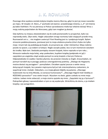 Pewnego dnia wydana została kolejna książka Joanny Murray, gdyż to jest jej nowe nazwisko po mężu. W inicjale J.K. litera „J” pochodzi od Joanna- prawdziwego imienia, a „K” od imienia jej babci Kathleen. Po raz pierwszy w Polsce sprzedawana miała być właśnie dzisiaj! Wraz z moją rodziną pojechałam do Warszawy, gdyż tam mogłam ją dostać. Gdy byliśmy na miejscu dowiedziałam się ile osób postanowiło tu przyjechać, było nas naprawdę wielu. Zbyt wielu. Nagle usłyszałam strzęp rozmowy ludzi stojących przede mną. Rozmawiali oni o…. nie mogłam uwierzyć! Pani Rowling jest tu i podpisuje książki. Byłam strasznie podekscytowana, ponieważ jest to moja ulubiona pisarka (choć chyba nie tylko moja- innym tak się podobają jej książki, że przyznano jej order Uśmiechu). Moja rodzina poszła na spacer, a ja stałam w kolejce. Nagle zaczęło padać, lecz w tym momencie weszłam do środka. Była tam. Siedziała pomiędzy stosami książek, które napisała w tym roku… Wreszcie nadeszła moja kolej, więc podeszłam, kupiłam książkę (podpisała mi ją!) i zapytałam po angielsku skąd wzięła pomysł na serię książek o Harrym Potterze. Odpowiedziała mi szybko i bardzo płynnie, bo przecież mieszka w Anglii. Zrozumiałam, że pomysł narodził się w pociągu podczas czterogodzinnej podróży. „Dlatego do Hogwartu można dostać się pociągiem”- pomyślałam. Chciałam spytać jeszcze o wiele rzeczy dotyczących książek, lecz pewien mężczyzna był już tak zniecierpliwiony czekaniem, że wypchnął mnie z kolejki. Odeszłam, a w mojej głowie kłębiły się pytania: „Dlaczego Szalonooki ma na imię Moody, co oznacza humorzasty?”, „Dlaczego Hagrid miał różdżkę w RÓŻOWEJ parasolce?” oraz wiele innych. Wyszłam na dwór, gdzie czekała na mnie moja rodzina. Ledwo mnie zobaczyli, a moja siostra spytała się mnie: „Zapytałaś się ją o Syriusza?”. Pokręciłam głową i opowiedziałam o tym co się wydarzyło. Wróciliśmy do domu, a ja miałam książkę z jej autografem.