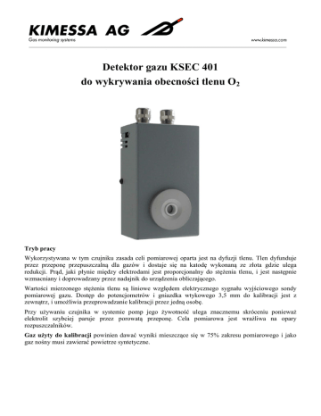 Detektor gazu KSEC 401 do wykrywania obecności tlenu O2 Tryb pracy Wykorzystywana w tym czujniku zasada celi pomiarowej oparta jest na dyfuzji tlenu. Tlen dyfunduje przez przeponę przepuszczalną dla gazów i dostaje się na katodę wykonaną ze złota gdzie ulega redukcji. Prąd, jaki płynie między elektrodami jest proporcjonalny do stężenia tlenu, i jest następnie wzmacniany i doprowadzany przez nadajnik do urządzenia obliczającego. Wartości mierzonego stężenia tlenu są liniowe względem elektrycznego sygnału wyjściowego sondy pomiarowej gazu. Dostęp do potencjometrów i gniazdka wtykowego 3,5 mm do kalibracji jest z zewnątrz, i umożliwia przeprowadzanie kalibracji przez jedną osobę. Przy używaniu czujnika w systemie pomp jego żywotność ulega znacznemu skróceniu ponieważ elektrolit szybciej paruje przez porowatą przeponę. Cela pomiarowa jest wrażliwa na opary rozpuszczalników. Gaz użyty do kalibracji powinien dawać wyniki mieszczące się w 75% zakresu pomiarowego i jako gaz nośny musi zawierać powietrze syntetyczne. Czułość krzyżowa Parametry pracy Czułość Zakres pomiarowy Stężenie gazu testowego co najmniej 0,5 % (obj.) Gaz testowy maks. 25 % (obj.) / liniowo Amoniak NH3 Czas odpowiedzi t 95 < 10 s Chlor Cl2 -20 °C ... +45°C Etylen C2H4 Temperatura pracy Wyświetlanie na czujniku O2 100 ppm 0 ppm … ppm … ppm … ppm … ppm Uruchamianie po przywróceniu. do stanu użytkowego maksymalnie 1 godz. Dwutlenek węgla CO2 Tlenek węgla CO 5000 ppm 250 ppm 0 ppm 0 ppm Zakres ciśnień atmosferyczne 10% Propan C3H8 5000 ppm 0 ppm … ppm … ppm 100 ppm < 1 ppm 20 ppm < 1 ppm 48 ppm 100 ppm < 1 ppm 0 ppm Wilgotność powietrza 0 … 99 %, bez kondensacji Dwutlenek SO2 Zależność czułości od pozycji brak Siarkowodór H2S Długookresowy dryft sygnału Żywotność przy 200 C siarki < 5 % / rok Dwutlenek NO2 azotu co najmniej rok, do 2 lat - Tlenek azotu NO zależnie od zastosowania Wodór H2 6 miesięcy Okres gwarancyjny Parametry elektroniczne czujnika Kabel: Zasilanie: Prąd czujnika: Sygnał wyjściowy: Temperatura pracy: 4-żyłowy, ekranowany 16,5 … 30 VDC maks. 60 mA cyfrowy bus-sygnał -40 °C ... +85 °C Kontrola (prace obsługi i utrzymania) Czujnik i układ elektroniki wymagają okresowego sprawdzania. Zaleca się rutynowe przeprowadzane kalibracji raz lub dwa razy w roku. Elektronika Wymiary Gniazdo jack 3.5 mm 0,02-2,5 VDC Potencjometr wzmocnienia Parametry i wykonanie mogą ulec zmianie bez uprzedniego powiadomienia Przedstawiciel w Polsce 84-200 Wejherowo, ul. Kościuszki 6 tel. +48 58 679 40 57, fax. +48 58 600 83 69 www.mechvent.pl [email protected]