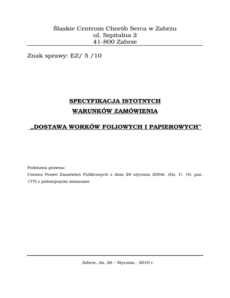 Śląskie Centrum Chorób Serca w Zabrzu ul. Szpitalna 2 41-800 Zabrze Znak sprawy: EZ/ 5 /10 SPECYFIKACJA ISTOTNYCH WARUNKÓW ZAMÓWIENIA „DOSTAWA WORKÓW FOLIOWYCH I PAPIEROWYCH” Podstawa prawna: Ustawa Prawo Zamówień Publicznych z dnia 29 stycznia 2004r. (Dz. U. 19, poz. 177) z późniejszymi zmianami Zabrze, dn. 26 – Stycznia - 2010 r. Śląskie Centrum Chorób Serca w Zabrzu ul. Szpitalna 2 41-800 Zabrze SPECYFIKACJA ISTOTNYCH WARUNKÓW ZAMÓWIENIA Przetarg nieograniczony na „DOSTAWA WORKÓW FOLIOWYCH I PAPIEROWYCH” Spis treści : Rozdział 1 Zamawiający Rozdział 2 Opis przedmiotu Zamówienia Rozdział 3 Opis sposobu przygotowania oferty Rozdział 4 Opis sposobu obliczania ceny oferty Rozdział 5 Wymagania Zamawiającego Rozdział 6 Dokumenty wymagane od Wykonawców Rozdział 7 Kryteria oceny Rozdział 8 Termin realizacji zamówienia Rozdział 9 Składanie ofert Rozdział 10 Tryb udzielania wyjaśnień Rozdział 11 Termin związania ofertą Rozdział 12 Otwarcie ofert Rozdział 13 Osoby upoważnione do kontaktów z Wykonawcami Rozdział 14 Zagadnienia dotyczące umowy Rozdział 15 Środki odwoławcze Załączniki ( 1 – 6) - załącznik nr 1 formularz oferty - załącznik nr 2 oświadczenie zgodne z wymogami art. 22 ( część I i II ) ustawy pzp - załącznik nr 3 oświadczenie zgodne z wymogami art. 24 ustawy pzp - załącznik nr 4 projekt umowy - załącznik nr 5 Pakiet 2 I. ZAMAWIAJĄCY Śląskie Centrum Chorób Serca w Zabrzu ul. Szpitalna 2, 41-800 Zabrze Tel. / Fax . 032/ 373-36-68 Strona internetowa : www.sccs.pl Adres e-mail do kontaktów z Zamawiającym : [email protected] II. OPIS PRZEDMIOTU ZAMÓWIENIA Dostawę worków foliowych i papierowych zawartych w pakietach – Pakiet nr 1 (zał. nr 5). CPV 33.77.10.00-5 1. Zamawiający wyklucza możliwość składania ofert wariantowych III. 1. OPIS SPOSOBU PRZYGOTOWANIA OFERTY Aby oferta mogła brać udział w ocenie powinna spełniać wymogi Ustawy Prawo Zamówień Publicznych i niniejszej specyfikacji. 2. Oferta składana przez Wykonawcę winna być sporządzona w języku polskim. 3. Ofertę stanowią załączniki : nr 1 , nr 3 , nr 5 oraz inne oświadczenia woli podpisane przez Wykonawcę. 4. W załączniku nr 2 – oświadczenie art.22 Wykonawca może polegać na własnej wiedzy, doświadczeniu, potencjale technicznym, osobach zdolnych do wykonania zamówienia i zdolnościach finansowych może też polegać na wiedzy i doświadczeniu, potencjale technicznym, osobach zdolnych do wykonania zamówienia lub zdolnościach finansowych innych podmiotów, niezależnie od charakteru prawnego łączących go z nimi stosunków. Wykonawca w takiej sytuacji zobowiązany jest udowodnić Zamawiającemu, iż będzie dysponował zasobami niezbędnymi do realizacji zamówienia, w szczególności przedstawiając w tym celu pisemne zobowiązanie tych podmiotów do oddania mu do dyspozycji niezbędnych zasobów na okres korzystania z nich przy wykonaniu zamówienia. 5. Wykonawca winien spełniać wszystkie warunki wymagane w punkcie V. 3 6. Oferta winna być podpisana przez osobę upełnomocnioną do reprezentowania firmy, co musi wynikać z załączonych do oferty dokumentów. 7. Wszystkie kartki Oferty winny być połączone w sposób trwały uniemożliwiający ich wysunięcie się ,ponumerowane, a każda kartka podpisana /zgodnie z pkt.6/. 8. Wszelkie poprawki lub zmiany w ofercie winny być podpisane własnoręcznie przez osobę podpisującą Ofertę /zgodnie z pkt.6/. 9. Zamawiający poprawia oczywiste omyłki rachunkowe, z uwzględnieniem konsekwencji rachunkowych dokonanych poprawek . Przez oczywiste omyłki rachunkowe Zamawiający rozumie - wadliwy wynik działania arytmetycznego przy założeniu, że właściwie podana jest liczba jednostek miar i cena jednostkowa netto. 10. Jeżeli cena oferty lub części zamówienia (pakiet) podano rozbieżnie słownie i liczbą lub podano różne ceny w różnych częściach oferty, przyjmuje się, że prawidłowo podano ten zapis, który odpowiada dokonanemu obliczeniu ceny. 11. Każdy Wykonawca może złożyć tylko jedną ofertę . 12. Wykonawca nie może złożyć kilku alternatywnych Ofert . 13. Nie dopuszcza się składania Ofert wariantowych. 14. Ofertę należy umieścić w kopercie zamkniętej w sposób gwarantujący zachowanie w poufności jej treści. 15. Koperta ma być zaadresowana na : ŚLĄSKIE CENTRUM CHORÓB SERCA Ul. Szpitalna 2 41-800 Zabrze oraz oznaczona napis PRZETARG NIEOGRANICZONY NA „DOSTAWA WORKÓW FOLIOWYCH I PAPIEROWYCH” 16. Koperta musi być również opisana nazwą i adresem Wykonawcy. 17. Zamawiający odrzuca ofertę, jeżeli: 1) jest niezgodna z ustawą; 4 2) jej treść nie odpowiada treści Specyfikacji Istotnych Warunków Zamówienia (z zastrzeżeniem art. 87 ust.2 pkt3 Ustawy Prawo Zamówień Publicznych) ; 3) jej złożenie stanowi czyn nieuczciwej konkurencji w rozumieniu przepisów o zwalczaniu nieuczciwej konkurencji; 4) zawiera rażąco niską cenę w stosunku do przedmiotu zamówienia; 5) została złożona przez wykonawcę wykluczonego z udziału w postępowaniu o udzielenie zamówienia lub nie zaproszonego do składania ofert; 6) zawiera błędy w obliczeniu ceny; 7) Wykonawca w terminie 3 dni od dnia otrzymania zawiadomienia nie zgodził się na poprawienie omyłki o której mowa w art. 87 ust. 2 pkt. 3 Ustawy Prawo Zamówień Publicznych; 8) jest nieważna na podstawie odrębnych przepisów. 9) Wykonawca nie złożył wyjaśnień wraz z dowodami, że oferta nie zawiera rażąco niskiej ceny, 18. Z postępowania o udzielenie zamówienia wyklucza się: 1) Wykonawców, którzy wyrządzili szkodę, nie wykonując zamówienia lub wykonując je nienależycie, jeżeli szkoda ta została stwierdzona orzeczeniem sądu, które uprawomocniło się w okresie 3 lat przed wszczęciem postępowania; 2) Wykonawców, w stosunku do których otwarto likwidację, lub których upadłość ogłoszono, z wyjątkiem Wykonawców, którzy po ogłoszeniu upadło