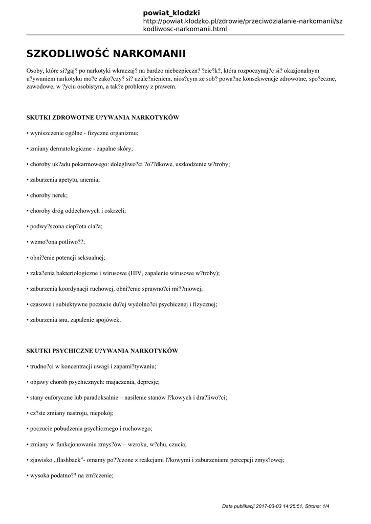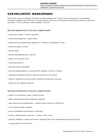 powiat_klodzki http://powiat.klodzko.pl/zdrowie/przeciwdzialanie-narkomanii/sz kodliwosc-narkomanii.html SZKODLIWOŚĆ NARKOMANII Osoby, które si?gaj? po narkotyki wkraczaj? na bardzo niebezpieczn? ?cie?k?, która rozpoczynaj?c si? okazjonalnym u?ywaniem narkotyku mo?e zako?czy? si? uzale?nieniem, nios?cym ze sob? powa?ne konsekwencje zdrowotne, spo?eczne, zawodowe, w ?yciu osobistym, a tak?e problemy z prawem. SKUTKI ZDROWOTNE U?YWANIA NARKOTYKÓW • wyniszczenie ogólne - fizyczne organizmu; • zmiany dermatologiczne - zapalne skóry; • choroby uk?adu pokarmowego: dolegliwo?ci ?o??dkowe, uszkodzenie w?troby; • zaburzenia apetytu, anemia; • choroby nerek; • choroby dróg oddechowych i oskrzeli; • podwy?szona ciep?ota cia?a; • wzmo?ona potliwo??; • obni?enie potencji seksualnej; • zaka?enia bakteriologiczne i wirusowe (HIV, zapalenie wirusowe w?troby); • zaburzenia koordynacji ruchowej, obni?enie sprawno?ci mi??niowej; • czasowe i subiektywne poczucie du?ej wydolno?ci psychicznej i fizycznej; • zaburzenia snu, zapalenie spojówek. SKUTKI PSYCHICZNE U?YWANIA NARKOTYKÓW • trudno?ci w koncentracji uwagi i zapami?tywaniu; • objawy chorób psychicznych: majaczenia, depresje; • stany euforyczne lub paradoksalnie – nasilenie stanów l?kowych i dra?liwo?ci; • cz?ste zmiany nastroju, niepokój; • poczucie pobudzenia psychicznego i ruchowego; • zmiany w funkcjonowaniu zmys?ów – wzroku, w?chu, czucia; • zjawisko „flashback”- omamy po??czone z reakcjami l?kowymi i zaburzeniami percepcji zmys?owej; • wysoka podatno?? na zm?czenie; Data publikacji 2017-03-03 14:25:51, Strona: 1/4 powiat_klodzki http://powiat.klodzko.pl/zdrowie/przeciwdzialanie-narkomanii/sz kodliwosc-narkomanii.html • brak motywacji do dzia?ania, os?abienie zdolno?ci twórczych, • obni?enie zdolno?ci planowania i osi?gania wytyczonych celów, • zmiany w poczuciu czasu. SKUTKI SPO?ECZNE I PRAWNE U?YWANIA NARKOTYKÓW • ?amanie norm spo?ecznych i moralnych; • tendencje do rezygnacji z celów ?yciowych; • ograniczenie zainteresowa?; • tendencje do izolacji spo?ecznej, l?kowe nastawienie do ludzi, labilno?? emocjonalna; • niezdolno?? do nawi?zywania d?ugotrwa?ych zwi?zków; • pogorszenie jako?ci wykonywanej pracy; • tendencje do utraty poczucia to?samo?ci; • tendencje do zachowa? aspo?ecznych; • zaburzenia w procesie rozwoju i dorastania; • sk?onno?? do ?amania prawa • wypadki komunikacyjne . ?ród?o: (http://ms.gov.pl/pl , http://www.szczecin.kwp.gov.pl) Aktualne dane teleadresowe placówek na terenie powiatu k?odzkiego zajmuj?cych si? pomoc? dla osób u?ywaj?cych lub ju? uzale?nionych od ?rodków odurzaj?cych, znajduj? si? pod adresem: Poradnia Odwykowa ul. Zawiszy Czarnego 2 57-300 K?odzko Poradnia Terapii Uzale?nienia i Wspó?uzale?nienia od Alkoholu ul. Wojska Polskiego 23 57-340 Duszniki Zdrój www.czarnybor.rubikon.pl Data publikacji 2017-03-03 14:25:51, Strona: 2/4 powiat_klodzki http://powiat.klodzko.pl/zdrowie/przeciwdzialanie-narkomanii/sz kodliwosc-narkomanii.html Poradnia Terapii Uzale?nienia i Wspó?uzale?nienia od Alkoholu ul. Szpitalna 2 57-400 Nowa Ruda Miejska Komisja Rozwi?zywania Problemów Alkoholowych Urz?d Miasta K?odzko pl. Boles?awa Chrobrego 1 57-300 K?odzko Gminna Komisja Rozwi?zywania Problemów Alkoholowych Urz?d Gminy K?odzko ul. Stefana Okrzei 8a 57-300 K?odzko Powiatowe Centrum Pomocy Rodzinie ul. Ko?ciuszki 2 57-300 K?odzko O?rodek Interwencji Kryzysowej ul. Grottgera 8 57-300 K?odzko Pliki do pobrania: Poradnik "Bli?ej siebie - dalej od narkotyków" Data publikacji 2017-03-03 14:25:51, Strona: 3/4 powiat_klodzki http://powiat.klodzko.pl/zdrowie/przeciwdzialanie-narkomanii/sz kodliwosc-narkomanii.html Data publikacji 2017-03-03 14:25:51, Strona: 4/4