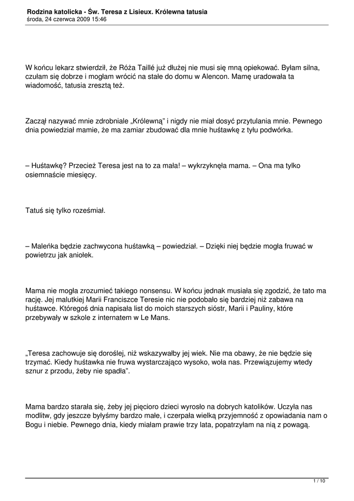Rodzina katolicka - Św. Teresa z Lisieux. Królewna tatusia środa, 24 czerwca 2009 15:46 W końcu lekarz stwierdził, że Róża Taillé już dłużej nie musi się mną opiekować. Byłam silna, czułam się dobrze i mogłam wrócić na stałe do domu w Alencon. Mamę uradowała ta wiadomość, tatusia zresztą też. Zaczął nazywać mnie zdrobniale „Królewną” i nigdy nie miał dosyć przytulania mnie. Pewnego dnia powiedział mamie, że ma zamiar zbudować dla mnie huśtawkę z tyłu podwórka. – Huśtawkę? Przecież Teresa jest na to za mała! – wykrzyknęła mama. – Ona ma tylko osiemnaście miesięcy. Tatuś się tylko roześmiał. – Maleńka będzie zachwycona huśtawką – powiedział. – Dzięki niej będzie mogła fruwać w powietrzu jak aniołek. Mama nie mogła zrozumieć takiego nonsensu. W końcu jednak musiała się zgodzić, że tato ma rację. Jej malutkiej Marii Franciszce Teresie nic nie podobało się bardziej niż zabawa na huśtawce. Któregoś dnia napisała list do moich starszych sióstr, Marii i Pauliny, które przebywały w szkole z internatem w Le Mans. „Teresa zachowuje się doroślej, niż wskazywałby jej wiek. Nie ma obawy, że nie będzie się trzymać. Kiedy huśtawka nie fruwa wystarczająco wysoko, woła nas. Przewiązujemy wtedy sznur z przodu, żeby nie spadła”. Mama bardzo starała się, żeby jej pięcioro dzieci wyrosło na dobrych katolików. Uczyła nas modlitw, gdy jeszcze byłyśmy bardzo małe, i czerpała wielką przyjemność z opowiadania nam o Bogu i niebie. Pewnego dnia, kiedy miałam prawie trzy lata, popatrzyłam na nią z powagą. 1 / 10 Rodzina katolicka - Św. Teresa z Lisieux. Królewna tatusia środa, 24 czerwca 2009 15:46 – Mamo, chcę, żebyś umarła. I tatuś też. Wstrząśnięta i zdumiona mama wpatrywała się we mnie przez chwilę. – Jak można w ogóle coś takiego powiedzieć, Tereso! Czy mnie nie kochasz? Nie kochasz swojego dobrego ojca, który robi dla ciebie tak wiele miłych rzeczy? Kiwnęłam głową. – Kocham, ale chcę, żebyście poszli do nieba. Ludzie muszą najpierw umrzeć, żeby tam się dostać. Tatuś był bardzo rozbawiony moją uwagą. – Teresa będzie mądrą dziewczynką, kiedy dorośnie – powiedział. – Będzie też ładna. Prawda, królewno? Mama pokręciła głową. – Rozpuścisz to dziecko, jeśli nie będziesz uważał – ostrzegała. – Jest w niej mnóstwo pychy. – Pychy? W tym dzieciaczku? – Owszem. Tereso, powiedz tatusiowi, co kiedyś mi oznajmiłaś, gdy zaproponowałam ci grosik. 2 / 10 Rodzina katolicka - Św. Teresa z Lisieux. Królewna tatusia środa, 24 czerwca 2009 15:46 Wdrapałam się ojcu na kolana. – Mama powiedziała, że dostanę grosik, jeśli pocałuję ziemię – wyjaśniłam. – A mnie aż tak bardzo nie zależało na tym grosiku, tatusiu. Za nic nie pocałowałabym ziemi! Na te słowa tatuś wybuchnął serdecznym śmiechem. – Teraz wiem, dlaczego nazywam cię moją królewną – powiedział. – Zachowujesz się dokładnie tak, jakbyś nią rzeczywiście była. I za to właśnie cię kocham. Przed ślubem mama nauczyła się dziergać piękne koronki. Wciąż była zajęta tą pracą i zatrudniała do pomocy kilka kobiet. Pracowały w swoich domach i w regularnych odstępach czasu dostarczały gotowe fragmenty. Mama składała kawałki w urocze wzory. Wielu ludzi sądziło, że nie znajdzie się nigdzie na świecie lepszej koronki. Mama otrzymywała tak wiele zamówień, że w końcu tatuś postanowił zrezygnować z pracy zegarmistrza i jubilera. Pomagał mamie w zakładzie koronkarskim, który codziennie coraz bardziej rozkwitał. Wkrótce mięliśmy w banku sporo pieniędzy. Byliśmy z tego zadowoleni, gdyż mogliśmy na wiele sposobów pomagać biednym. Równocześnie prowokowało to jednak niektórych ludzi do dziwnych rozważań. – Ludwik Martin staje się ważnym człowiekiem – mawiali. – Prawdopodobnie jego córki będą mogły wejść do wyższych sfer, gdy dorosną. – Tak – brzmiała odpowiedź. – To są ładne dziewczyny. Znalezienie dobrych mężów nie sprawi im żadnego kłopotu. Niestety! Ludzie ci nie mieli pojęcia o tym, że Bóg przewiduje dla nas, dzieci, różne koleje losu. Nie wiedzieli, że Paulina już rozważa przywdzianie habitu. Że ja, tak bardzo kochając starszą siostrę, również postanowiłam zostać zakonnicą. Oczywiście nie rozumiałam, co to naprawdę znaczy. Mimo wszystko czułam, że w moim przypadku wszystko było możliwe. Czyż nie byłam królewną tatusia? Oczywiście, że tak! 3 / 10 Rodzina katolicka - Św. Teresa z Lisieux. Królewna tatusia środa, 24 czerwca 2009 15:46 Czas mijał. Maria zakończyła naukę w klasztorze wizytek w Le Mans i wróciła do domu. Miała piętnaście lat. Zapadła decyzja, że może uczyć Celinę czytania i pisania. Celina miała sześć lat i była moją ulubioną towarzyszką zabaw. Nigdy się nie rozstawałyśmy. Teraz jednak zabierano ją na lekcje, a ja za każdym razem musiałam całymi godzinami przebywać w samotności. To prawie złamało mi serce. – Proszę, pozwól mi też chodzić na lekcje! – błagałam mamę. – Pozwól mi siedzieć w pokoju, kiedy Maria uczy Celinę. Mama sądziła, że jestem jeszcze za mała. Tłumaczyła mi, że czytanie i pisanie to nie są odpowiednie zajęcia dla trzyletnich dziewczynek. Na widok moich łez tatuś zarządził, że mogę przebywać w pokoju, pod warunkiem, że będę zachowywać się cicho i nie będę przeszkadzać siostrom. Żarliwie złożyłam obietnicę, a moja miłość do taty osiągnęła nowy wymiar. Był taki dobry! Uczyniłby wszystko, żeby uszczęśliwić swoją królewnę! Maria nie była zbytnio zadowolona, kiedy dowiedziała się, że mogę być obecna w czasie lekcji Celiny. Czasami zamykała drzwi swojego pokoju, wiedząc że jestem za mała, by je otworzyć, i że moja duma nigdy nie pozwoli mi na to, żeby kogoś poprosić o pomoc. Jednak wcale mnie to n
