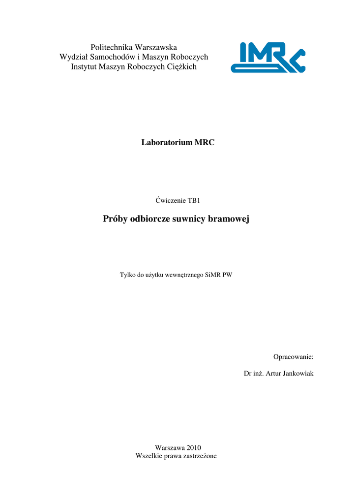 Politechnika Warszawska Wydział Samochodów i Maszyn Roboczych Instytut Maszyn Roboczych Ciężkich Laboratorium MRC Ćwiczenie TB1 Próby odbiorcze suwnicy bramowej Tylko do użytku wewnętrznego SiMR PW Opracowanie: Dr inż. Artur Jankowiak Warszawa 2010 Wszelkie prawa zastrzeżone 1. CEL ĆWICZENIA Zasadniczym celem ćwiczenia jest zapoznanie studentów z zagadnieniami związanymi z dozorem technicznym oraz aspektami technicznymi przeprowadzania prób odbiorczych urządzeń dźwignicowych (na przykładzie suwnicy). Znaczącą część wykonywanych w rzeczywistych badaniach odbiorczych prób studenci wykonają w ramach ćwiczenia. Ponadto studenci zapoznają się z ogólnymi zasadami przeprowadzania badań okresowych i przeglądów konserwacyjnych urządzeń podlegających dozorowi technicznemu. 2. WPROWADZENIE Zgodnie z Ustawą o dozorze technicznym [1] środki transportu bliskiego (w tym suwnice) podlegają nadzorowi Urzędu Dozoru Technicznego. Szczegółowy spis tych urządzeń zawarto w Rozporządzeniu Rady Ministrów w sprawie rodzajów urządzeń technicznych podlegających dozorowi technicznemu [2]. W grupie dźwignic są to między innymi: - wciągarki i wciągniki - suwnice - żurawie - układnice - dźwigniki W Rozporządzeniu Ministra Gospodarki, Pracy i Polityki Społecznej z dnia 29 października 2003 roku [3] przedstawiono natomiast warunki techniczne dozoru technicznego w zakresie eksploatacji niektórych urządzeń transportu bliskiego. Przedstawiono tam ogólny zakres badania odbiorczego, w skład którego wchodzi: • sprawdzenie prawidłowości zainstalowania suwnicy i jego przeznaczenia zgodnie z instrukcją eksploatacji, • przeprowadzenie prób funkcjonowania suwnicy w zainstalowanej wersji z obciążeniem wystarczającym do stwierdzenia, że sterowanie, ruchy robocze, mechanizmy oraz urządzenia zabezpieczające i ochronne działają prawidłowo, • przeprowadzenie prób przeciążeniowych. Badania odbiorcze przeprowadza właściwa jednostka dozoru technicznego po upewnieniu się, że dokumentacja techniczna jest kompletna i odpowiednia dla danego środka transportu bliskiego. Szczegółowe zasady przeprowadzania badań odbiorczych (oraz badań typu, badań okresowych, badań doraźnych) zawarte są w publikacjach UDT („Warunki techniczne dozoru technicznego”) [4]. Wykaz wymagań i badań dotyczących suwnic przedstawiono również w normach przedmiotowych [5], [6]. Poniżej przedstawiono typowy zakres czynności wykonywanych podczas badań odbiorczych dla suwnicy bramowej z wciągnikiem linowym. 2 Urządzenie przedstawione do badań odbiorczych powinno posiadać kompletną i odpowiednią dla danego urządzenia dokumentację techniczną. Powinno być również całkowicie zmontowane, kompletne i sprawne technicznie. Zakres badań: - sprawdzenie działania układów sterowniczych (zgodność dyspozycji z realizacją przez suwnicę, powrót przycisków (dźwigni) sterujących do położenia zerowego po ustaniu wymuszenia), - sprawdzenie działania łączników STOP (umieszczonych na urządzeniach sterujących i konstrukcji nośnej suwnicy) oraz pozostawania w pozycji unieruchamiającej urządzenie, - sprawdzenie działania ograniczników ruchów roboczych (łączniki zwalniające, końcowe) wszystkich mechanizmów. Badanie wykonywane z prędkościami nominalnymi bez obciążenia, - sprawdzenie działania mechanizmów bez obciążenia (dwukrotna próba ruchowa dla każdego z mechanizmów, ocena pracy hamulców, przekładni i innych podzespołów – cichobieżność, brak stuków, zgrzytów i innych niewłaściwych objawów), - sprawdzenie parametrów roboczych w tym prędkości ruchów roboczych (z obciążeniem nominalnym, wszystkie ruchy robocze), - sprawdzenie urządzeń chwytających, układów linowych i ich zamocowań (zgodność z dokumentacją techniczną, ew. ocena zużycia lin stalowych i haków, sprawdzenie zamocowań), - próba statyczna (przeprowadzana z obciążeniem równym 125% nominalnego przy najbardziej niekorzystnym położeniu mechanizmu podnoszenia, czas próby minimum 10 minut - o ile nie jest wymagany dłuższy czas - z obciążeniem podniesionym z podłoża na niewielką wysokość). Sprawdza się brak odkształceń trwałych i powrót mostu suwnicy do stanu przed obciążeniem), - próba dynamiczna (przeprowadzana po pomyślnym wyniku próby statycznej z obciążeniem równym 110% nominalnego z wykonaniem przynajmniej dwóch cykli pracy). - wyrywkowa ocena stanu konstrukcji nośnej suwnicy – w szczególności połączeń spawanych i połączeń rozłącznych (po pomyślnie wykonanych próbach: statycznej i dynamicznej), - sprawdzenie ogranicznika udźwigu (poprzez zwiększanie obciążenia aż do zadziałania ogranicznika: wymagana sygnalizacja przy 90-100% udźwigu nominalnego i zatrzymanie ruchów przy 110-115% udźwigu nominalnego). 3. WYKONANIE ĆWICZENIA W ćwiczeniu zasymulowane będą badania odbiorcze suwnicy bramowej znajdującej się w laboratorium. Poniżej przedstawiono istotne dla przeprowadzenia ćwiczenia parametry suwnicy: Typ suwnicy Udźwig Rozpiętość Wysokość podnoszenia - bramowa, jednodźwigarowa - 2500 [kg] - 4.52 [m] - 6.00 [m] Grupa natężenia pracy: - suwnica - mech. podnoszenia - mech jazdy wciągnika - mech jazdy suwnicy - A4 - M6 - M6 - M4 3 Typ szyny jezdnej Długość toru - profil walcowany, kwadratowy 50x50 [mm] - 12.68 [m] Wciągnik linowy: - prędkość podnoszenia - 6/1 [m/min] - zmiana liczby par biegunów silnika - prędkość jazdy - 5 ÷ 30 [m/min] - przemiennik częstotliwości - system przewijania liny - 4/1 - lina nośna - średnica 7 mm, 8x19W - hamulec podnoszenia - tarczowy (zabudowany w silniku), Współczynnik pewności hamowania ≥ 1.75 Mechanizm jazdy suwnicy: - prędkość jazdy - 5/20 [m/min] - zmiana liczby par biegunów silnika Przebieg ćwiczenia: • przygotowanie stanowiska - przed uruchomieniem suwnicy sprawdzić ogólnie jej stan oraz sprawdzić wizualnie istnienie 