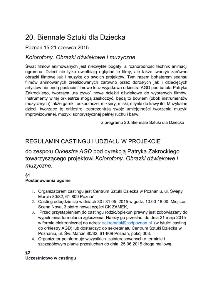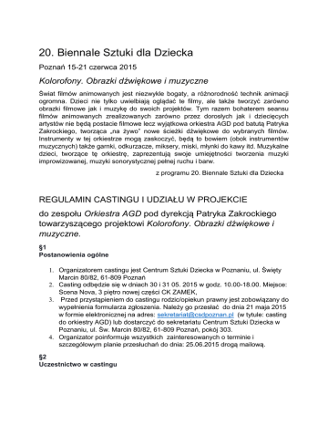 20. Biennale Sztuki dla Dziecka Poznań 15-21 czerwca 2015 Kolorofony. Obrazki dźwiękowe i muzyczne Świat filmów animowanych jest niezwykle bogaty, a różnorodność technik animacji ogromna. Dzieci nie tylko uwielbiają oglądać te filmy, ale także tworzyć zarówno obrazki filmowe jak i muzykę do swoich projektów. Tym razem bohaterem seansu filmów animowanych zrealizowanych zarówno przez dorosłych jak i dziecięcych artystów nie będą postacie filmowe lecz wyjątkowa orkiestra AGD pod batutą Patryka Zakrockiego, tworząca „na żywo” nowe ścieżki dźwiękowe do wybranych filmów. Instrumenty w tej orkiestrze mogą zaskoczyć, będą to bowiem (obok instrumentów muzycznych) także garnki, odkurzacze, miksery, miski, młynki do kawy itd. Muzykalne dzieci, tworzące tę orkiestrę, zaprezentują swoje umiejętności tworzenia muzyki improwizowanej, muzyki sonorystycznej pełnej ruchu i barw. z programu 20. Biennale Sztuki dla Dziecka REGULAMIN CASTINGU I UDZIAŁU W PROJEKCIE do zespołu Orkiestra AGD pod dyrekcją Patryka Zakrockiego towarzyszącego projektowi Kolorofony. Obrazki dźwiękowe i muzyczne. §1 Postanowienia ogólne 1. Organizatorem castingu jest Centrum Sztuki Dziecka w Poznaniu, ul. Święty Marcin 80/82, 61-809 Poznań 2. Casting odbędzie się w dniach 30 i 31 05. 2015 w godz. 10.00-18.00. Miejsce: Scena Nova, 3 piętro nowej części CK ZAMEK, 3. Przed przystąpieniem do castingu rodzic/opiekun prawny jest zobowiązany do wypełnienia formularza zgłoszenia. Należy go przesłać do dnia 21 maja 2015 w formie elektronicznej na adres: [email protected] (w tytule: casting do orkiestry AGD) lub dostarczyć do sekretariatu Centrum Sztuki Dziecka w Poznaniu, ul. Św. Marcin 80/82, 61-809 Poznań, pokój 303. 4. Organizator poinformuje wszystkich zainteresowanych o terminie i szczegółowym planie przesłuchań do dnia: 25.06.2015 drogą mailową. §2 Uczestnictwo w castingu 1. Casting jest przeznaczony dla dzieci w wieku: 8-13 lat grających na instrumentach: skrzypce, wiolonczela, trąbka, klarnet, flet poprzeczny, saksofon, instrumenty perkusyjne 2. Dzieci przynoszą na casting własne instrumenty z wyjątkiem instrumentów perkusyjnych, które zapewni organizator. 3. Dziecko przystępuje do Castingu za zgodą i w obecności Rodzica lub opiekuna prawnego, który dopełni warunków rejestracyjnych i zaakceptuje niniejszy regulamin wraz z planem prób i terminem koncertu. 4. W wyniku castingu wyłoniony zostanie 12 osobowy zespół orkiestrowy. 5. Organizator poinformuje o wynikach castingu wyłącznie rodziców/opiekunów prawnych dzieci zakwalifikowanych do zespołu. Informacje o tym zainteresowani otrzymają telefonicznie i mailowo w dniu 1 czerwca 2015. 6. Zgłaszając udział dziecka w Castingu, Rodzic/opiekun prawny wyraża zgodę na nieodpłatne rozpowszechnianie przez Organizatora wizerunku dziecka wyłącznie w celach promocyjnych projektu (foto, wideo). Zgoda obejmuje wykorzystanie, utrwalanie, obróbkę i powielanie zdjęć i materiałów wideo za pośrednictwem dowolnego medium. 7. Organizator nie przewiduje nagród dla dzieci. §3Zasady udziału w projekcie Orkiestra AGD 1. Występ orkiestry AGD odbędzie się 18.06.2015 w Sali Wielkiej CK ZAMEK o godz 11.00 2. Harmonogram prób: 13.06. (sobota), 15.00-18.00, próba 14.06. (niedziela), 10.00-13.00, próba 15.06. (poniedziałek), 16.00-18.00, próba 16.06. (wtorek), 16.00-18.00, próba 17.06. (środa), 16.00-18.00, próba 18.06 (czwartek), 9.00-12.00 (próba i koncert) 3. Organizator zapewni w czasie prób napoje i przekąski dla dzieci. 4. Rodzic/opiekun zobowiązuje się do dowiezienia i odebrania dziecka w wyznaczonych godzinach uzgodnionych z organizatorem